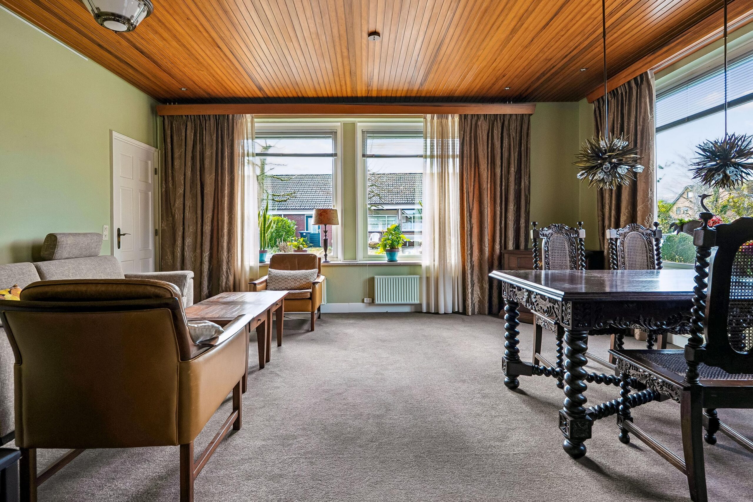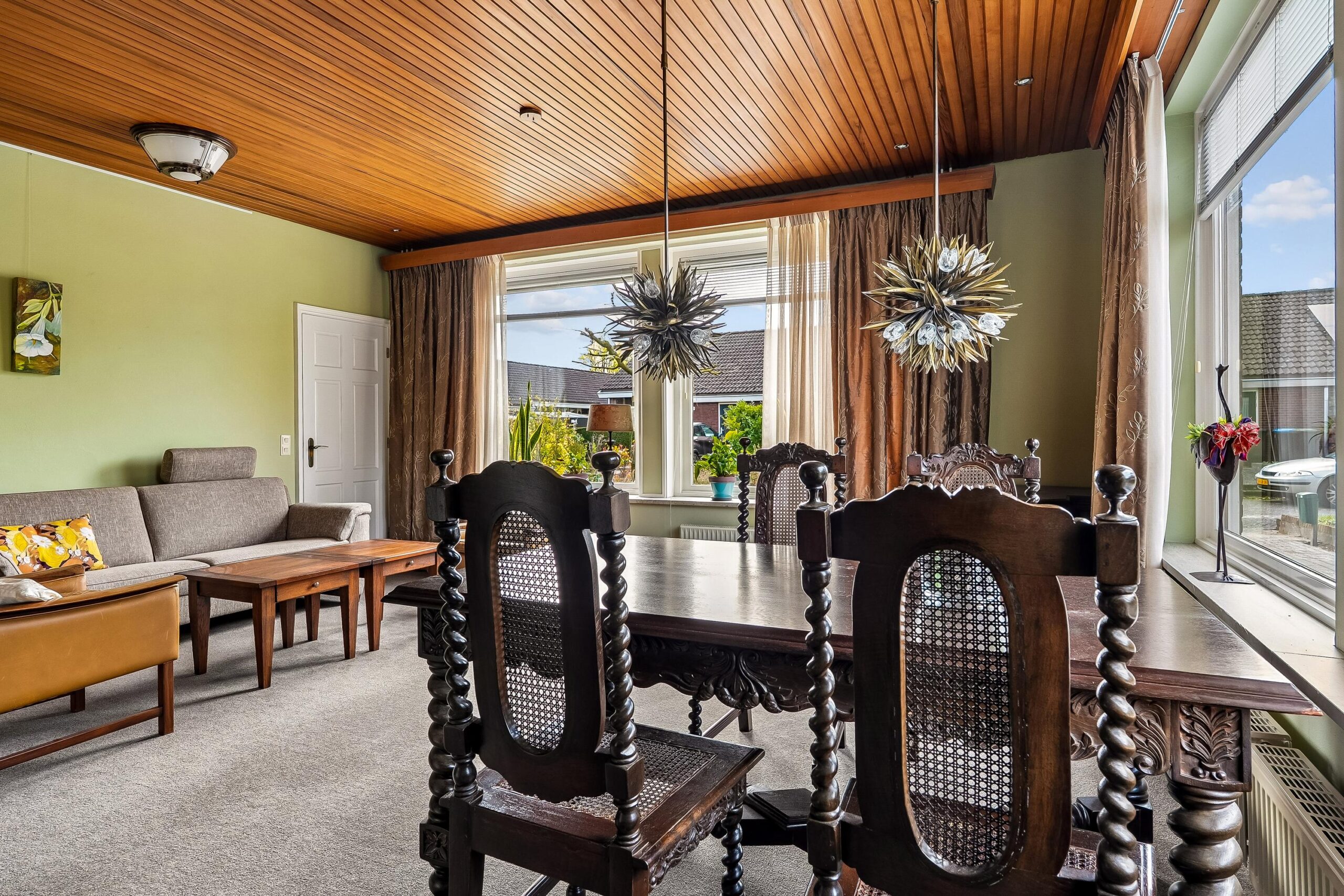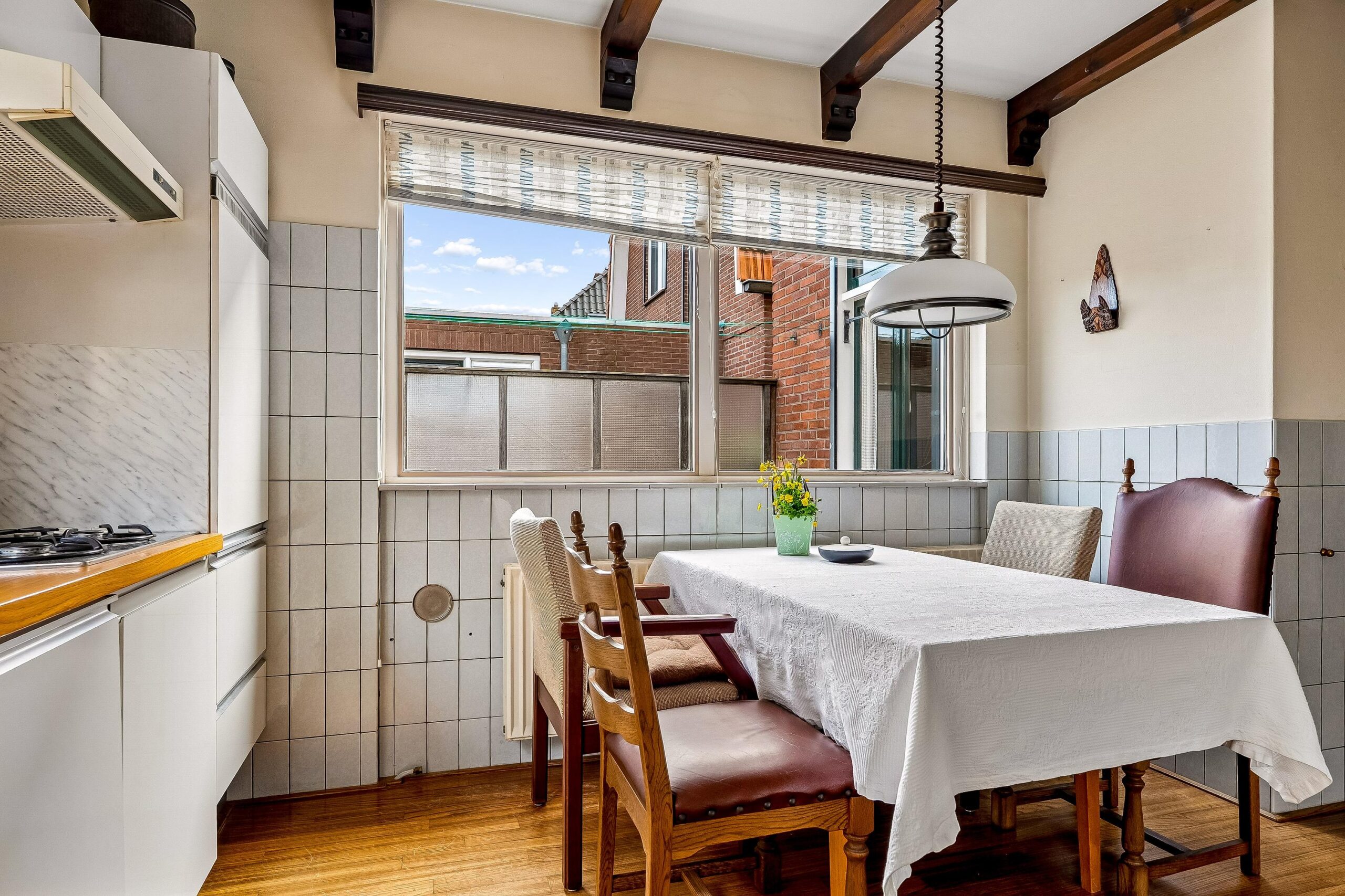 Aan de voorzijde van de woning bevindt zich de woonkamer. Deze lichte ruimte heeft een prettige maatvoering en beschikt over een sfeervol houten plafond, wat bijdraagt aan de karakteristieke uitstraling. De aanwezige ramen zorgen voor een aangename lichtinval en een fijne woonbeleving. Vanuit de woonkamer is er toegang tot een tussenhal met trapopgang naar de eerste verdieping.