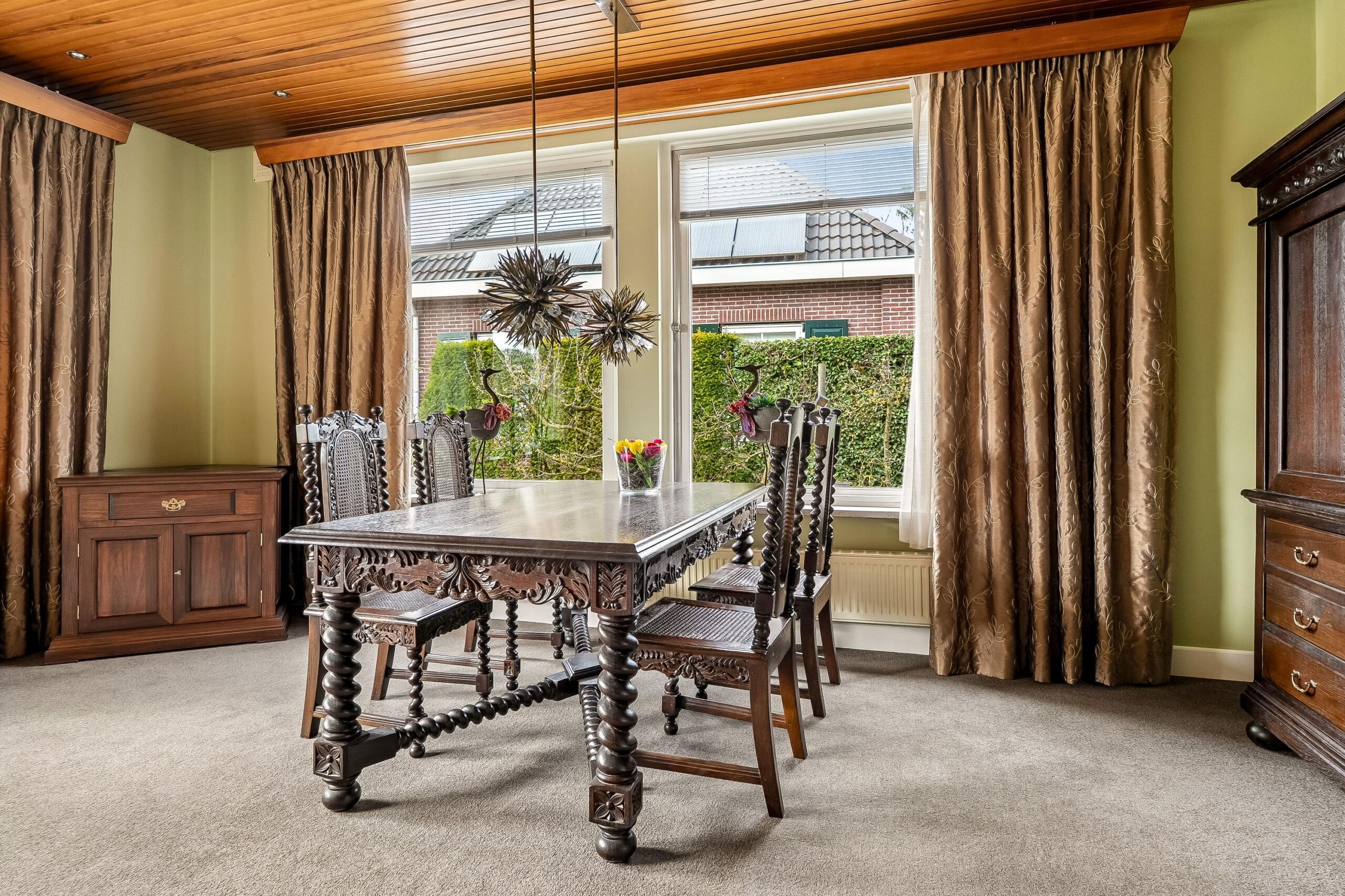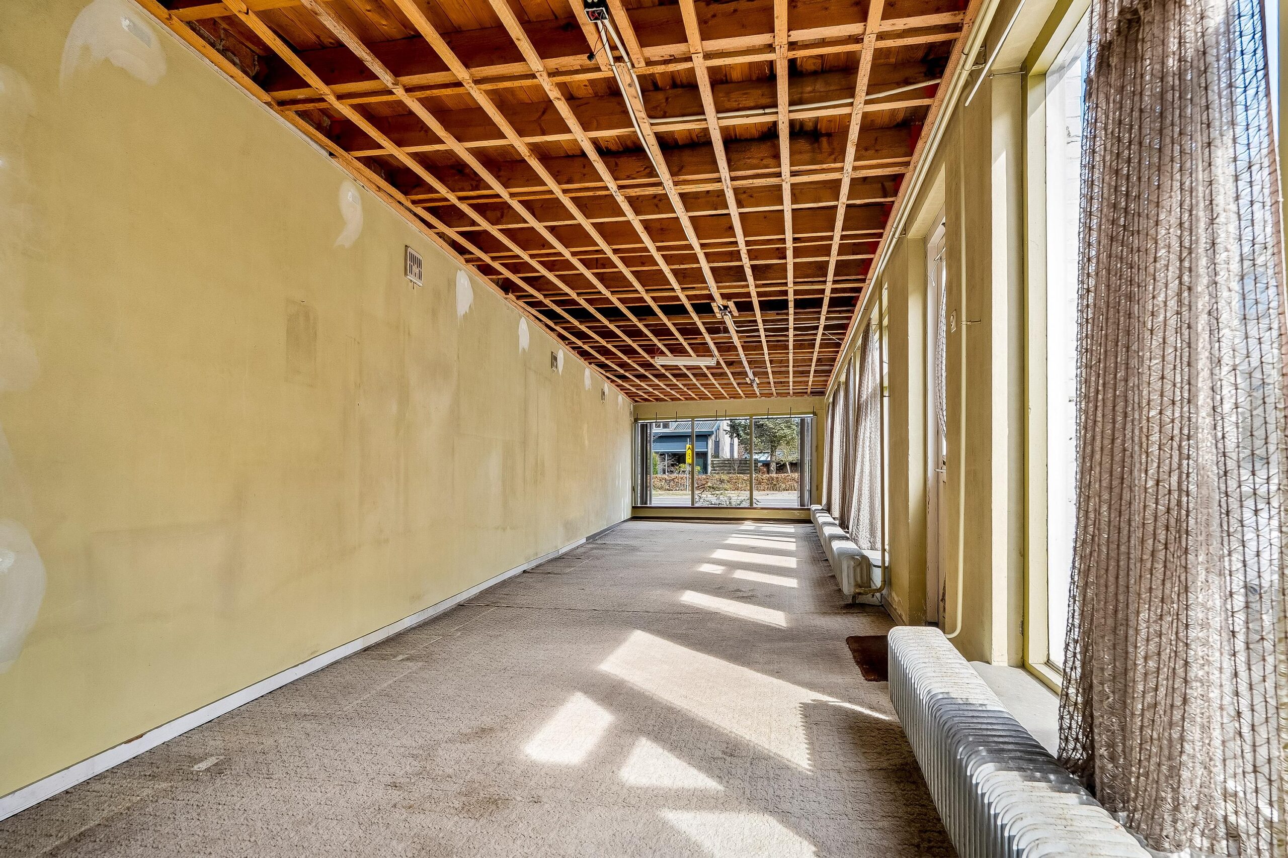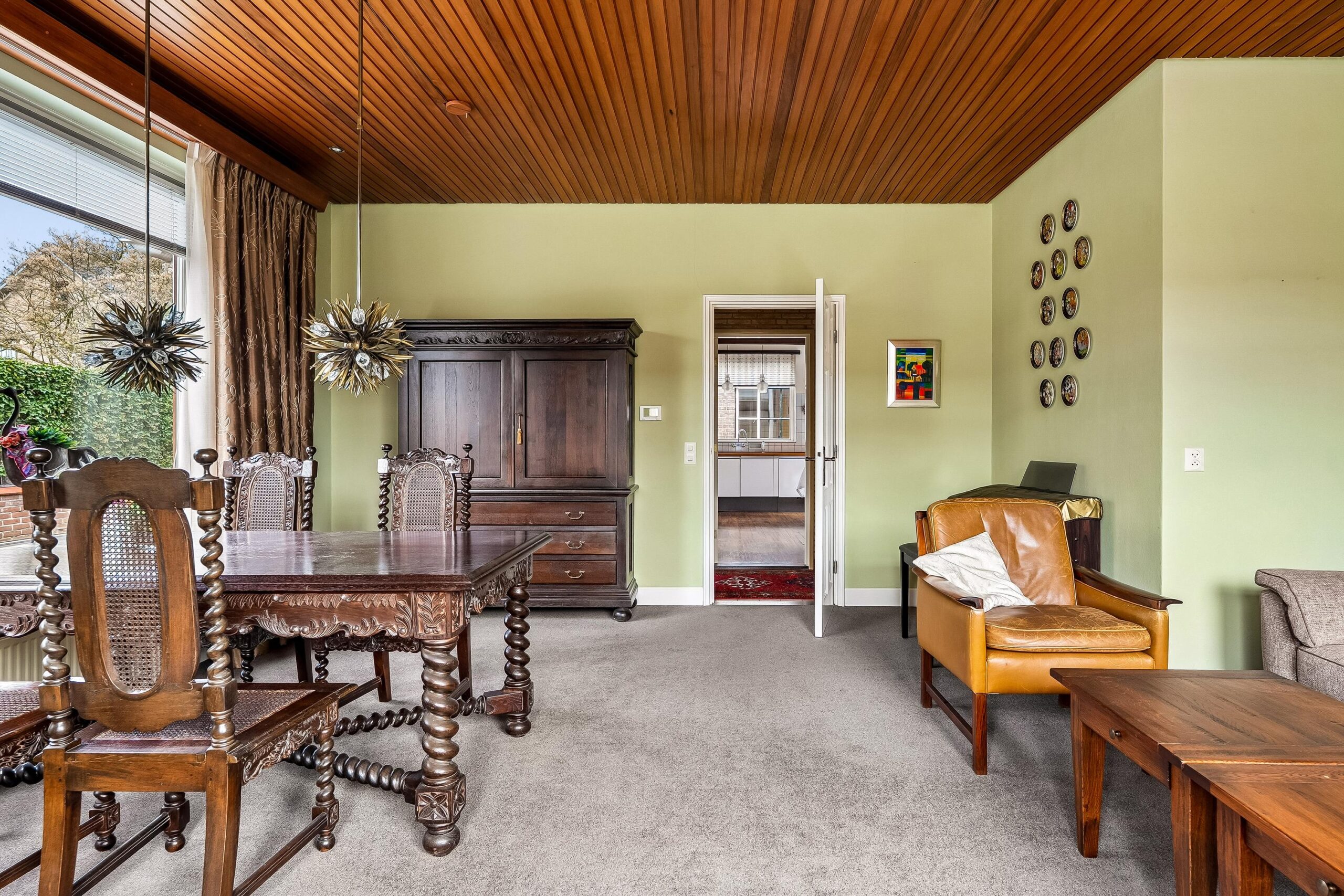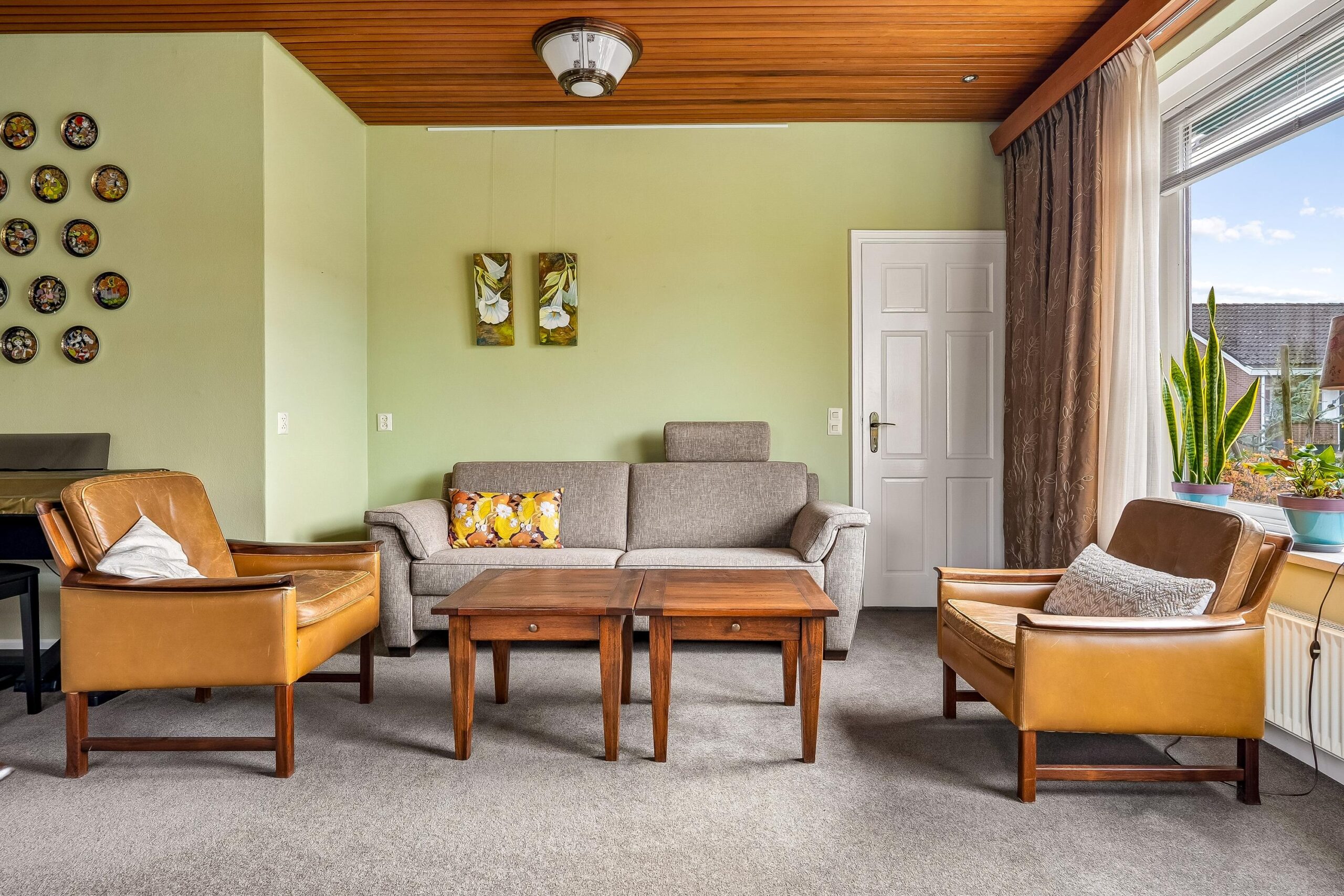 Aan de voorzijde van de woning bevindt zich de woonkamer. Deze lichte ruimte heeft een prettige maatvoering en beschikt over een sfeervol houten plafond, wat bijdraagt aan de karakteristieke uitstraling. De aanwezige ramen zorgen voor een aangename lichtinval en een fijne woonbeleving. Vanuit de woonkamer is er toegang tot een tussenhal met trapopgang naar de eerste verdieping.