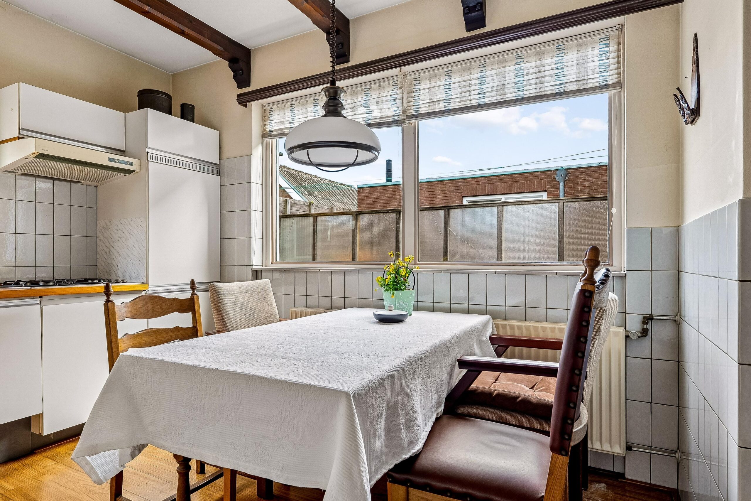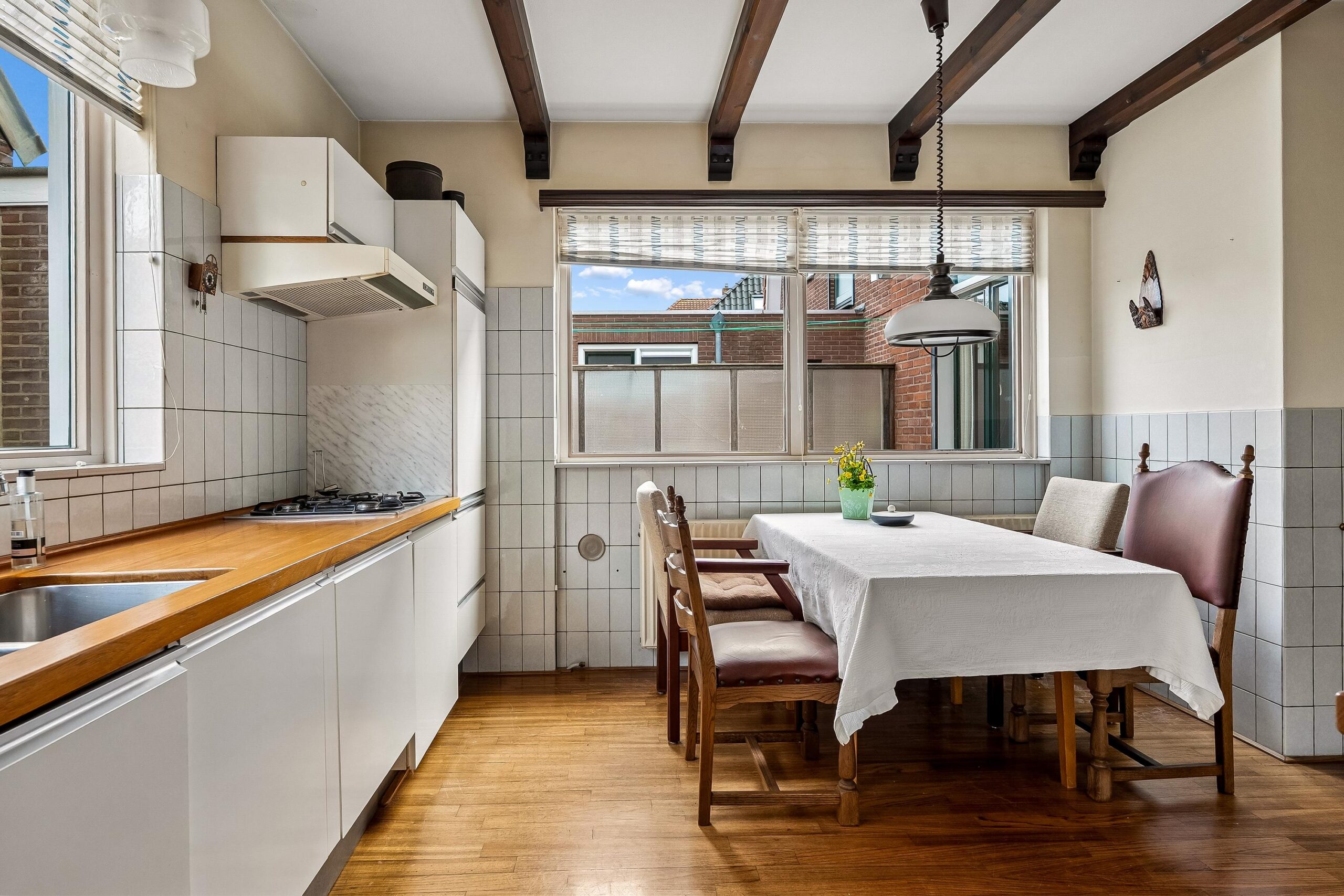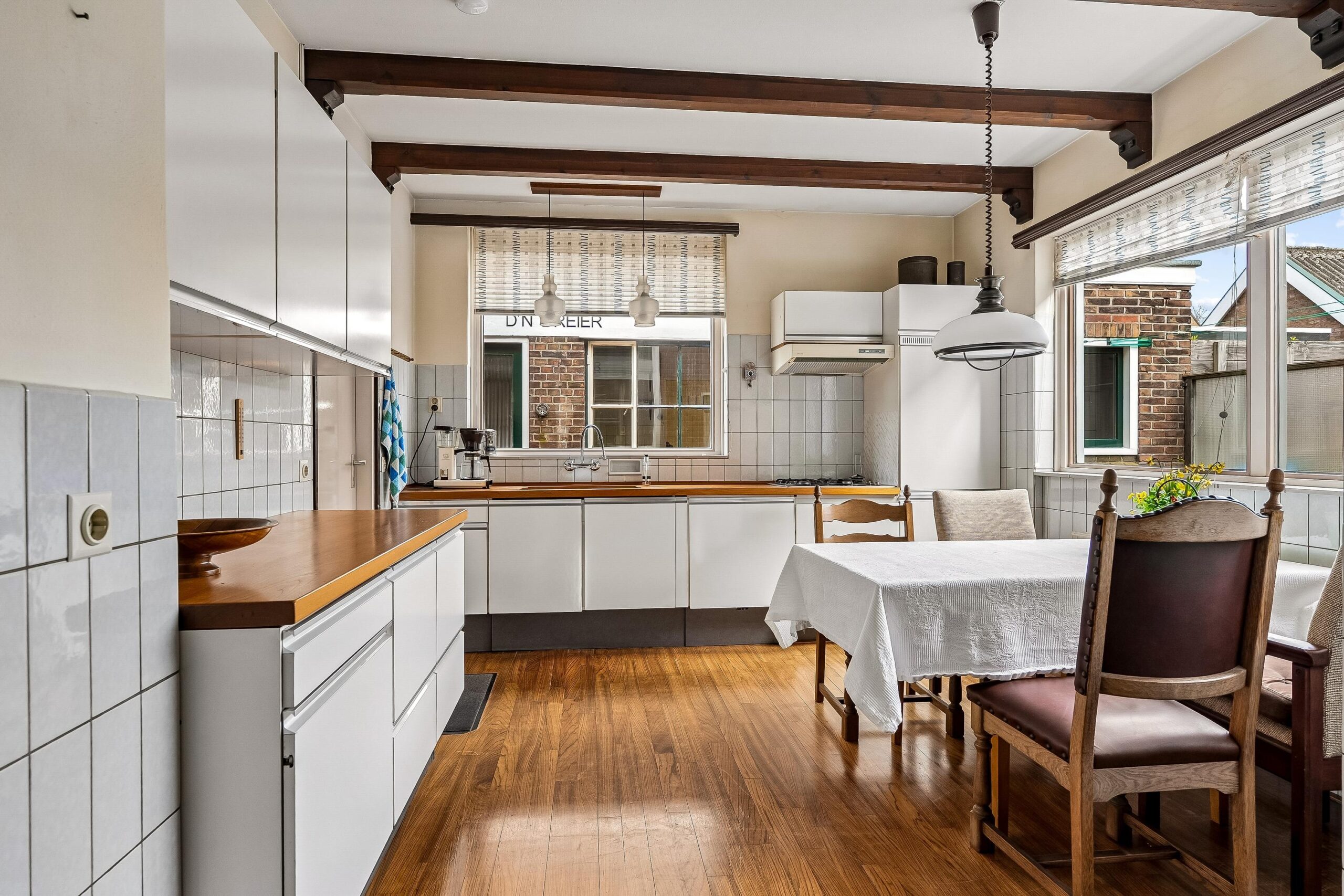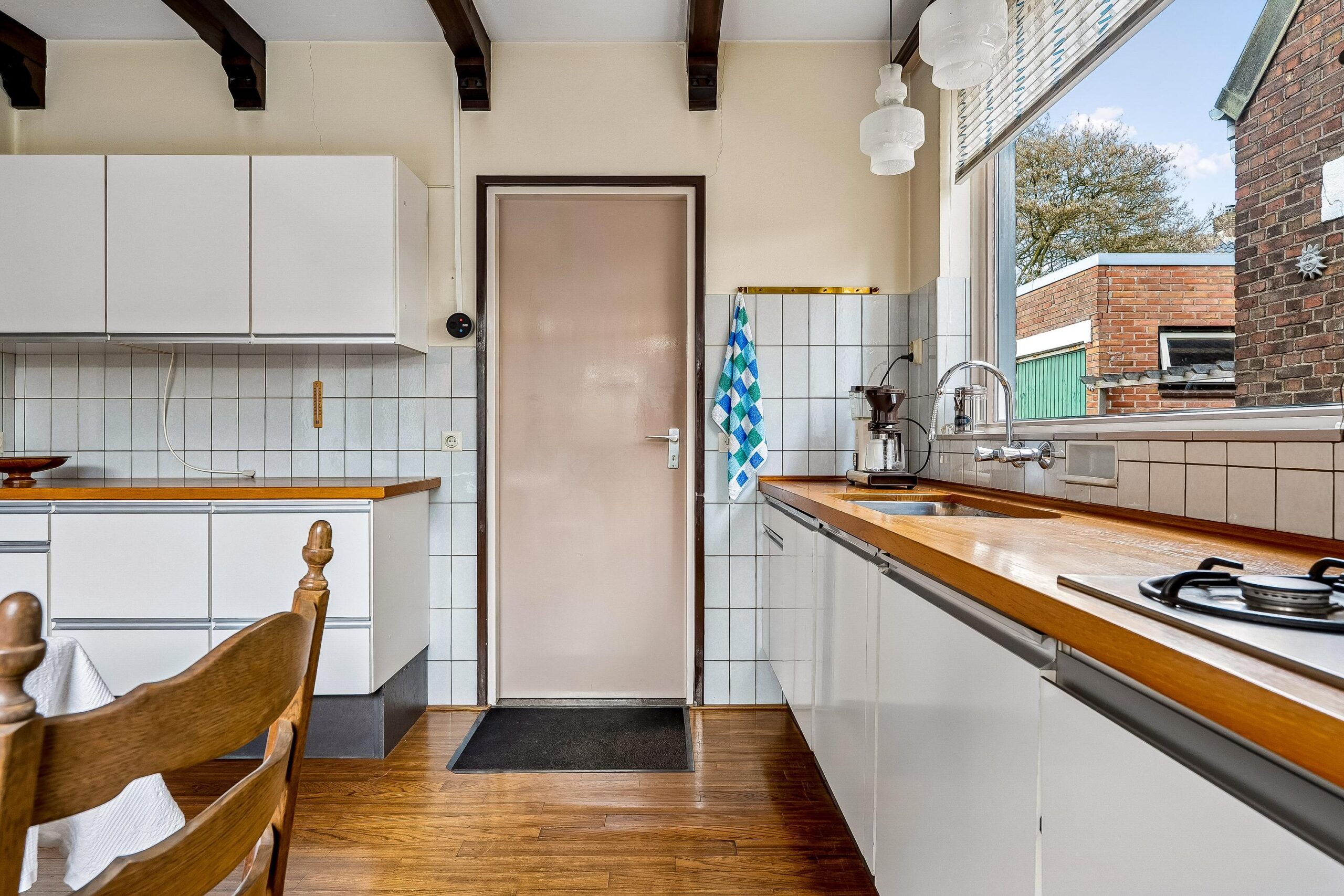 Aansluitend aan de keuken bevindt zich de bijkeuken. Deze ruimte is zeer functioneel en biedt plaats voor witgoedaansluitingen en extra bergruimte. Tevens is hier een achterdeur aanwezig, wat zorgt voor een handige achterom richting het erf en de bijgebouwen. Boven de keuken bevindt zich bovendien een praktische zolderruimte met een cv-installatie uit 2011.