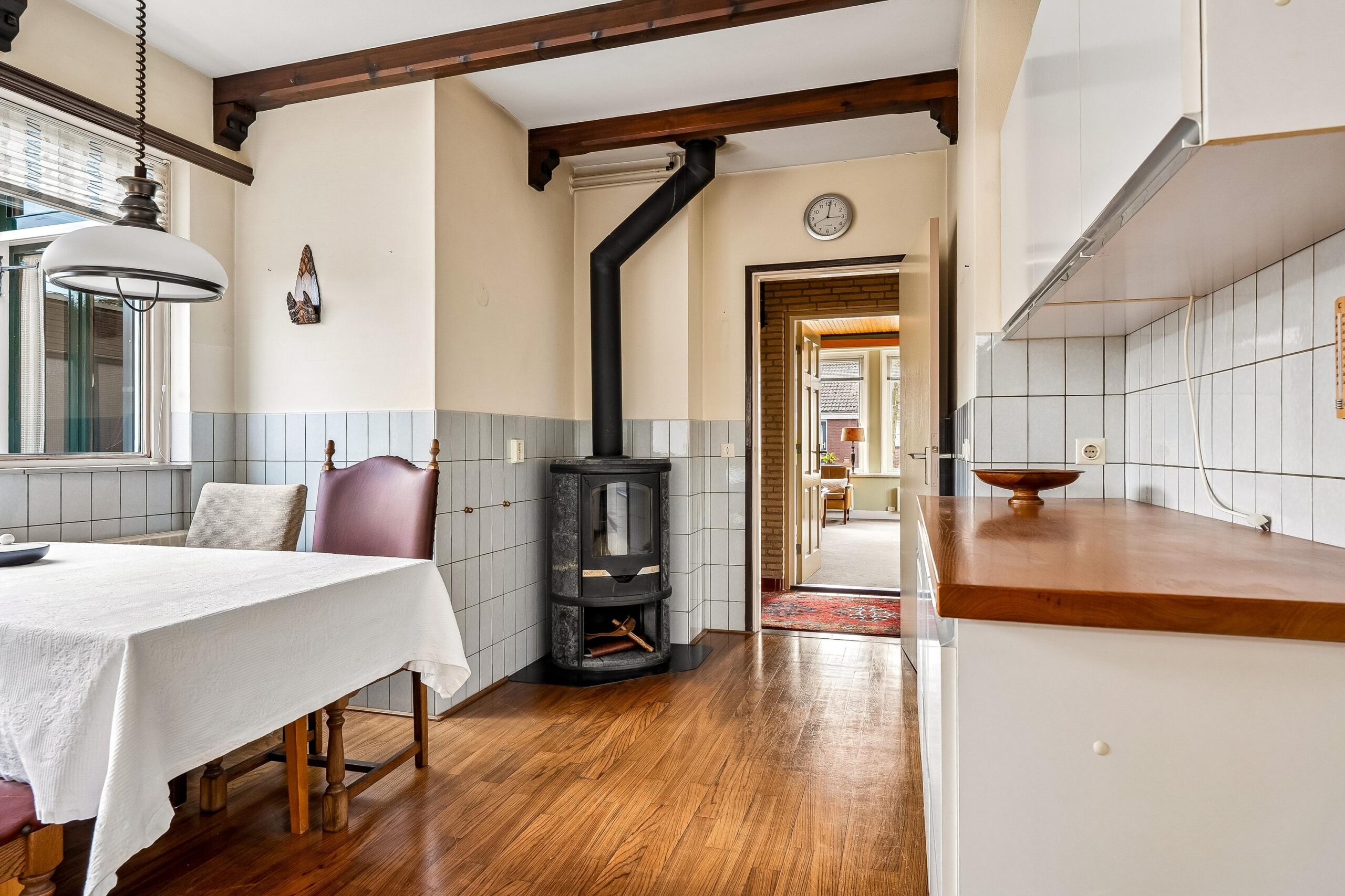 De woonkeuken is gelegen aan de achterzijde van de woning en vormt het hart van het huis. Deze ruime en lichte ruimte is praktisch ingedeeld en voorzien van diverse inbouwapparatuur. De aanwezige speksteenkachel is een echte blikvanger en staat bekend om zijn efficiënte warmteafgifte. Daarnaast is er voldoende ruimte voor een eettafel, waardoor dit een ideale plek is voor dagelijks gebruik en samenkomen.