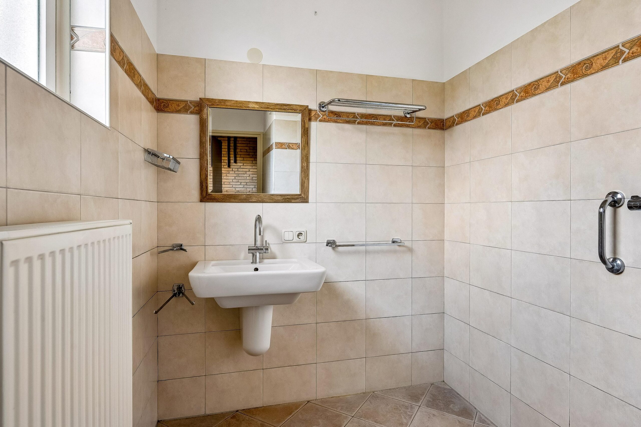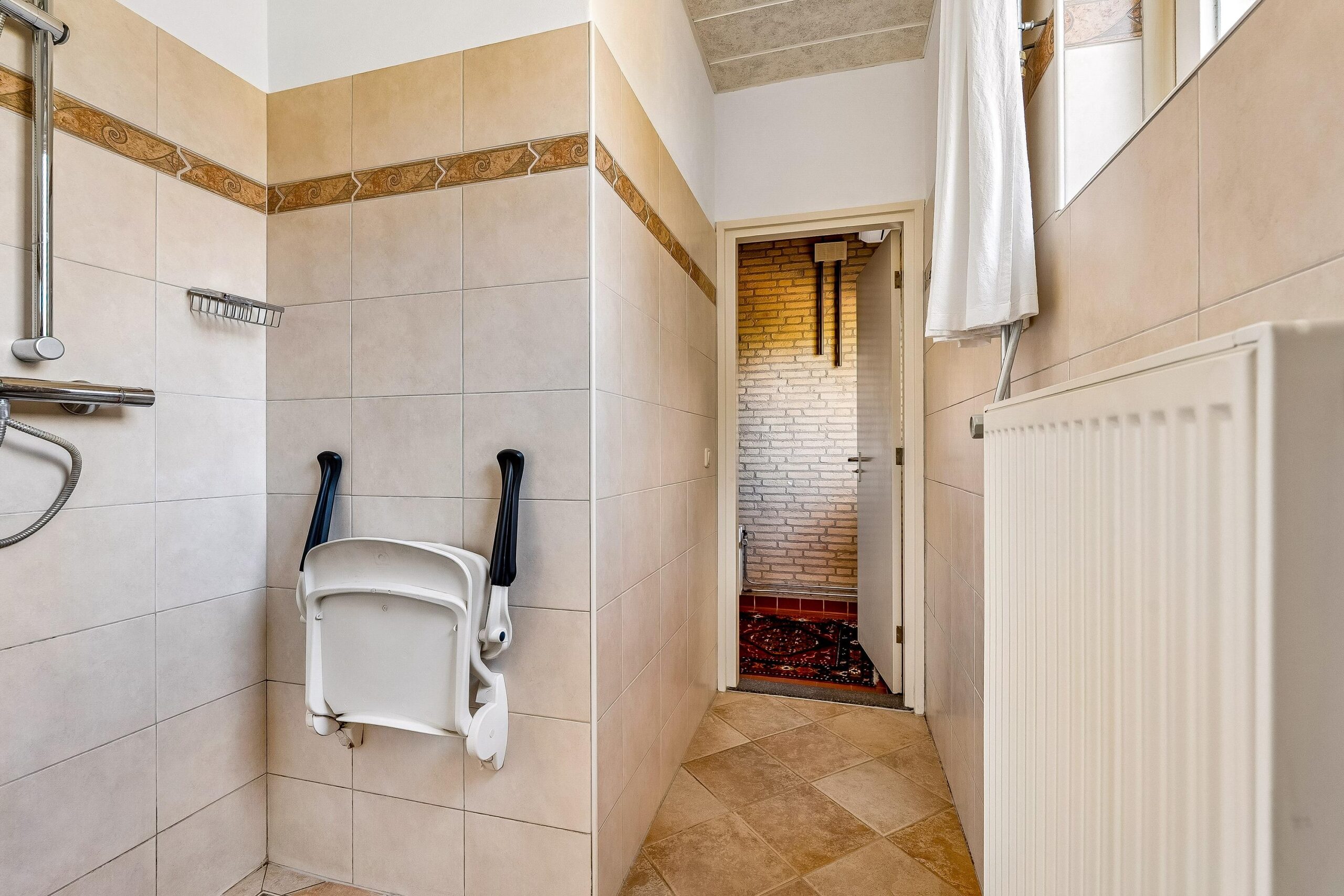 De badkamer is bereikbaar vanuit de entreehal en is praktisch ingericht met een douche, wastafel en comfortabele vloerverwarming.