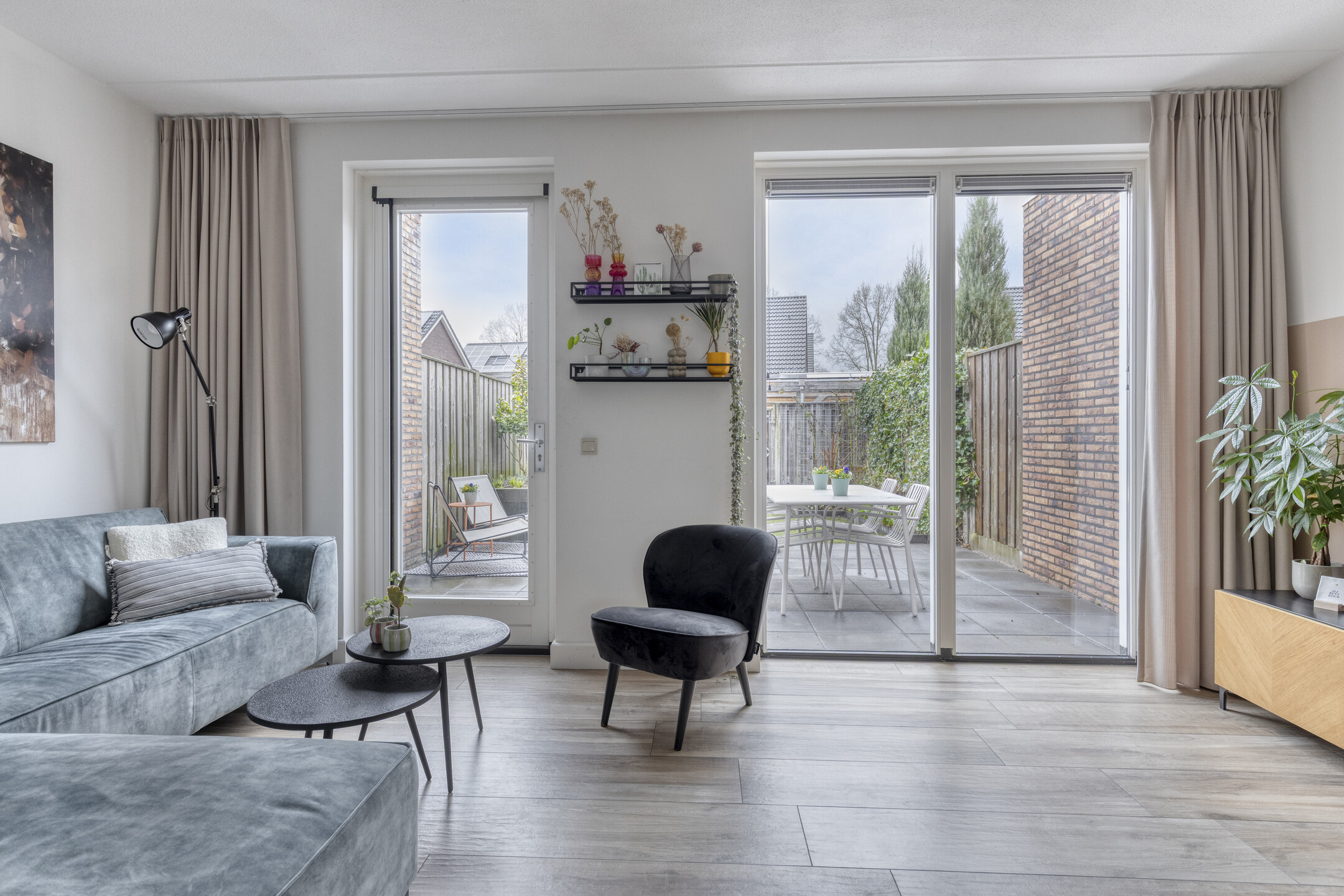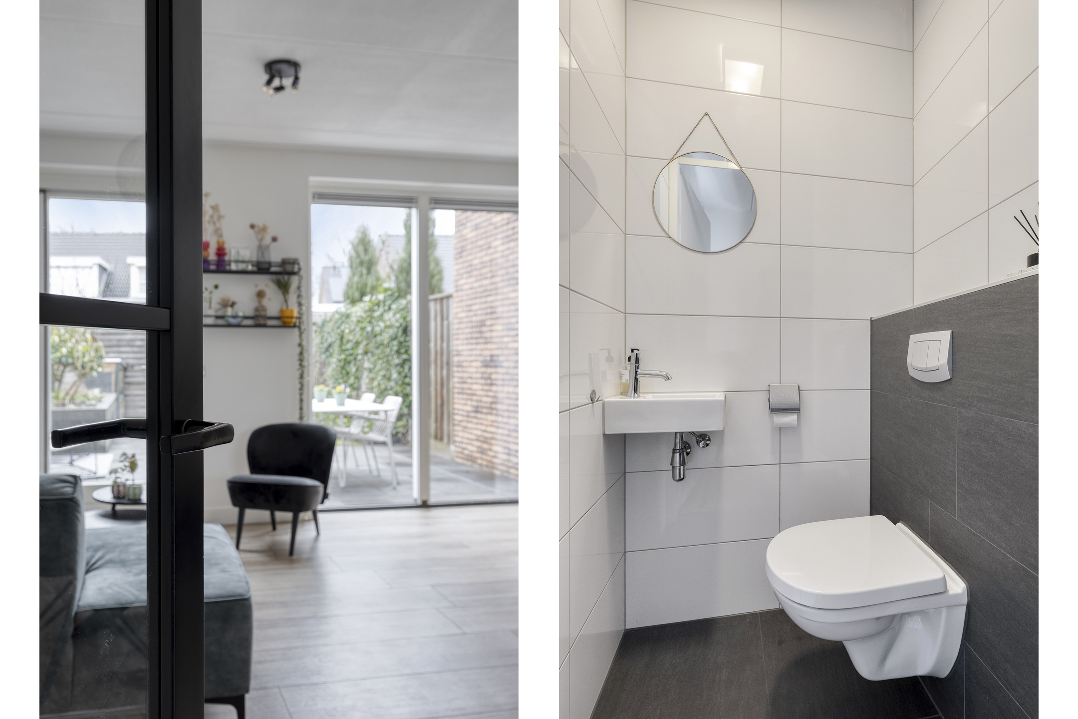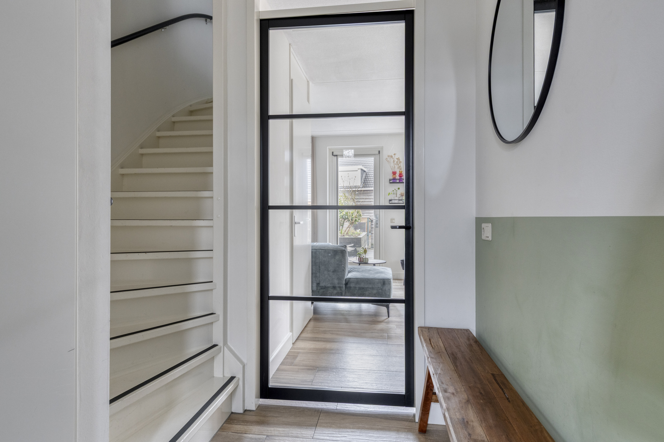 Via de moderne industriële deur met glas bereik je het open leefgedeelte van de woning. Aan de tuinzijde bevindt zich de woonkamer die door de grote raampartijen van vloer tot bijna plafond heerlijk licht is. Vanuit de woonkamer is er een deur naar de achtertuin en daarnaast is er nog een praktische trapkast aanwezig voor extra bergruimte.