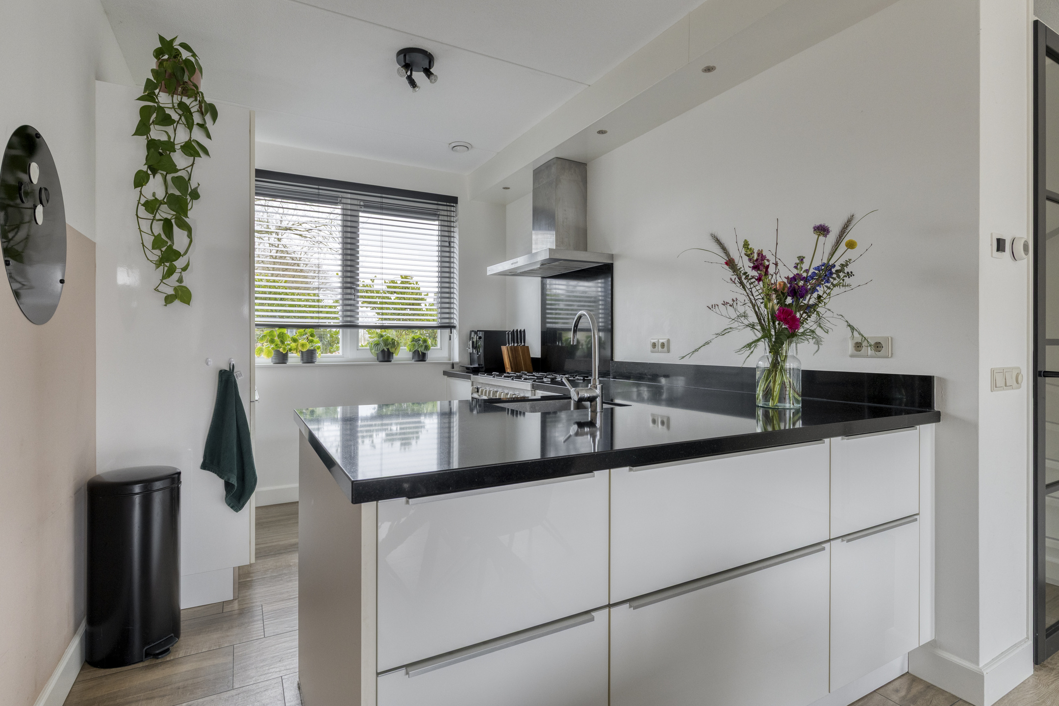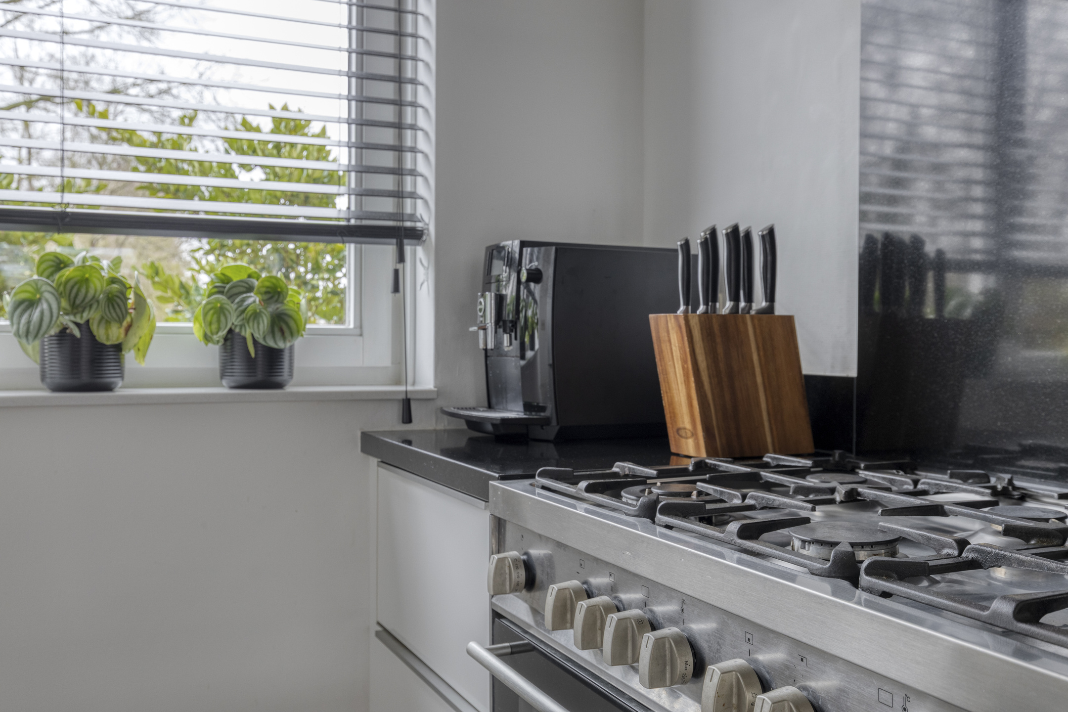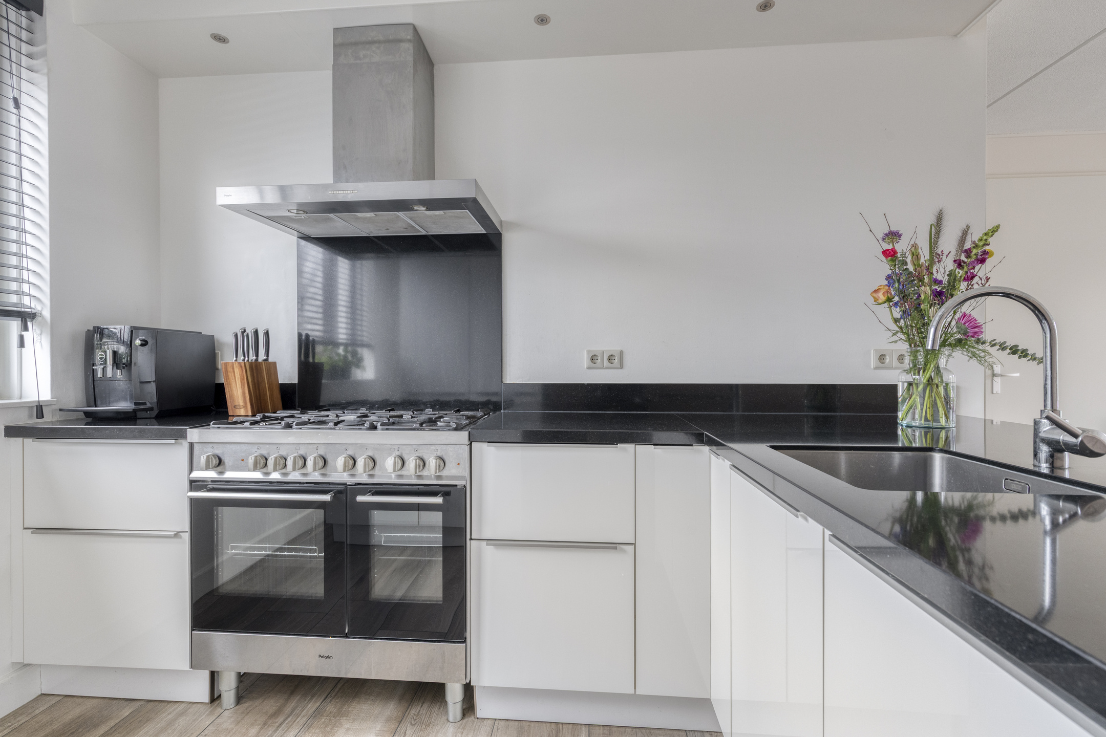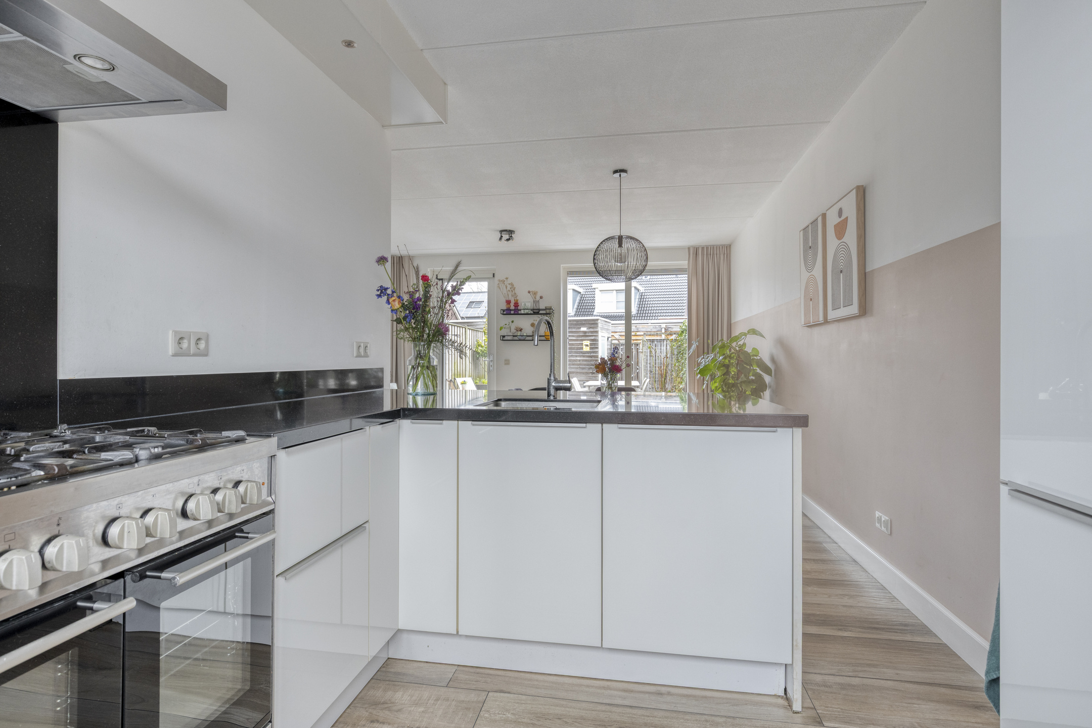 Aan de voorzijde van de woning ligt de open keuken in L-opstelling met een aparte keukenkast. De keuken beschikt over veel kastruimte en diepe lades en is uitgerust met een vaatwasser, een Pelgrim 6-pits gasfornuis met twee ovens, een RVS afzuigkap, een koelkast, vriezer en een natuurstenen werkblad. Door de open opstelling staat de keuken in direct contact met het eetgedeelte en de woonkamer. Vanuit de keuken is er bovendien een vrije zichtlijn over de straat en het voorgelegen groen.