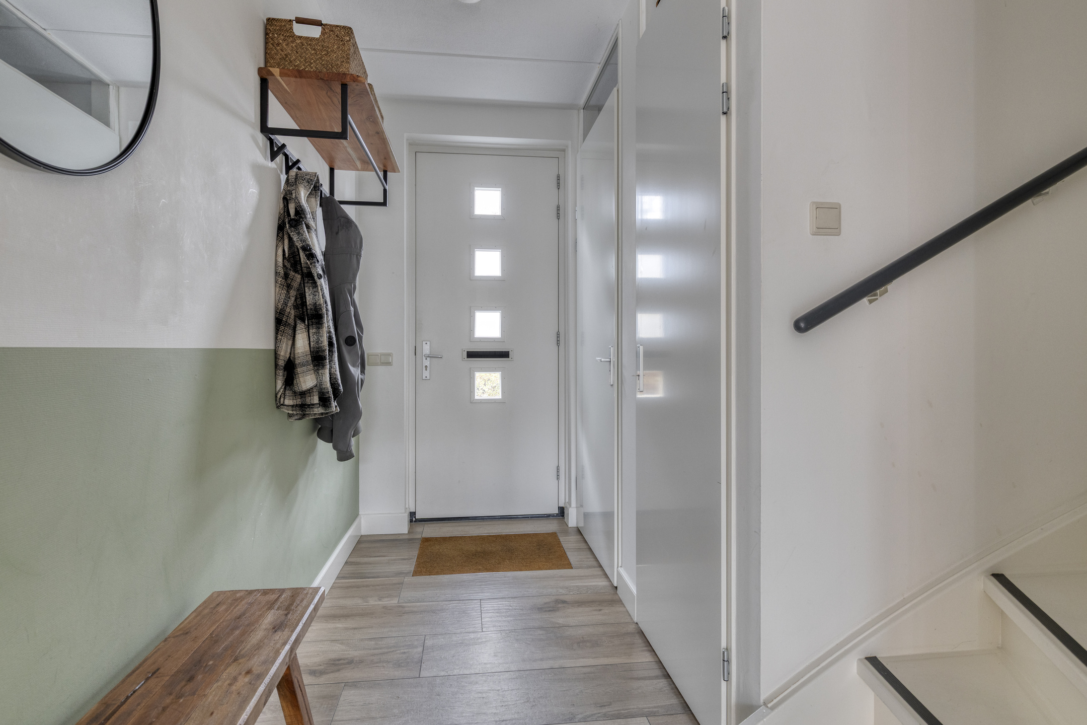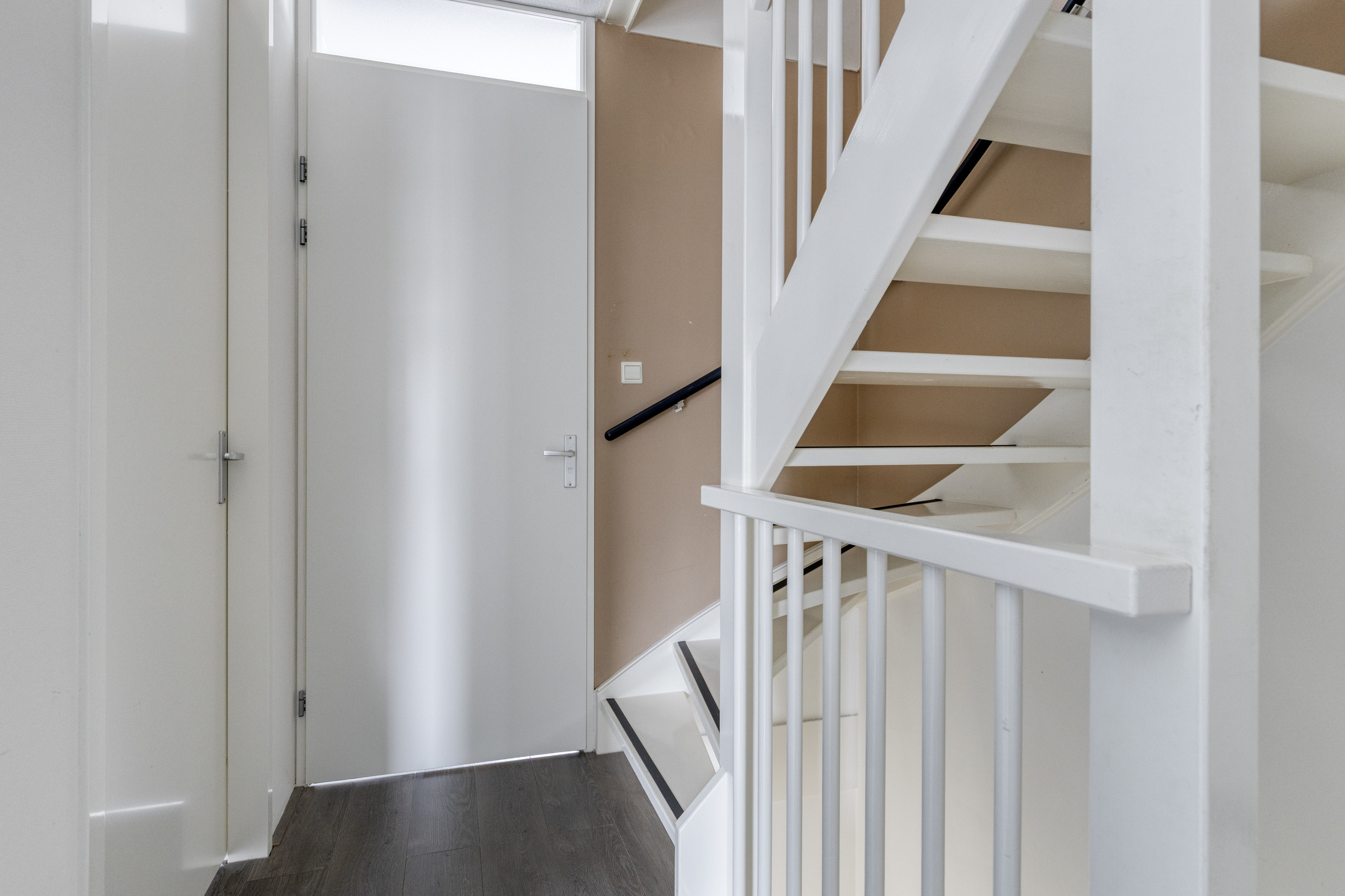 Via de voortuin kom je binnen in de entree-hal van de woning. De hal geeft toegang tot de volledig betegelde en modern uitgevoerde toiletruimte met fonteintje, de meterkast, een praktische garderobeplek en de trapopgang naar de eerste verdieping.