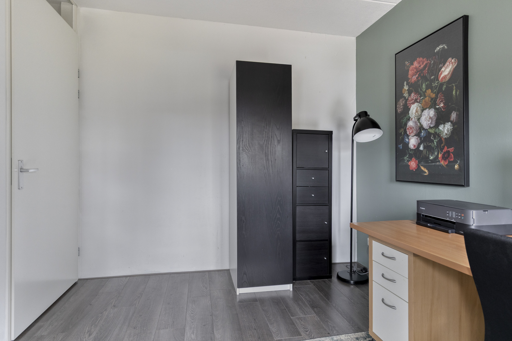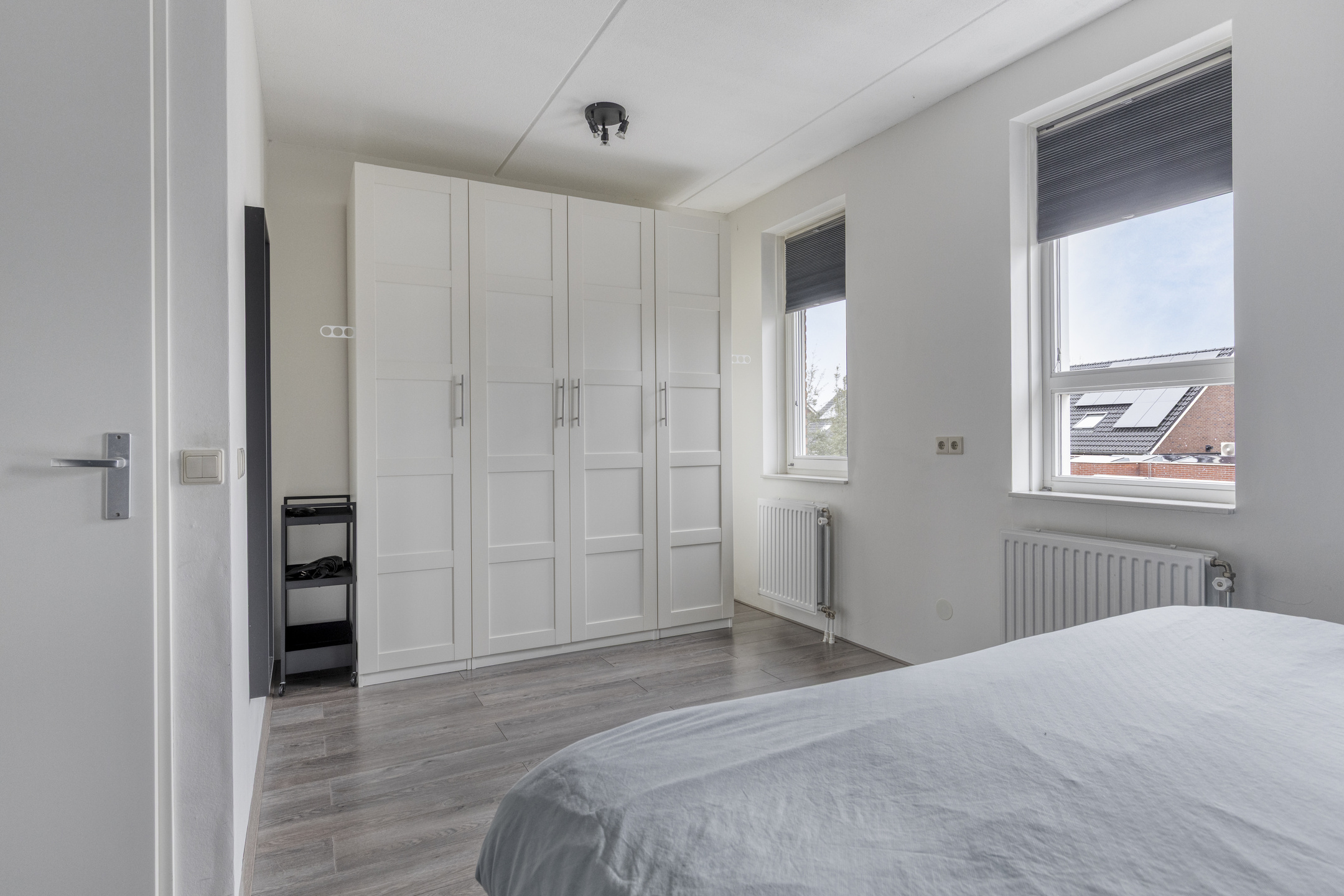 Via de trap in de hal bereik je de eerste verdieping. Hier kom je uit op de overloop die toegang geeft tot twee slaapkamers en de badkamer. De ouderslaapkamer aan de achterzijde van de woning strekt zich uit over de volledige breedte van het huis en biedt daardoor veel ruimte. Aan de voorzijde bevindt zich nog een ruime slaapkamer waar eenvoudig een tweepersoonsbed en een kast geplaatst kunnen worden. De slaapkamers en de overloop zijn afgewerkt met een doorgelegde donkere houtlook laminaatvloer.
