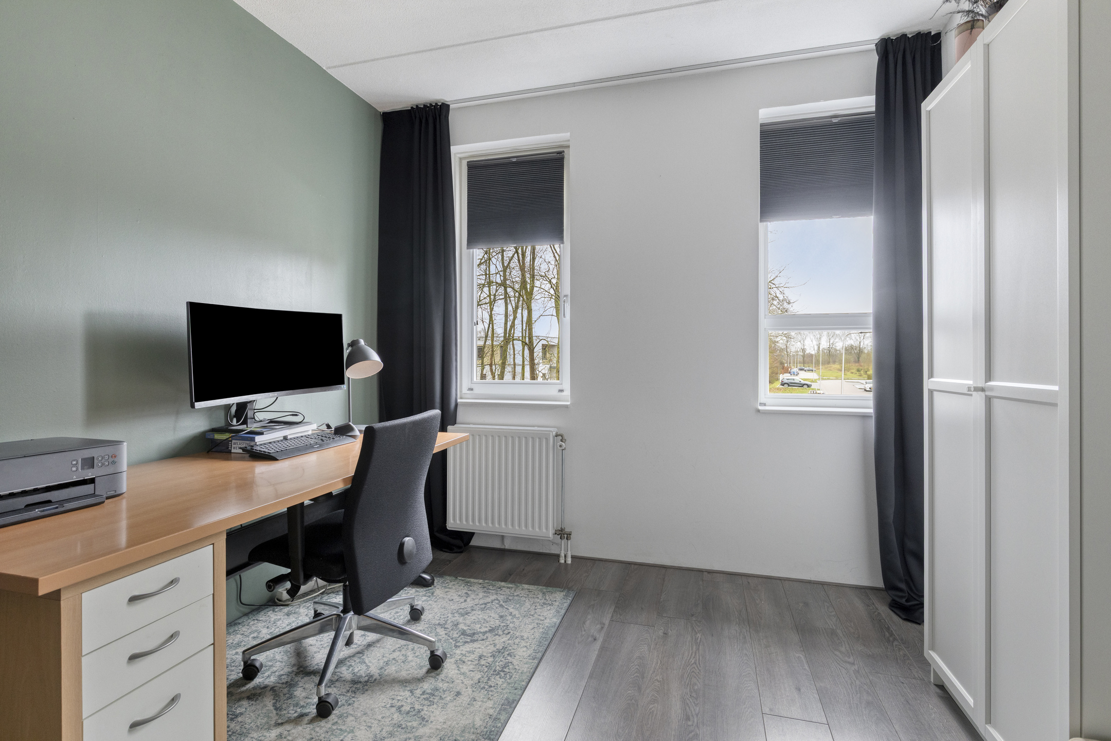 De begane grond is afgewerkt met een nette plavuizen vloer in hout tint en volledig voorzien van vloerverwarming.
