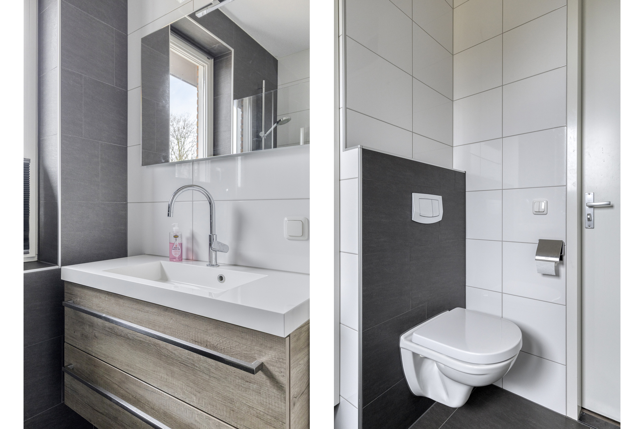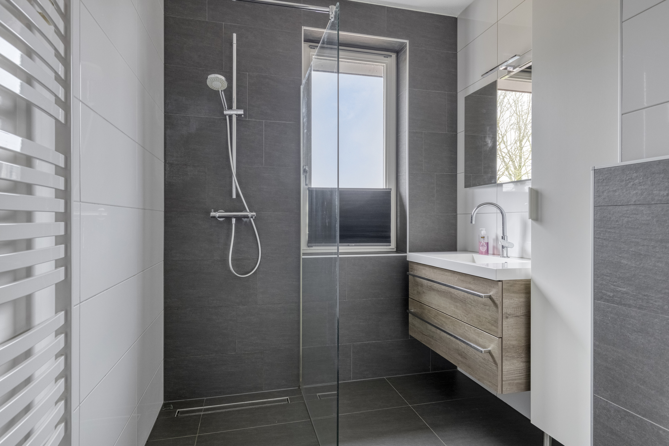 De badkamer is volledig betegeld en modern uitgevoerd met een inloopdouche met glazen douchewand, een wastafel met meubel, een spiegelwand, een designradiator en een toilet.
