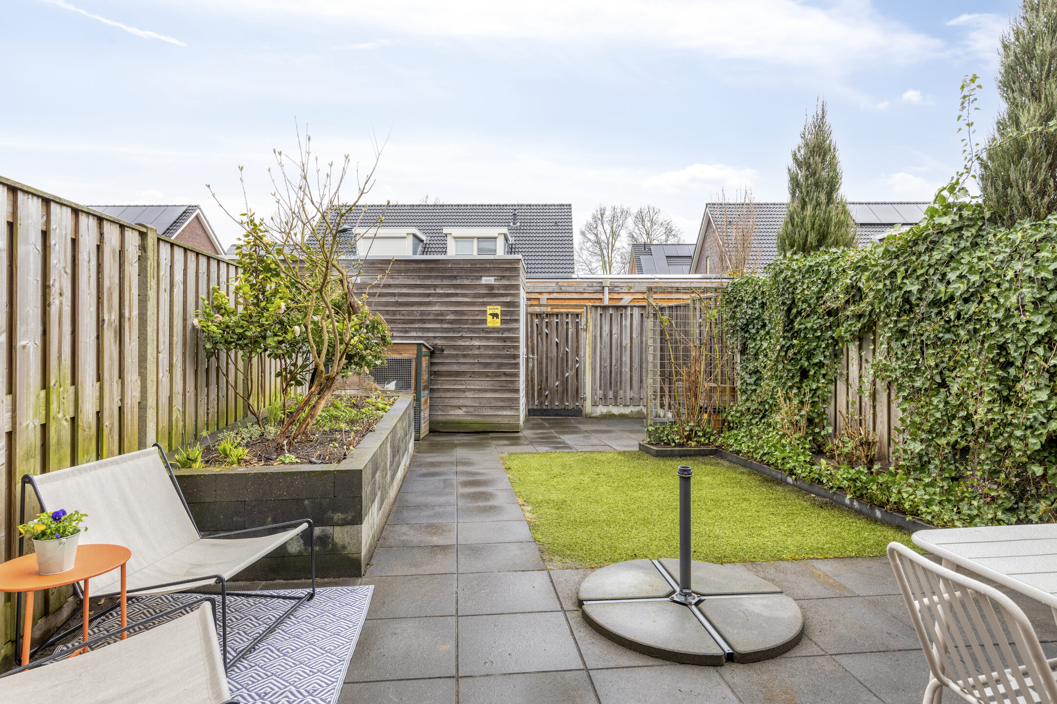 Achterin het perceel staat een vrijstaande houten berging en is opnieuw een gedeelte bestraat. De tuin biedt daardoor een fijne combinatie van terras en groen en is een prettige plek om buiten te zitten.