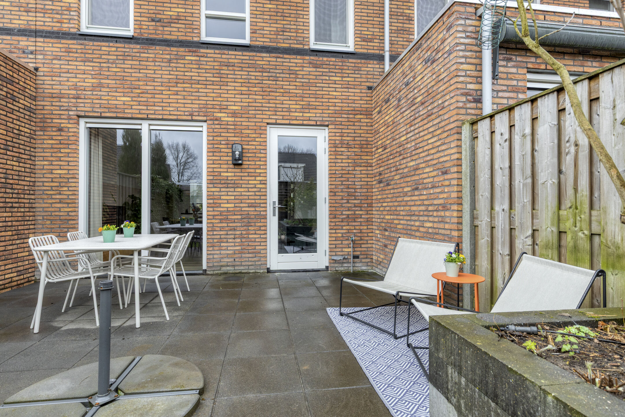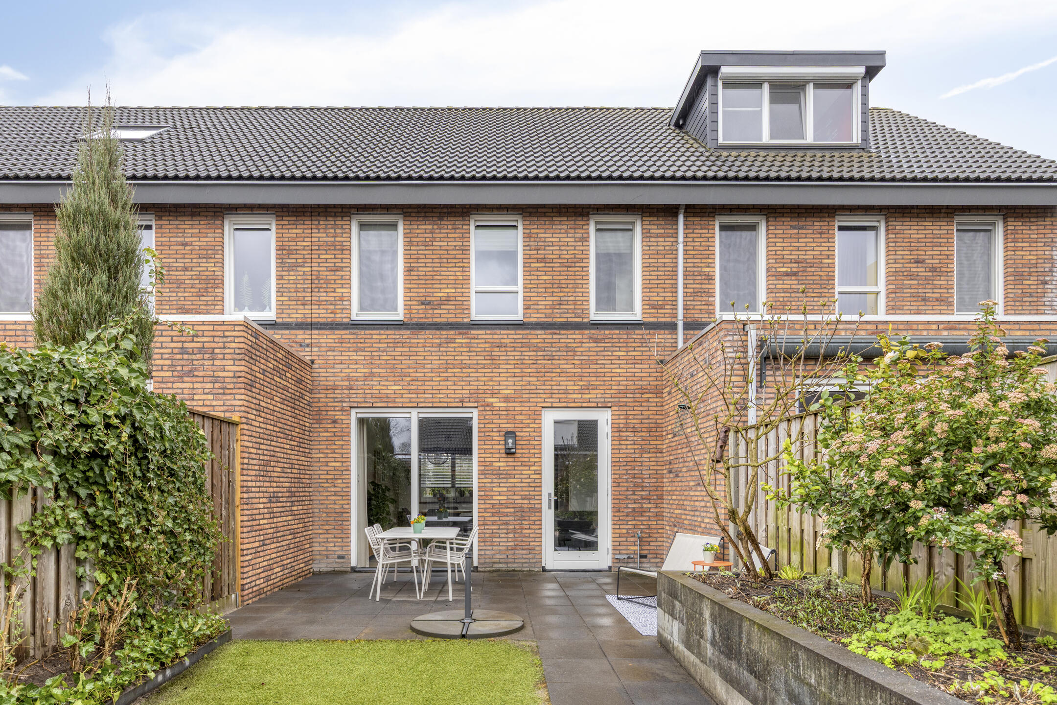 De achtertuin is bereikbaar via de deur in de woonkamer en via een achterom. Direct achter de woning ligt een bestraat terras waar ruimte is voor een loungeset of tuintafel. Verder is de tuin verzorgd aangelegd met groen en plantenbakken aan de zijkanten.