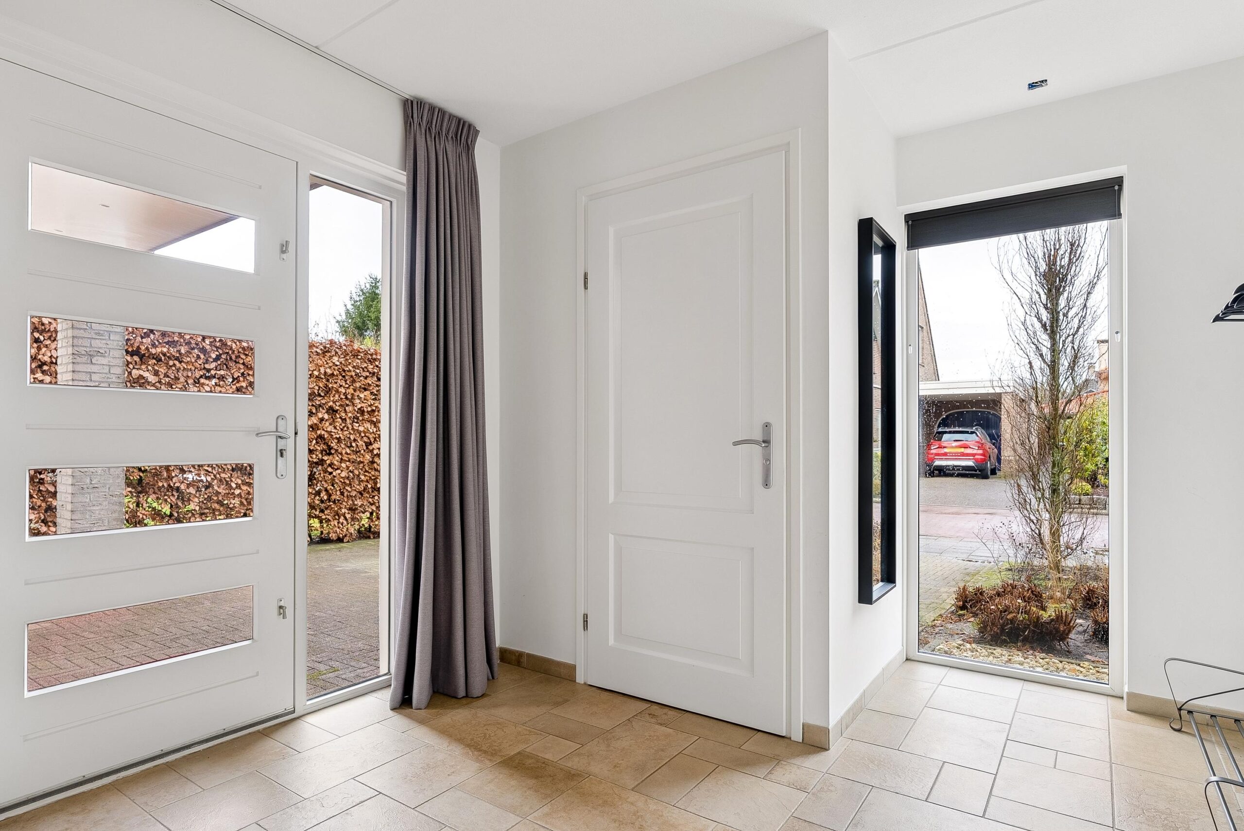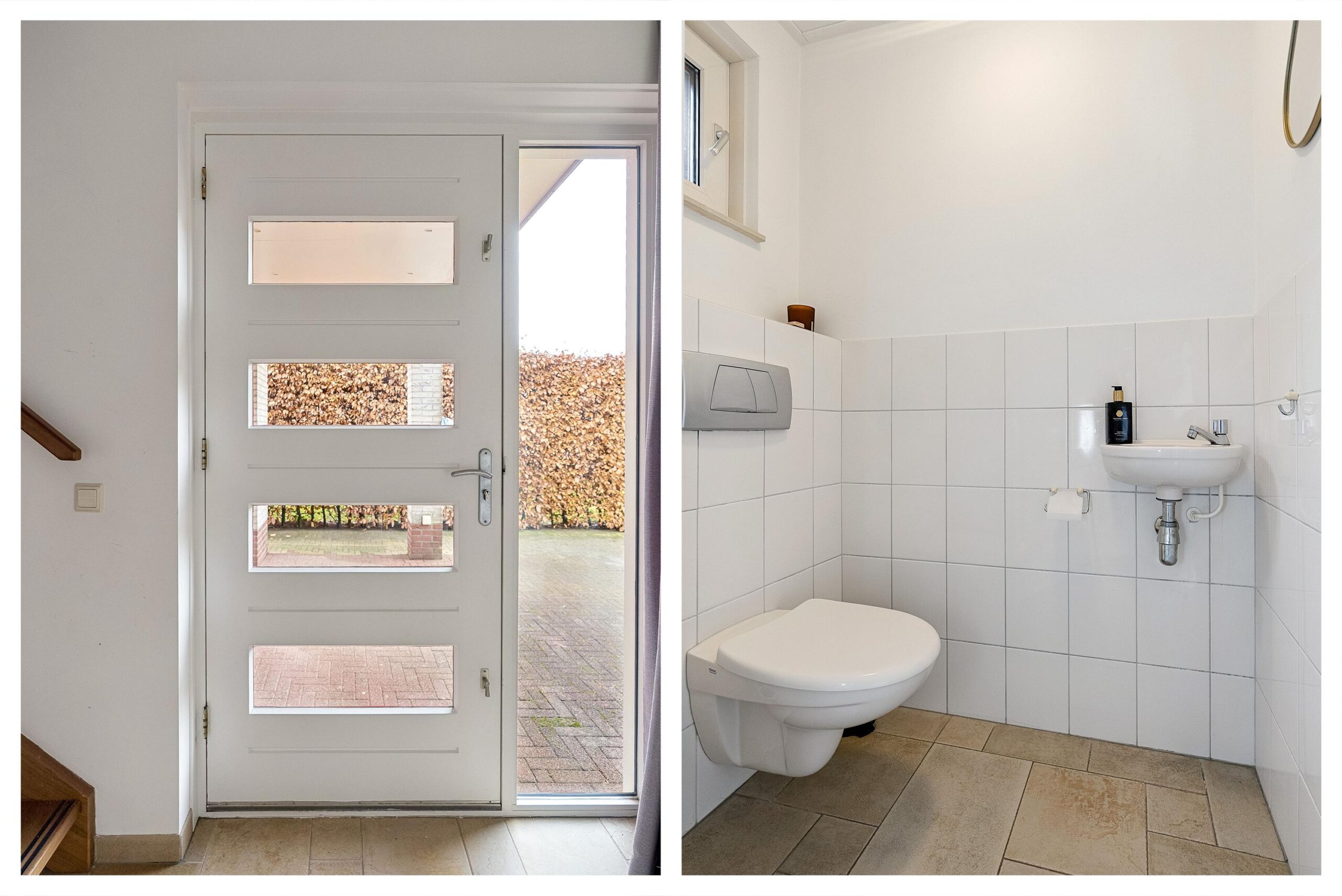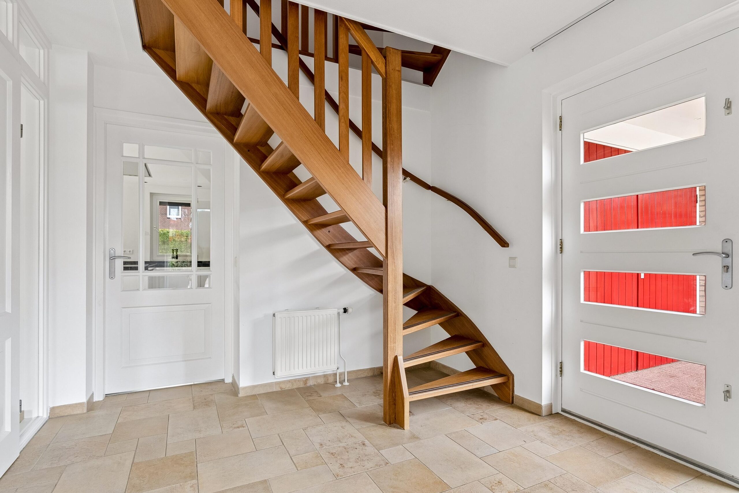 Je komt binnen in een ruime hal met veel lichtinval dankzij de verschillende raampartijen. Vanuit hier heb je toegang tot de woonkamer, de keuken, het deels betegelde gastentoilet met fonteintje en hangcloset, de meterkast en de open trap naar boven.
