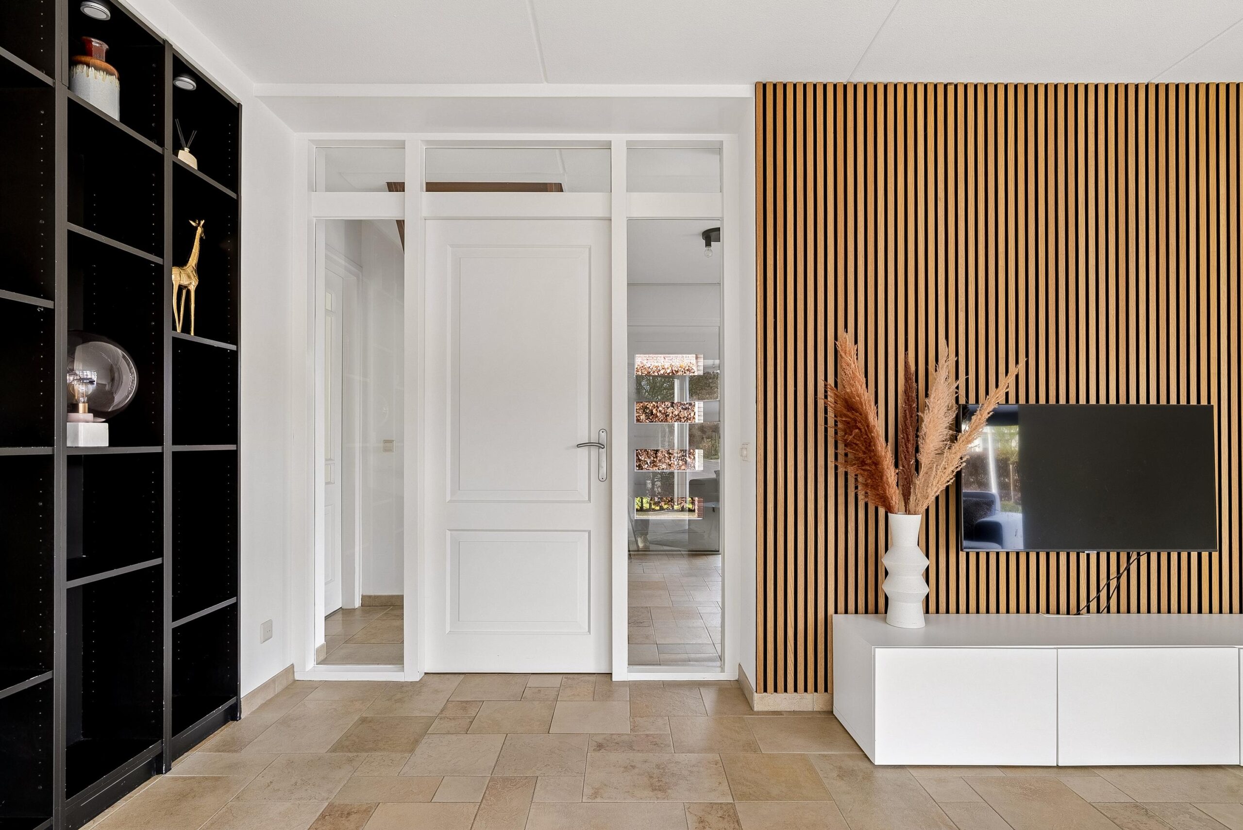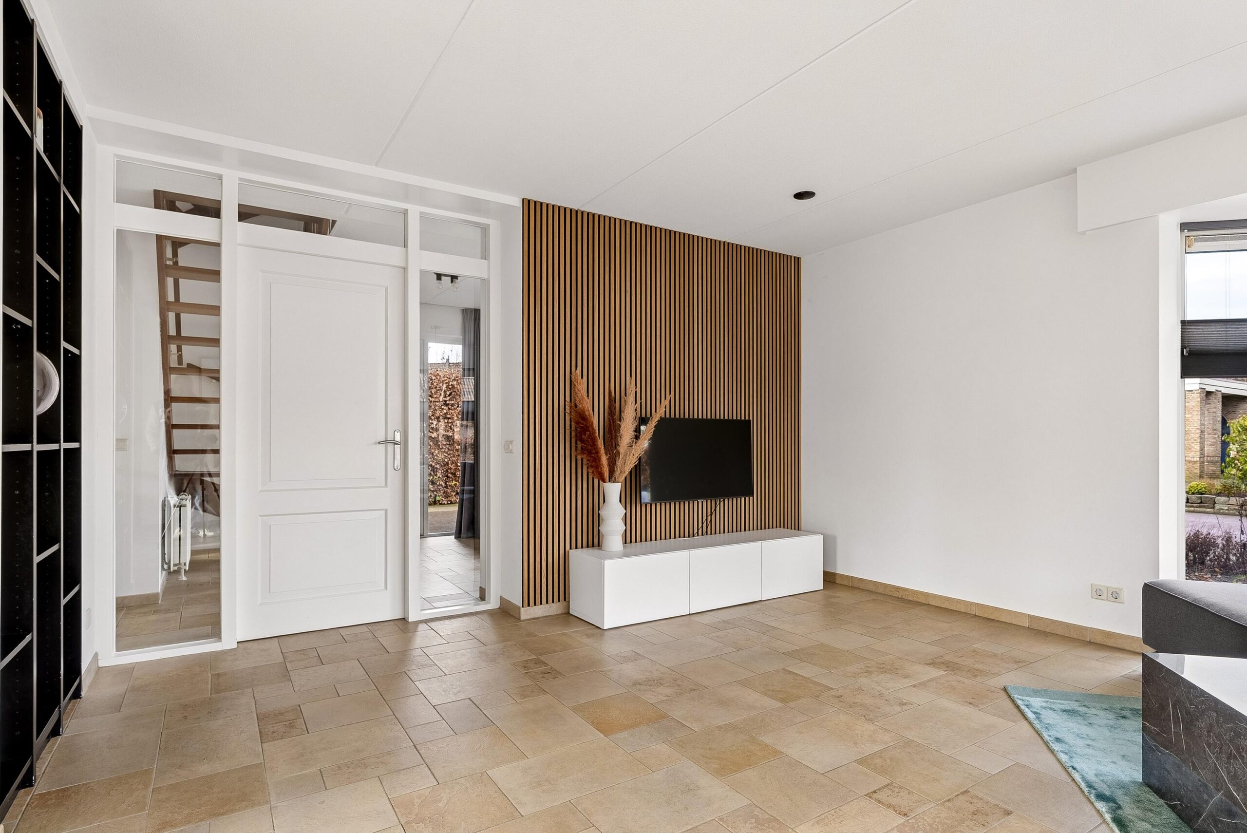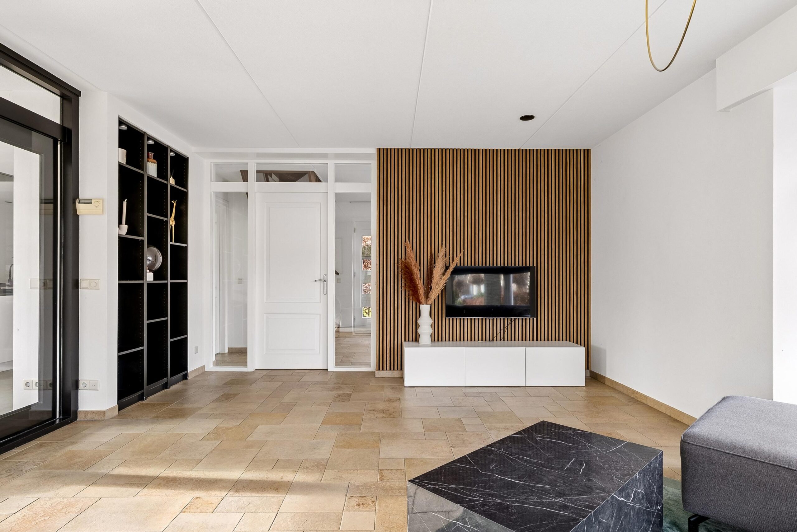 Aan de voorzijde van de woning bevindt zich de woonkamer. De grote raampartijen van vloer tot plafond zorgen hier voor een prachtige lichtinval en een open uitstraling. Je hebt hier volop mogelijkheden om een royale zithoek te creëren. De vaste op maat gemaakte kastenwand geeft de ruimte extra karakter en praktische opbergruimte.