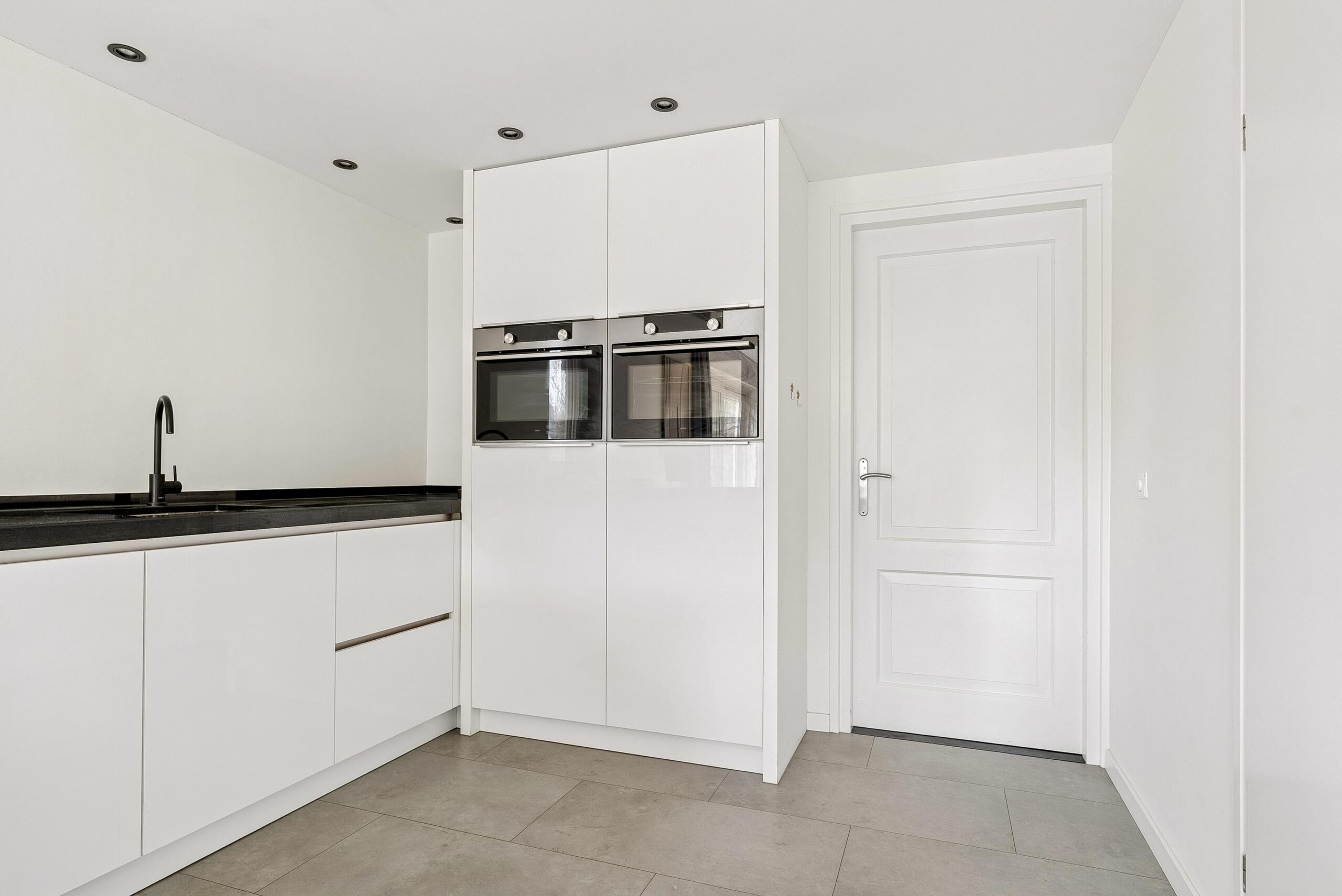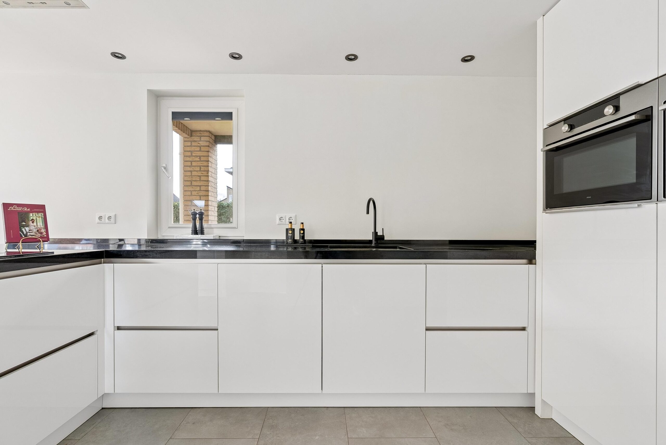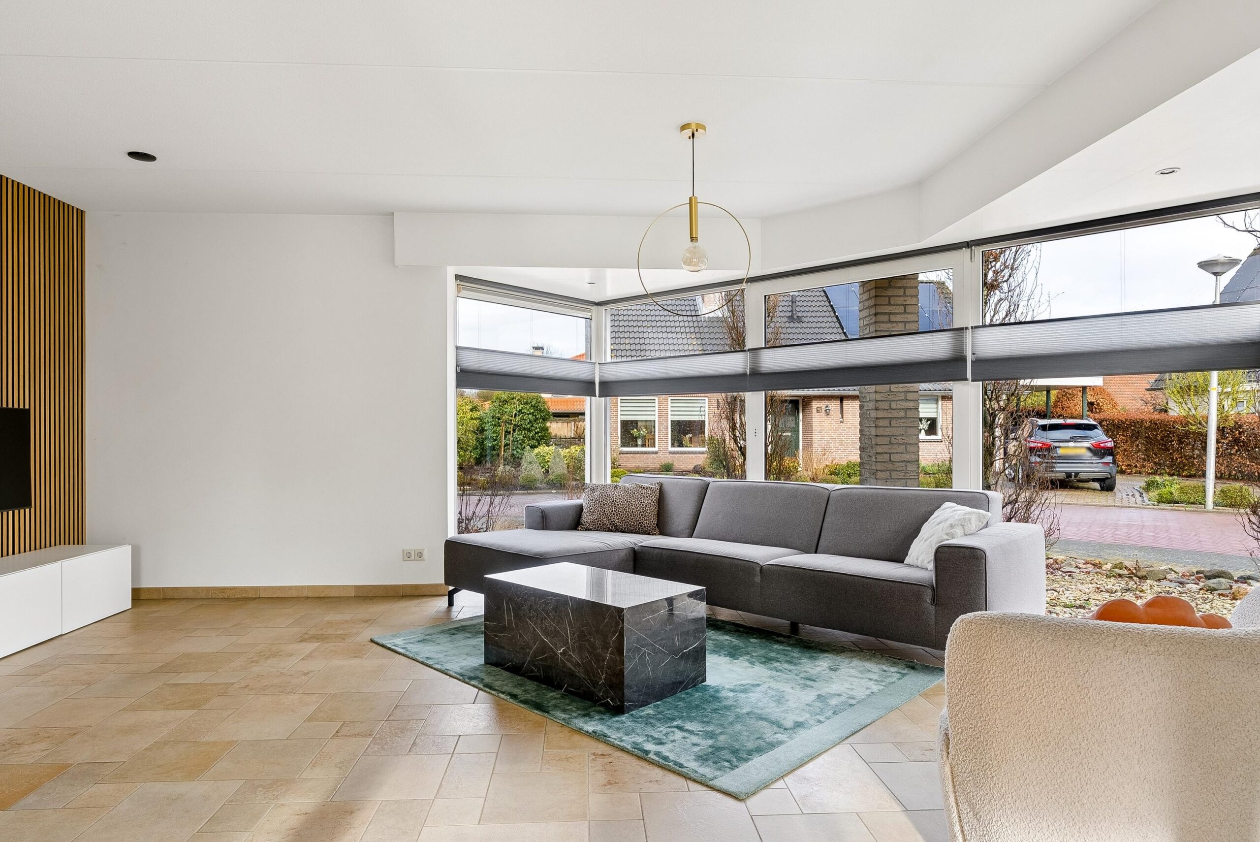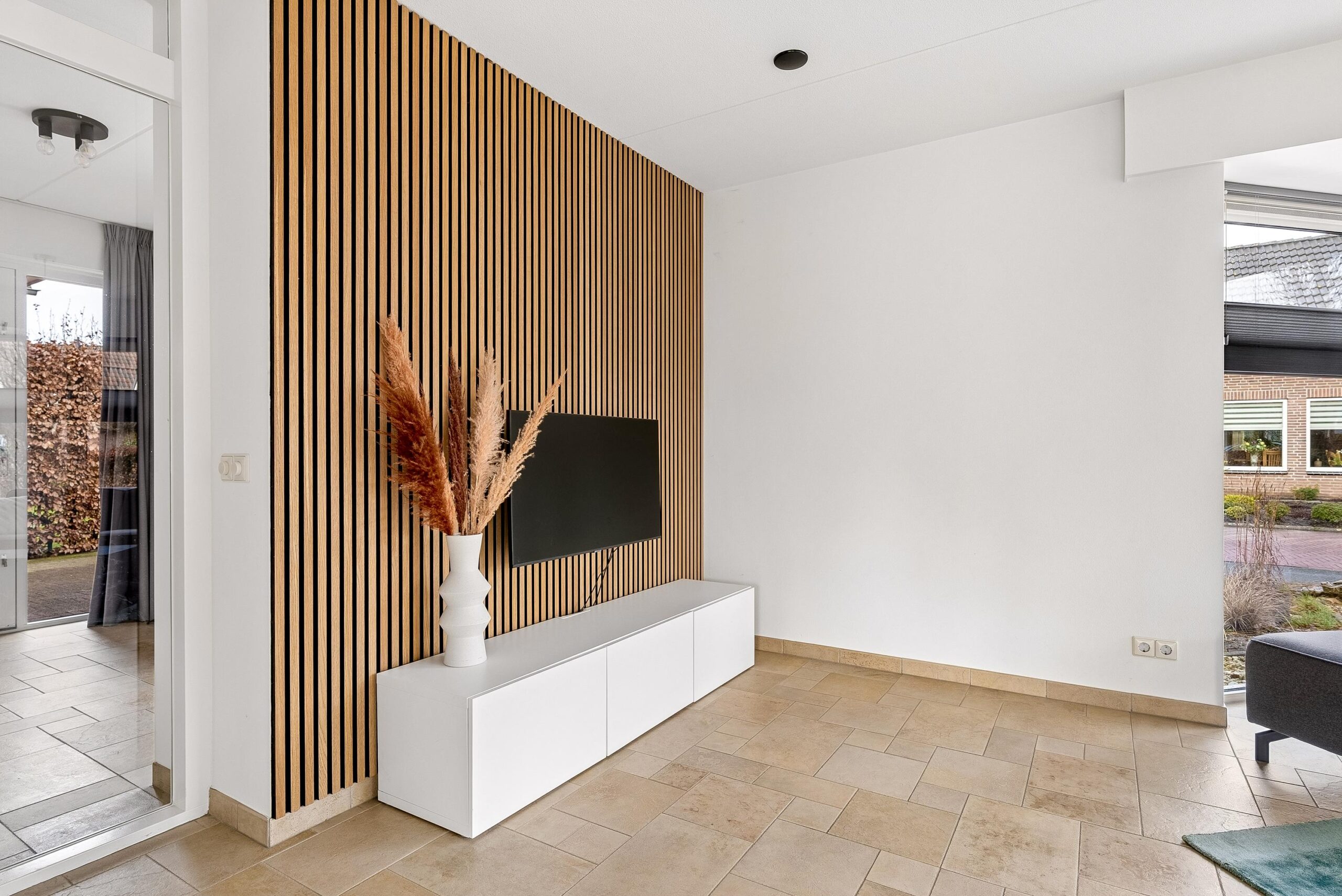 Aan de voorzijde van de woning bevindt zich de woonkamer. De grote raampartijen van vloer tot plafond zorgen hier voor een prachtige lichtinval en een open uitstraling. Je hebt hier volop mogelijkheden om een royale zithoek te creëren. De vaste op maat gemaakte kastenwand geeft de ruimte extra karakter en praktische opbergruimte.