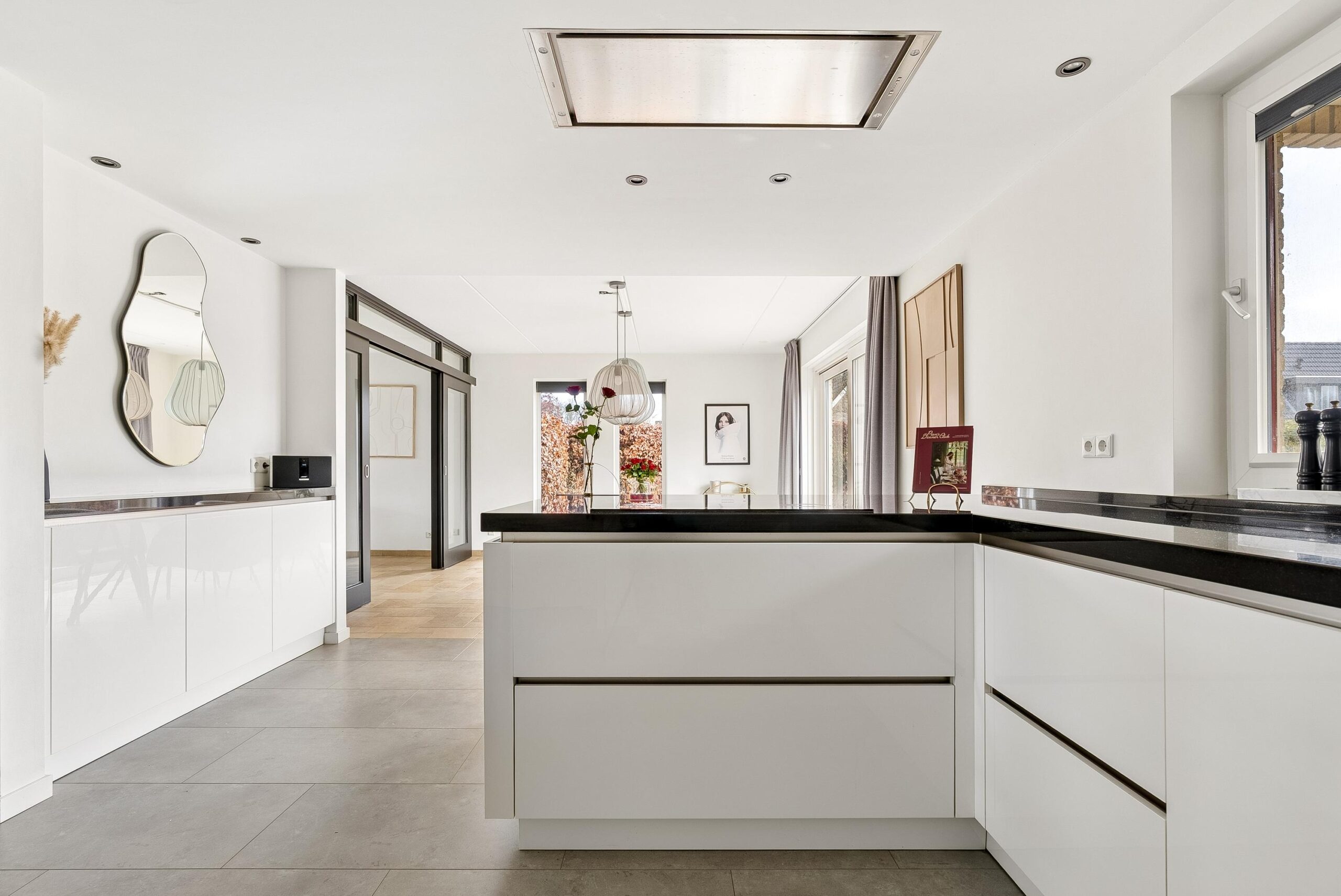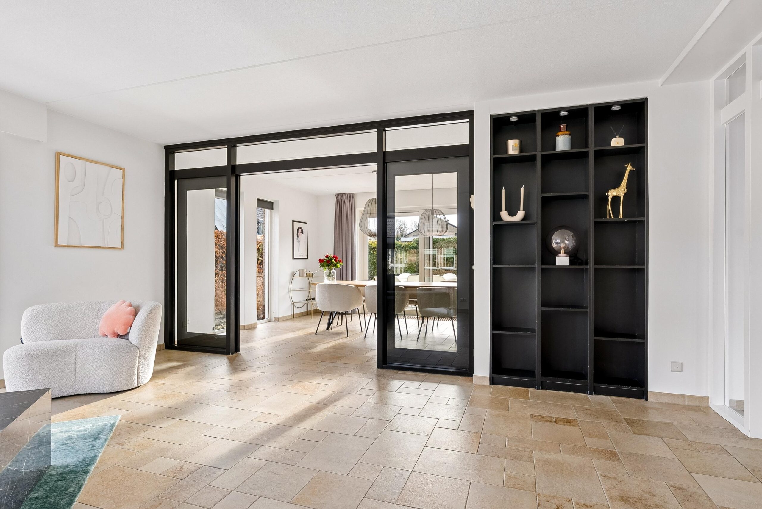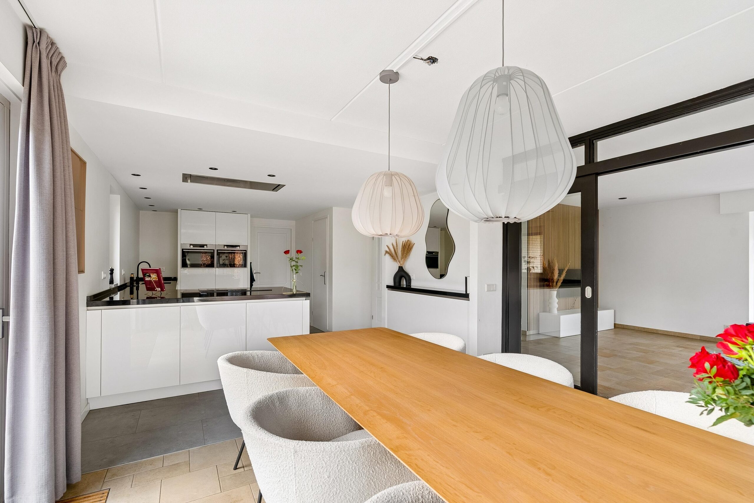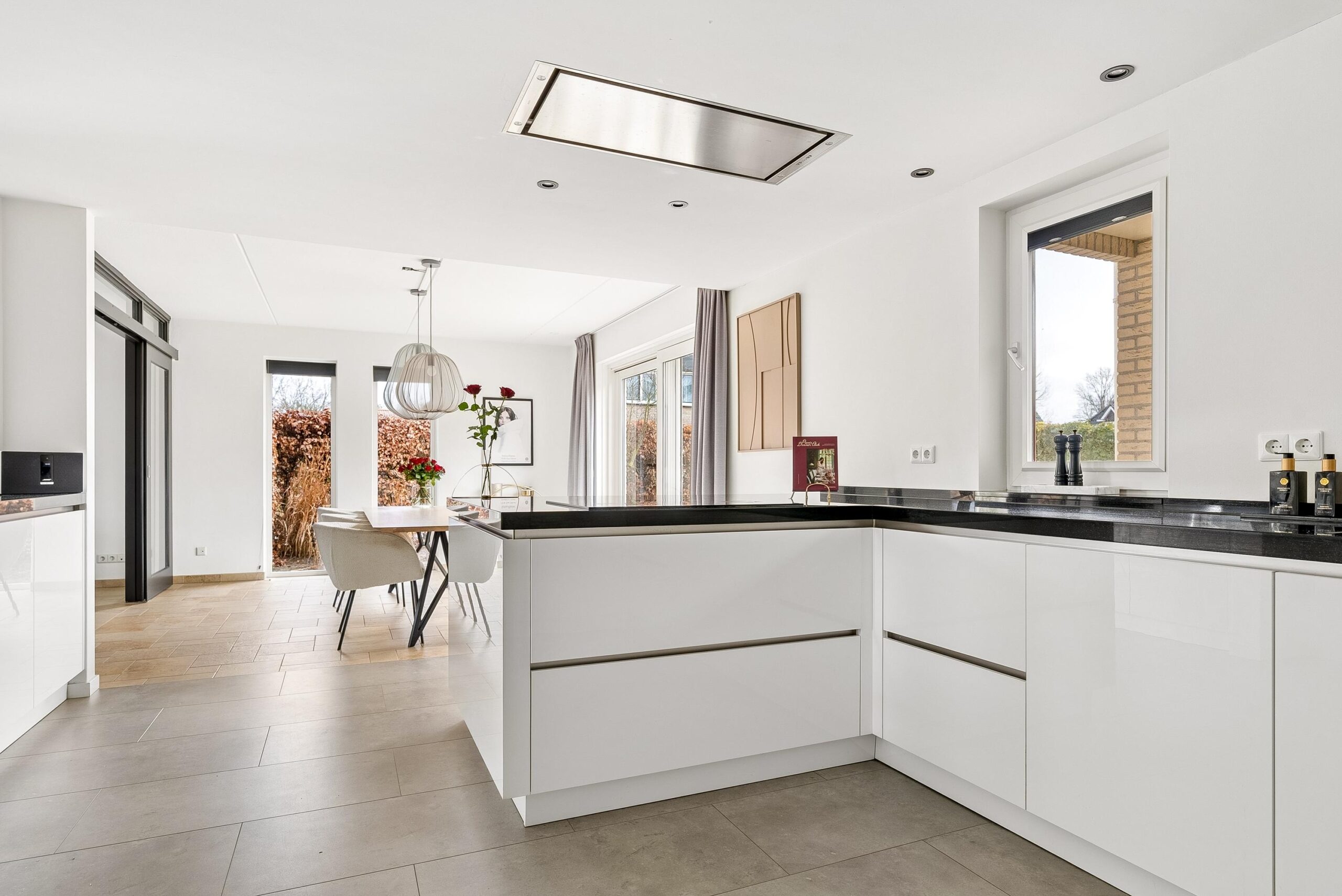 Via dubbele schuifdeuren, omringd door glas, loop je door naar het eetgedeelte aan de achterzijde. Door deze indeling kun je de ruimtes van elkaar scheiden of juist één groot geheel maken.