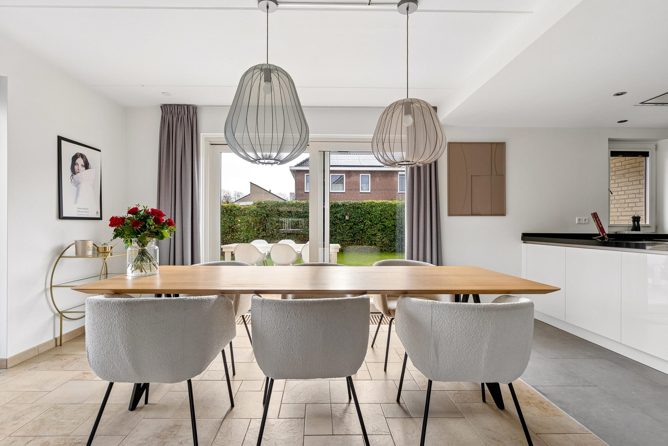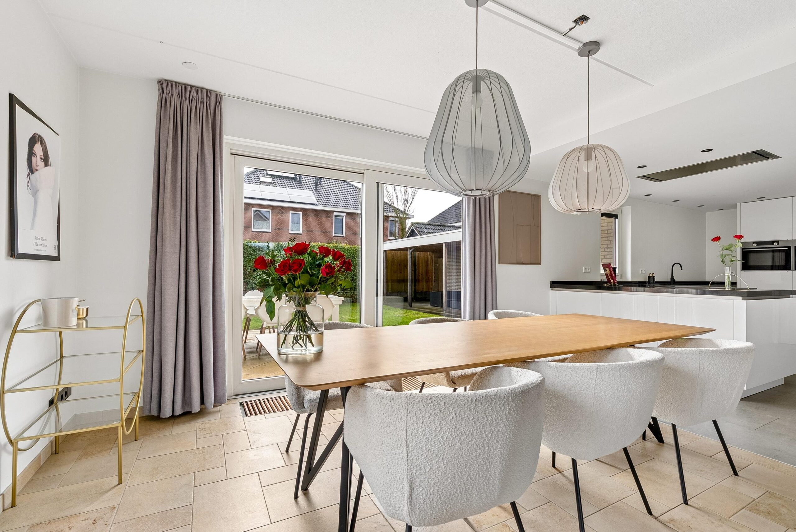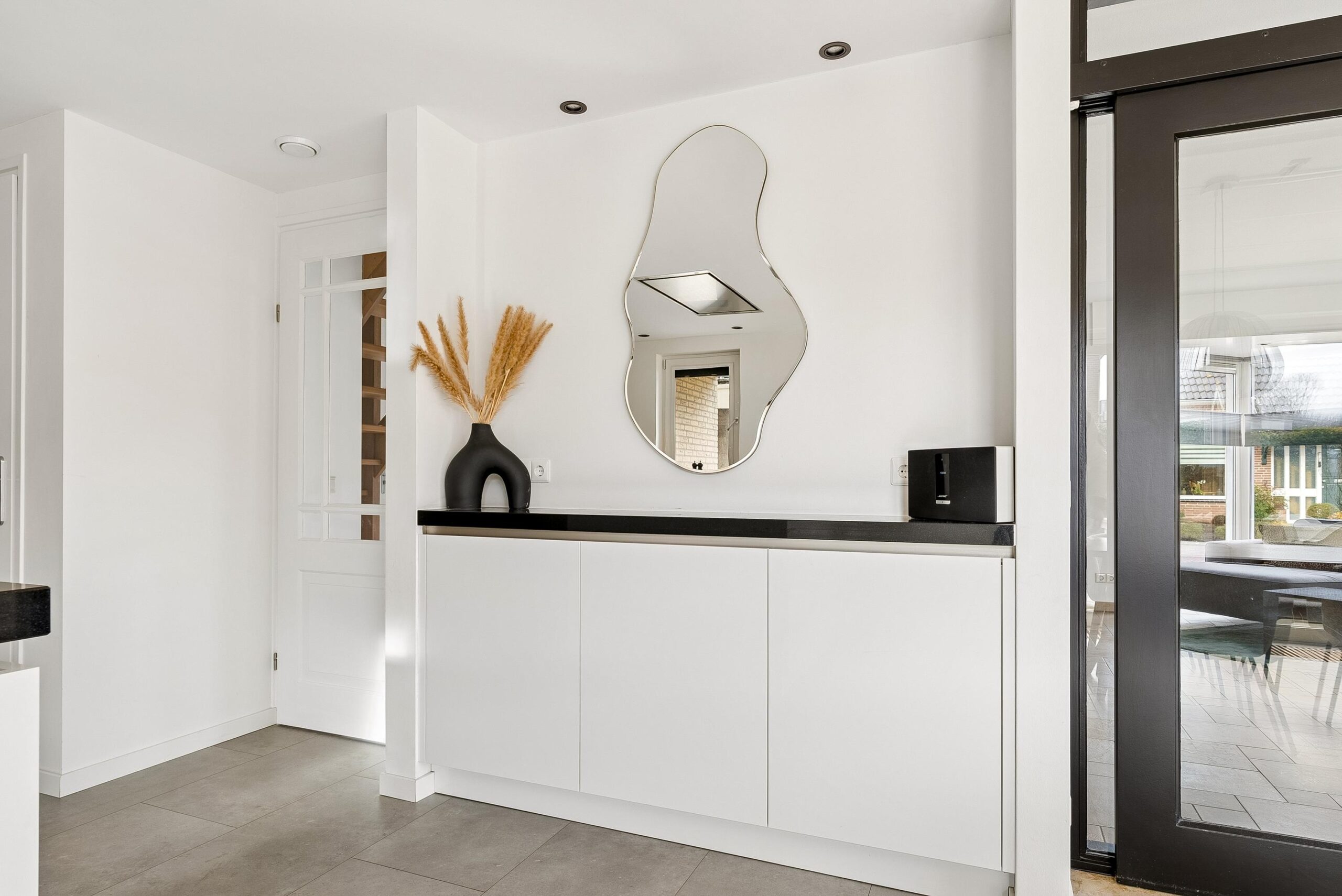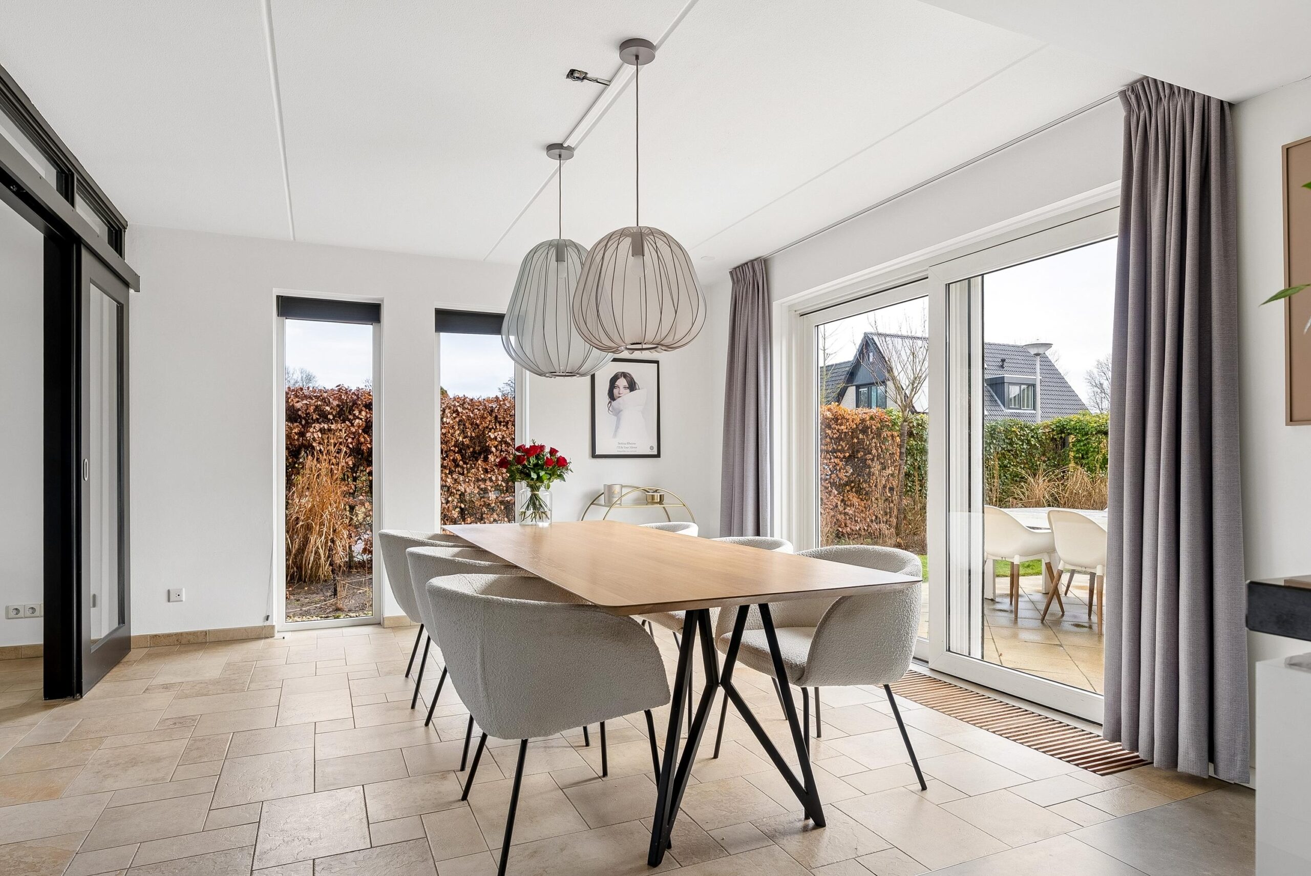 Via dubbele schuifdeuren, omringd door glas, loop je door naar het eetgedeelte aan de achterzijde. Door deze indeling kun je de ruimtes van elkaar scheiden of juist één groot geheel maken.