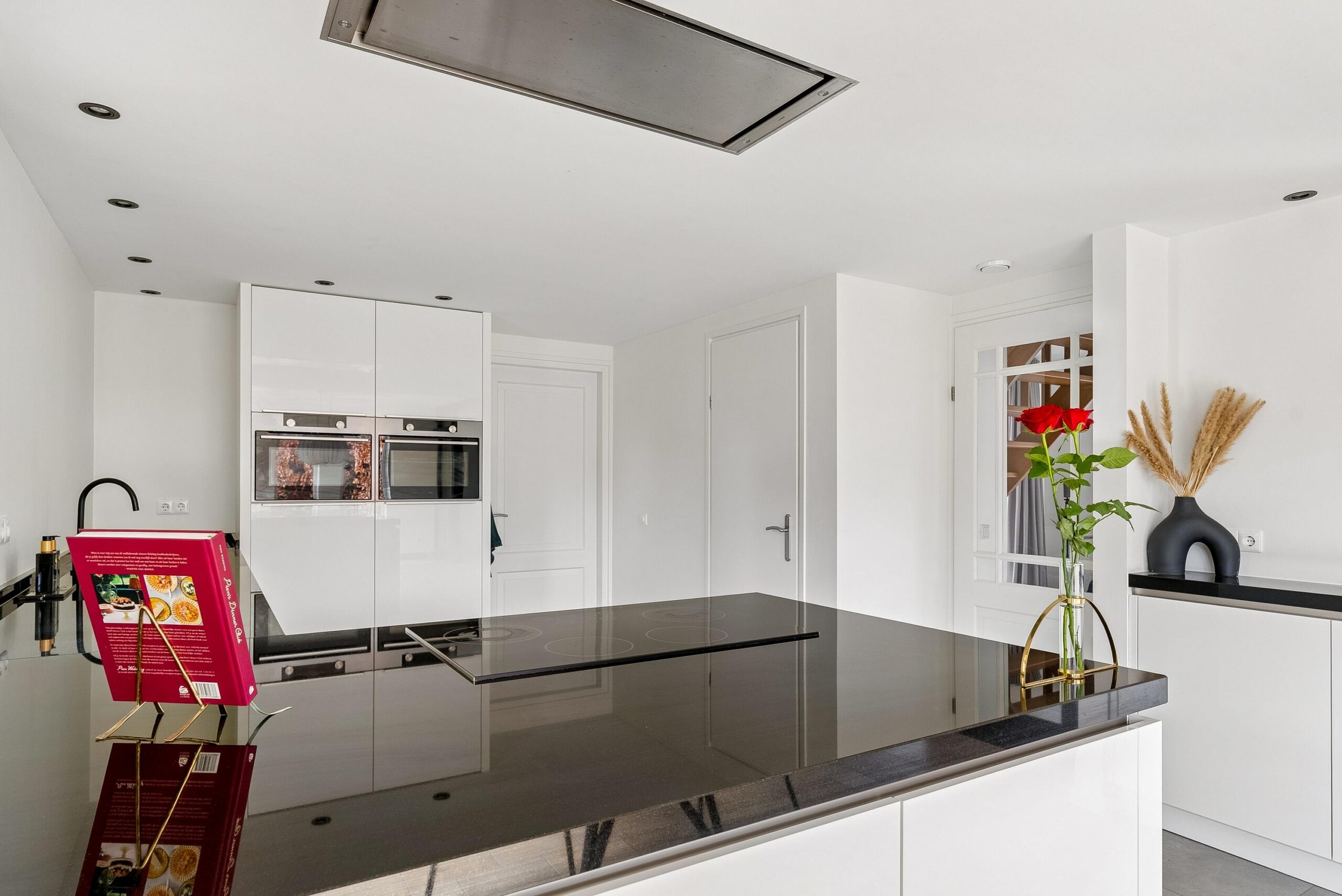 In het verlengde bevindt zich de in 2019 vernieuwde open keuken in L-opstelling. De keuken is strak afgewerkt en voorzien van hoogwaardige inbouwapparatuur, waaronder een inductiekookplaat, natuurstenen werkblad, geïntegreerde plafondafzuiging, oven, combi-oven-magnetron, vaatwasser en een grote koelkast. De aparte provisiekast maakt het geheel extra praktisch.
