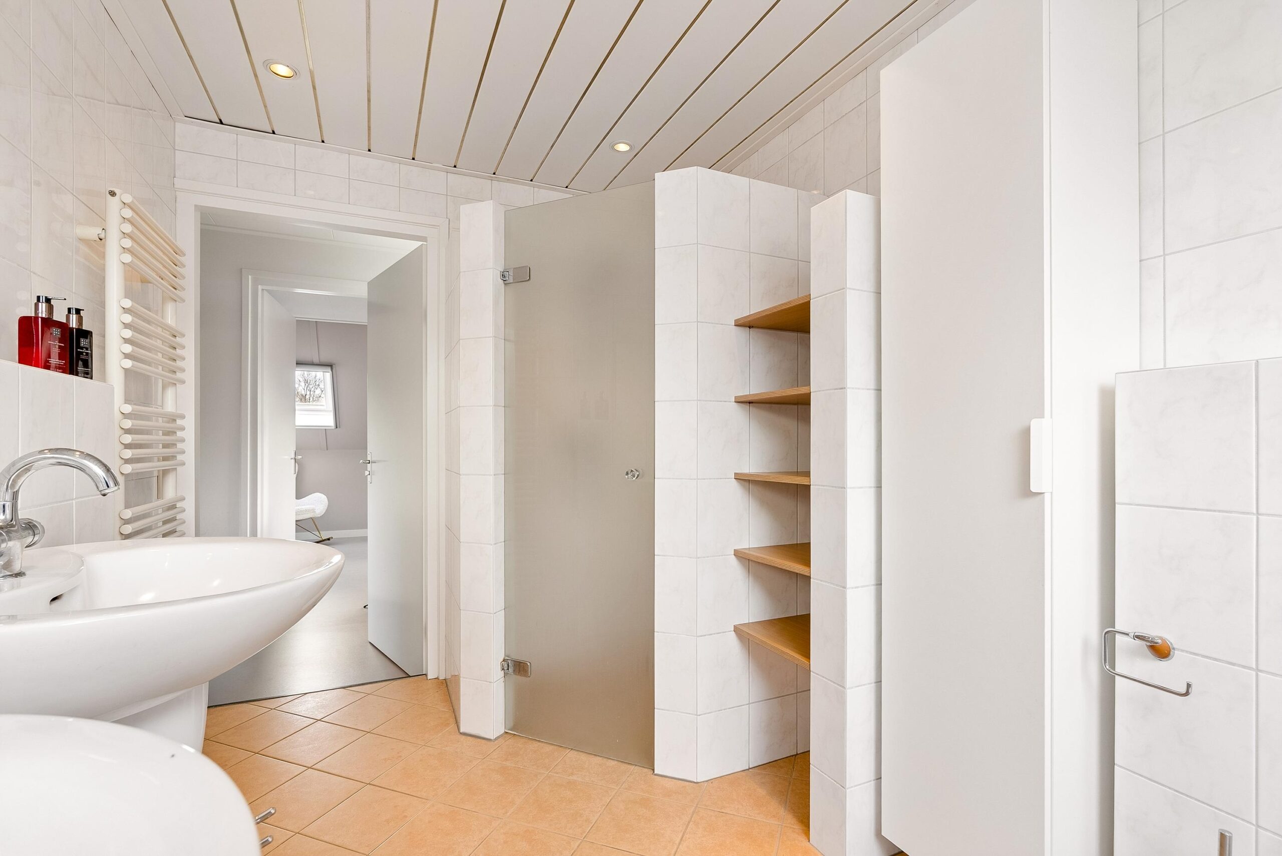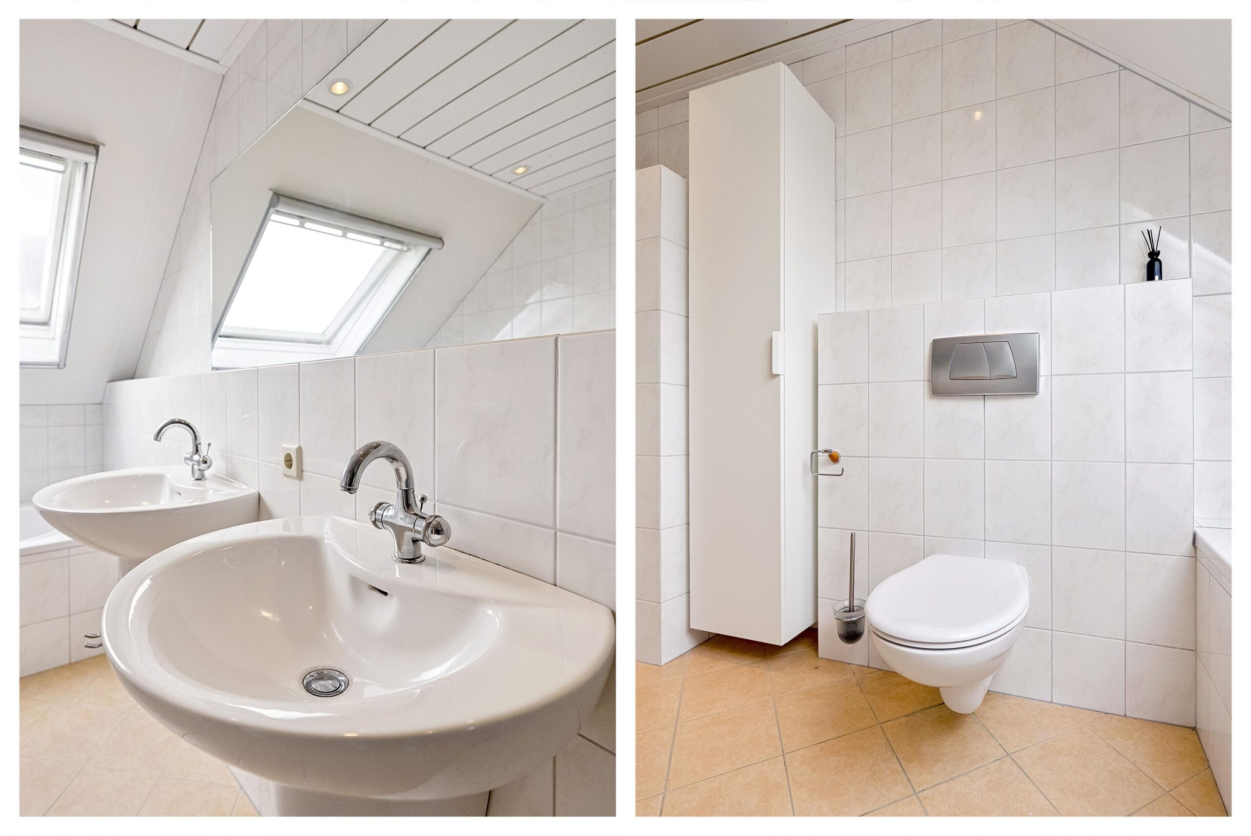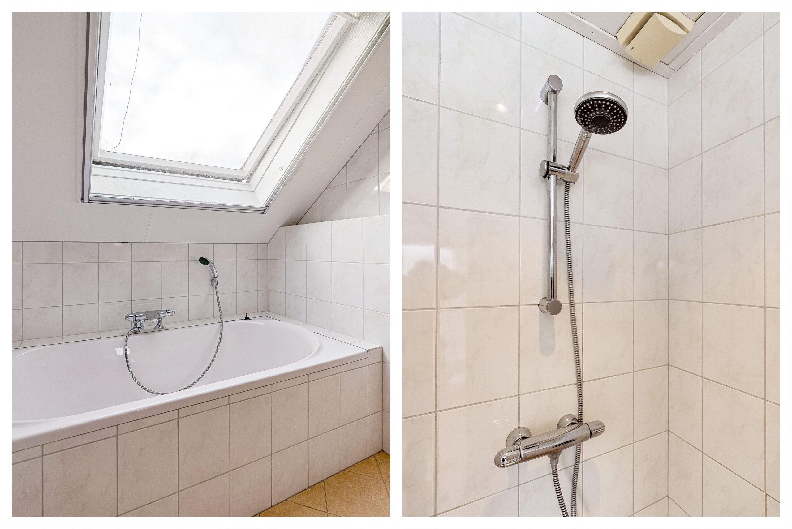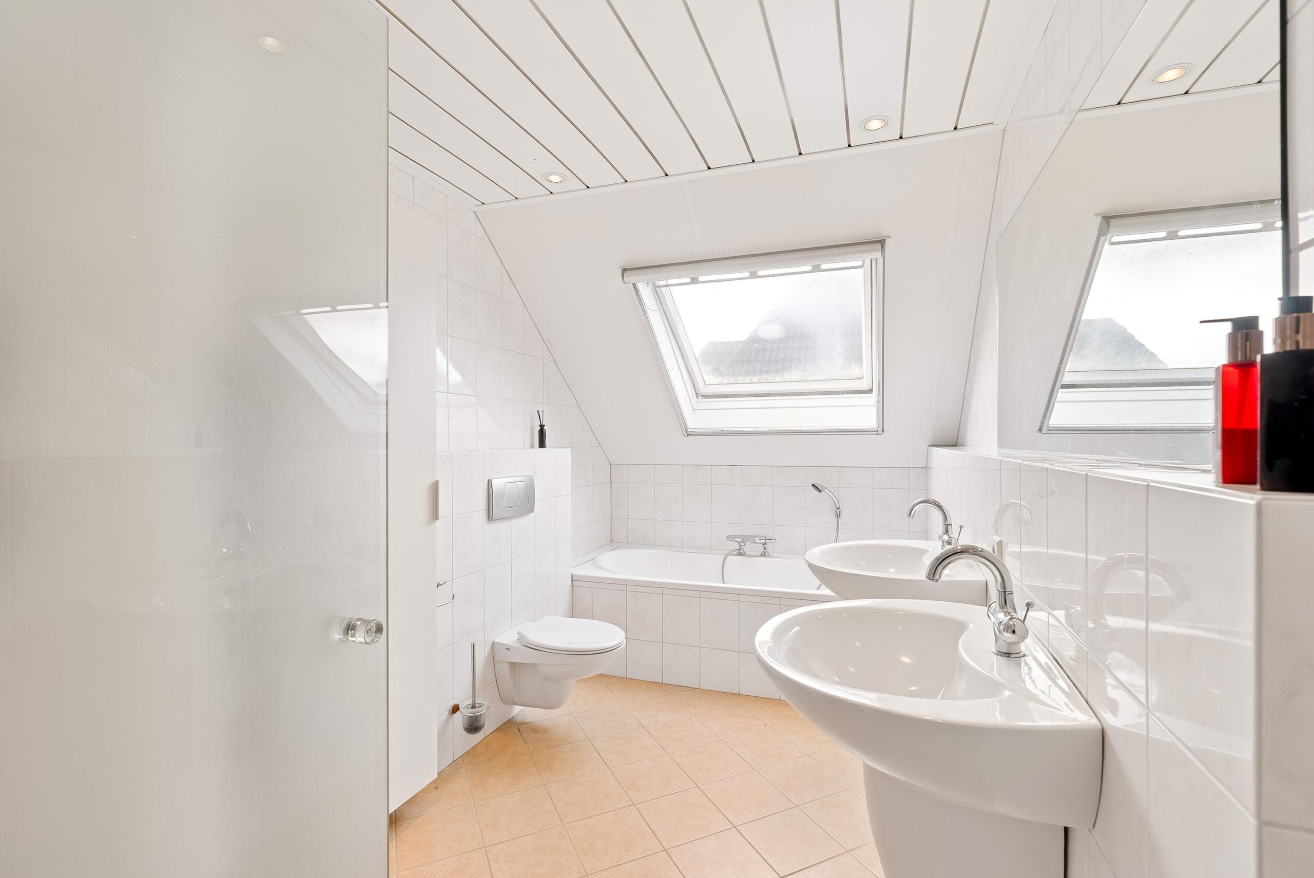 De badkamer is volledig betegeld en ruim van opzet. Dankzij de dakramen geniet je hier van natuurlijk licht en ventilatie. Je beschikt over een ligbad, een ruime inloopdouche, een dubbele wastafel, een wandcloset, designradiator, spotverlichting en vloerverwarming. Een complete en verzorgde badkamer waar je alle ruimte hebt voor je dagelijkse routines.