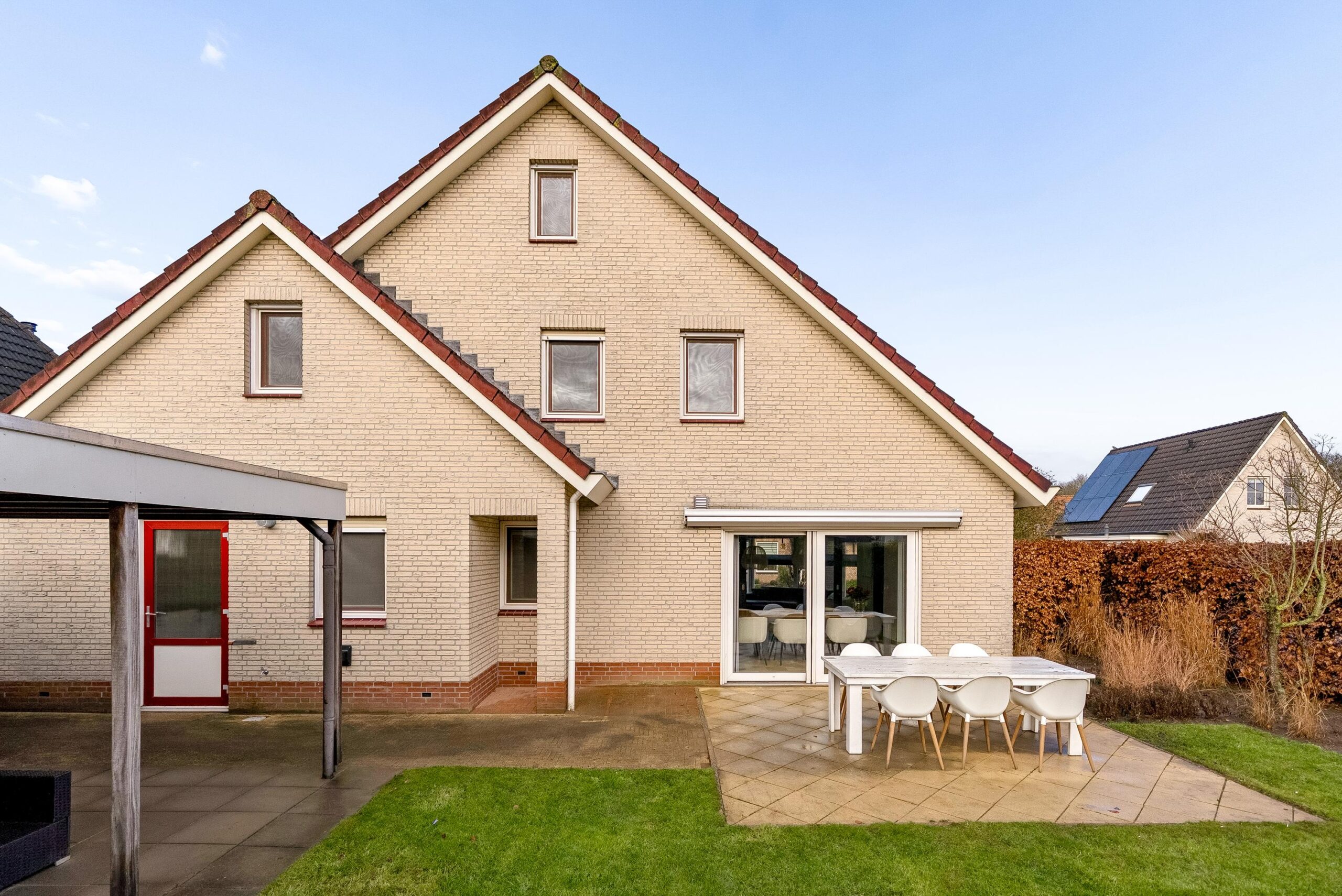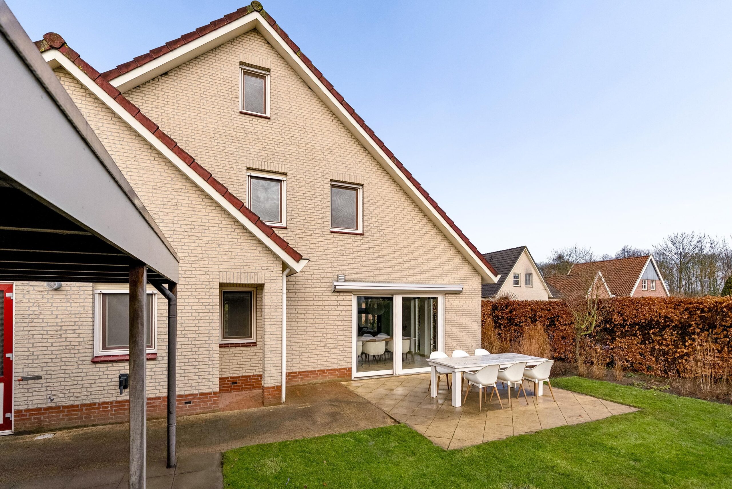 Via de royale oprit met overkapt gedeelte bereik je de entree van de woning. De aangebouwde stenen garage, momenteel ingericht als bijkeuken, zorgt voor veel praktische ruimte en is zowel vanaf de oprit als vanuit de achtertuin toegankelijk.