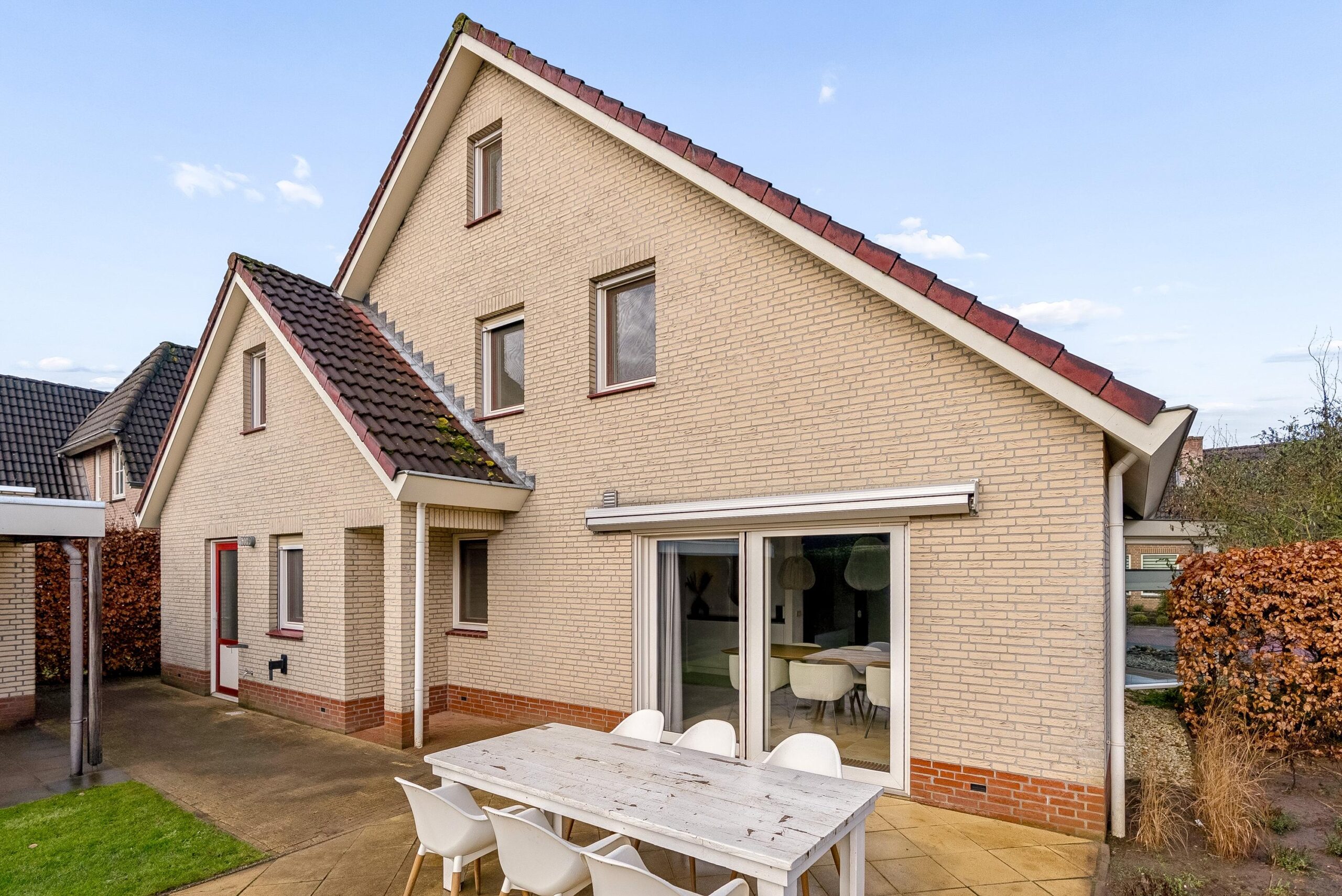Via de schuifpui stap je direct het terras op. Hier kun je heerlijk buiten eten of ontspannen. Het elektrische zonnescherm zorgt ervoor dat je ook op warme dagen aangenaam buiten kunt zitten.