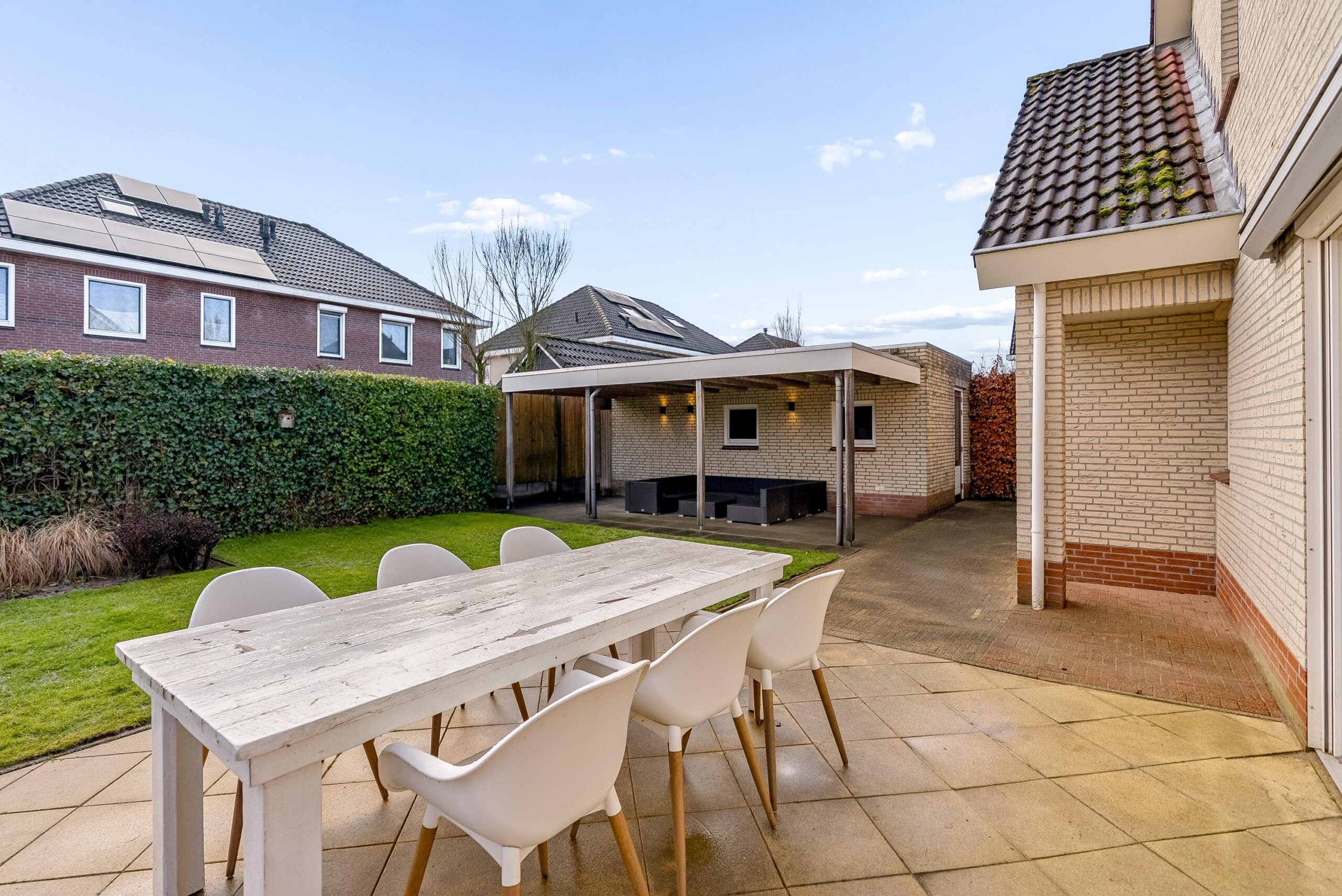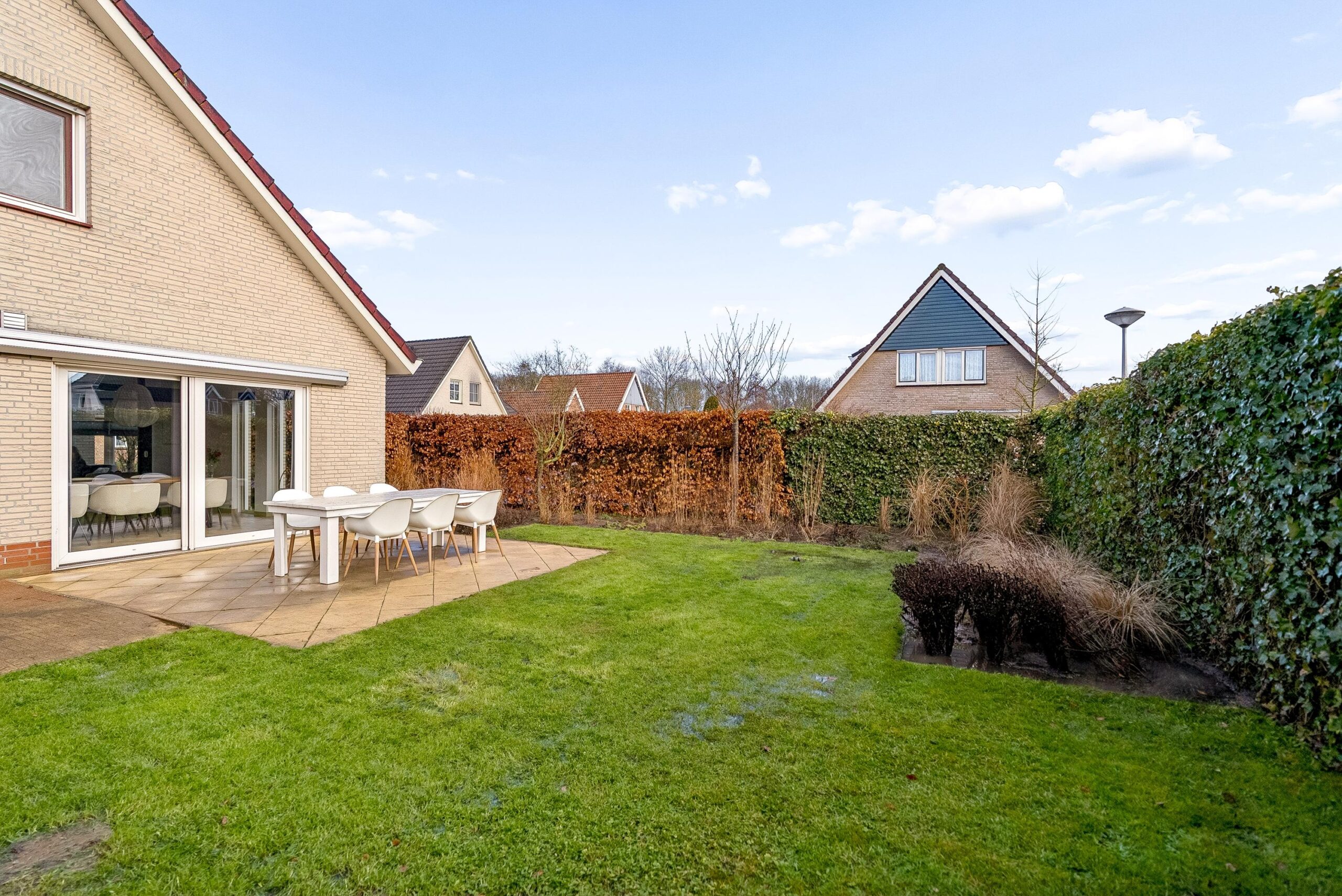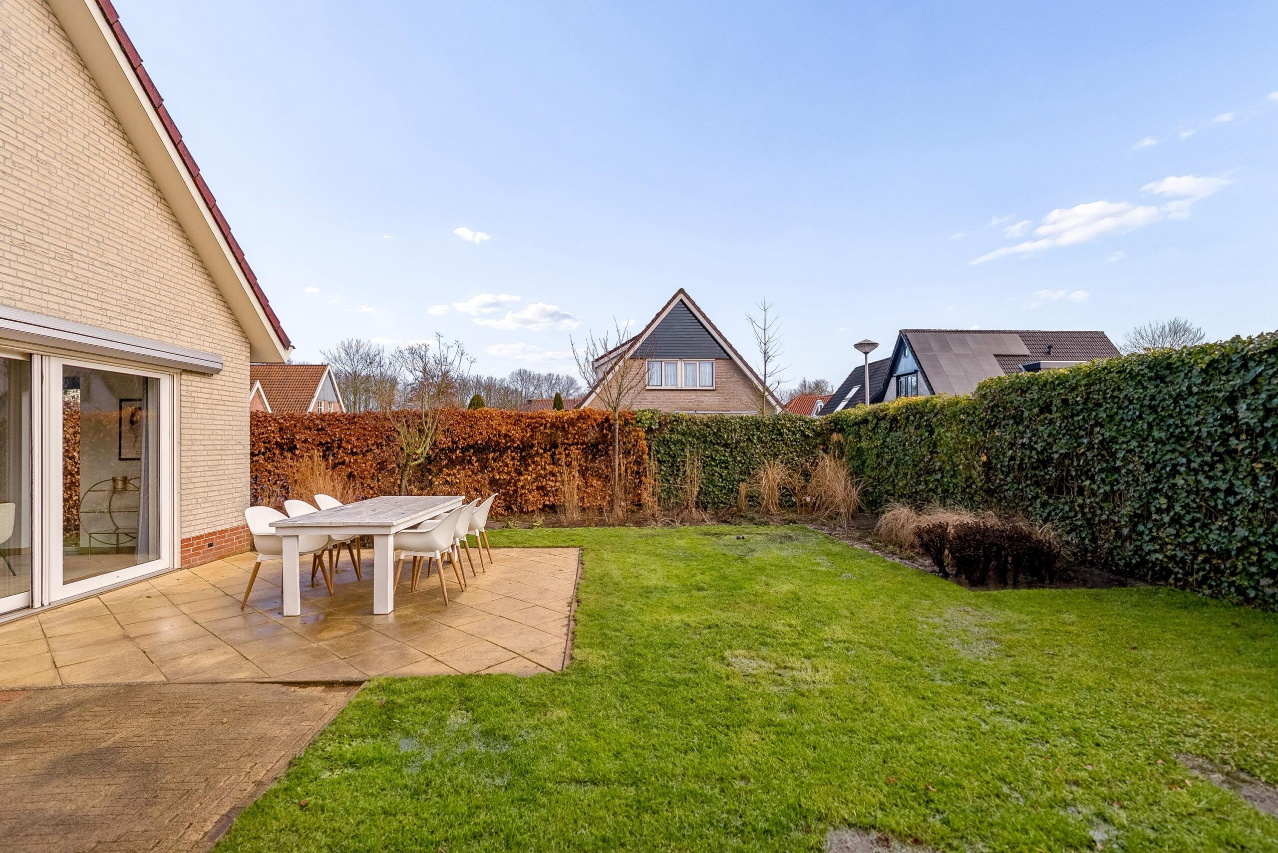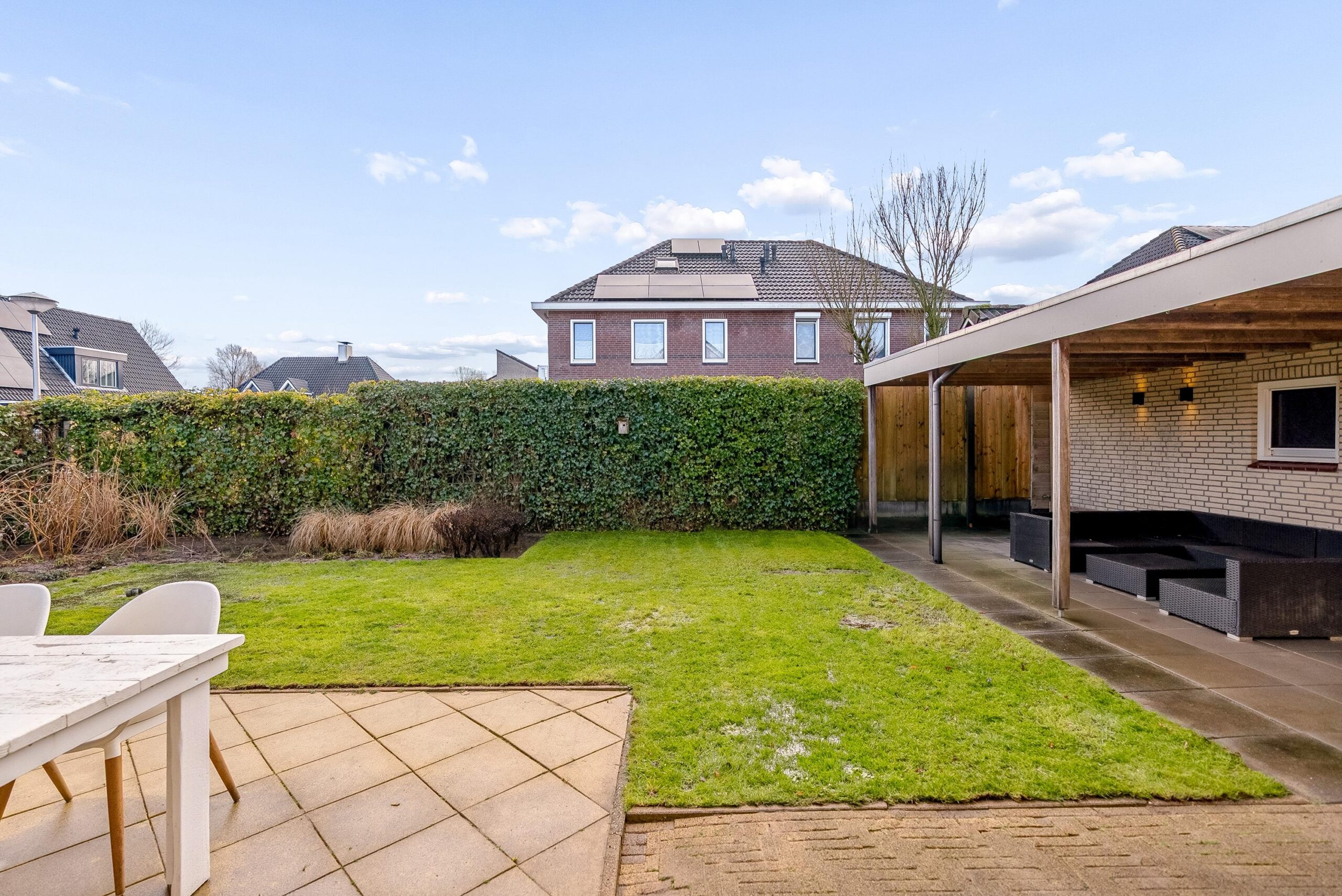 De groene erfafscheidingen zorgen voor privacy en via de zijkant van de woning kun je rondom het huis lopen.