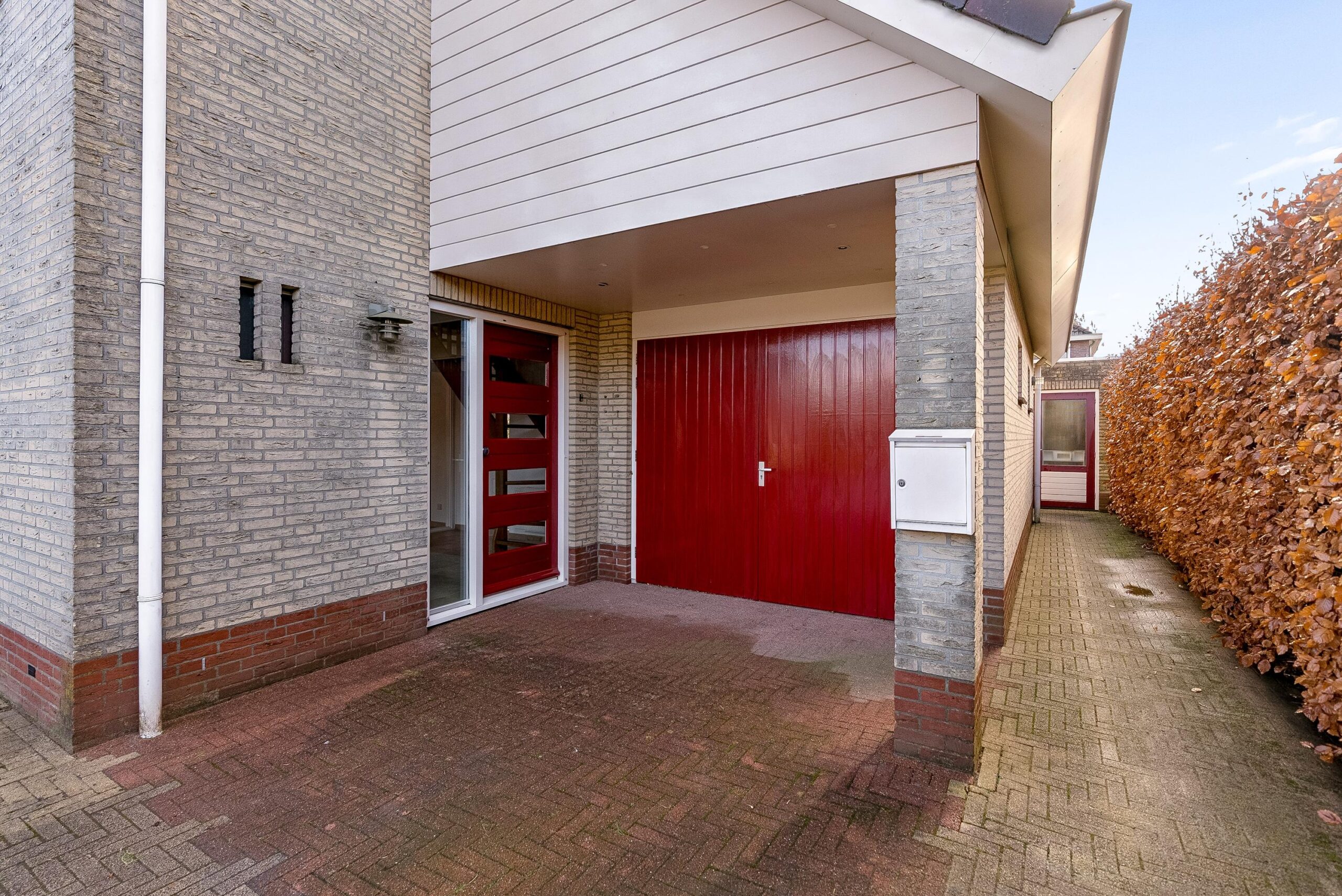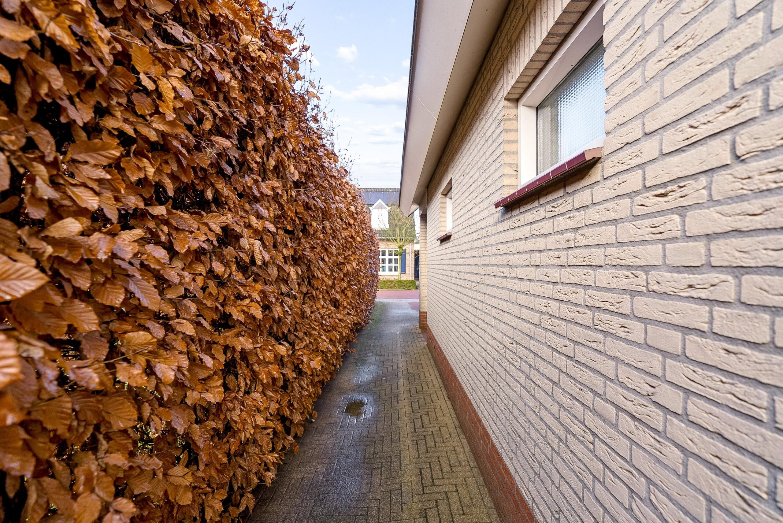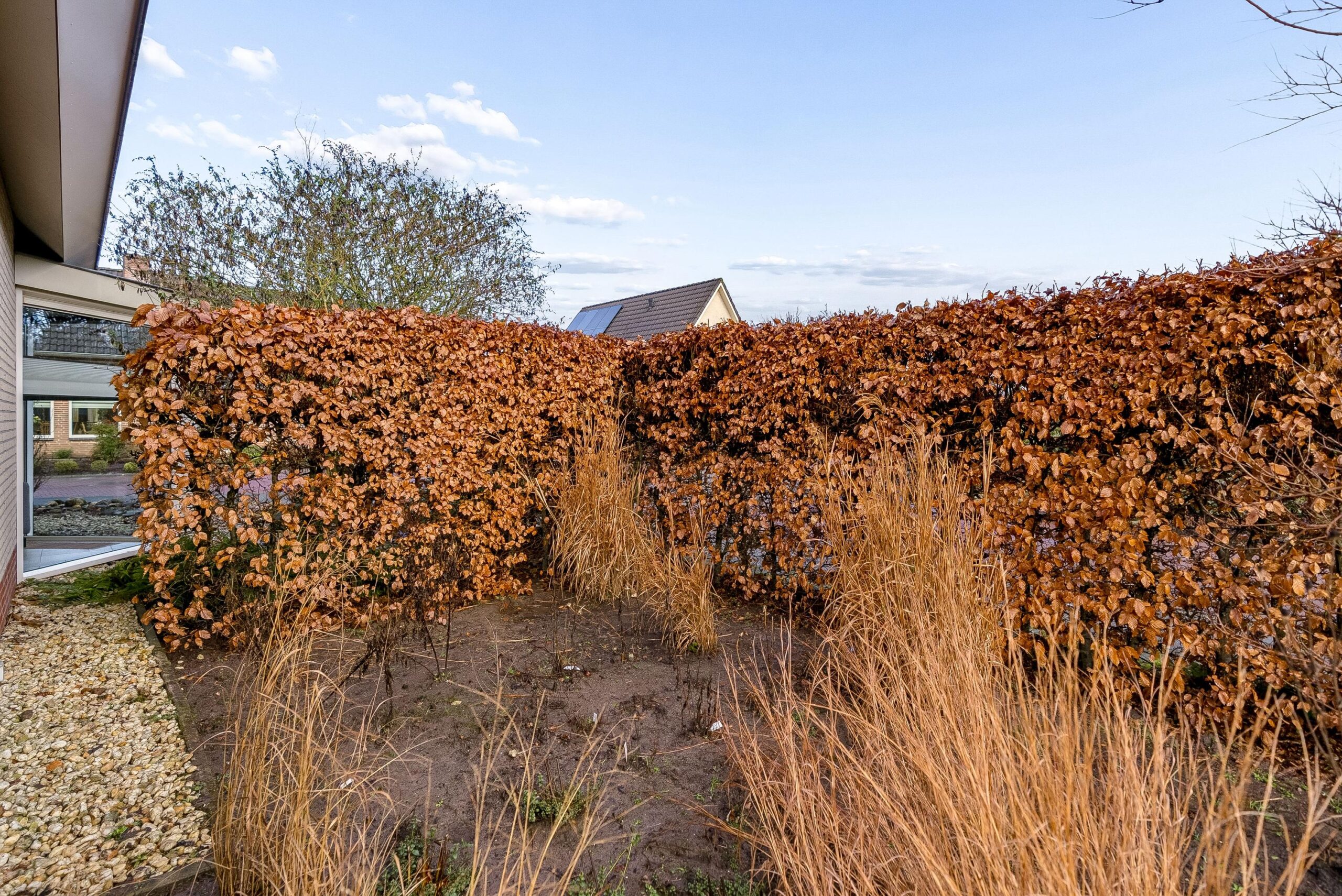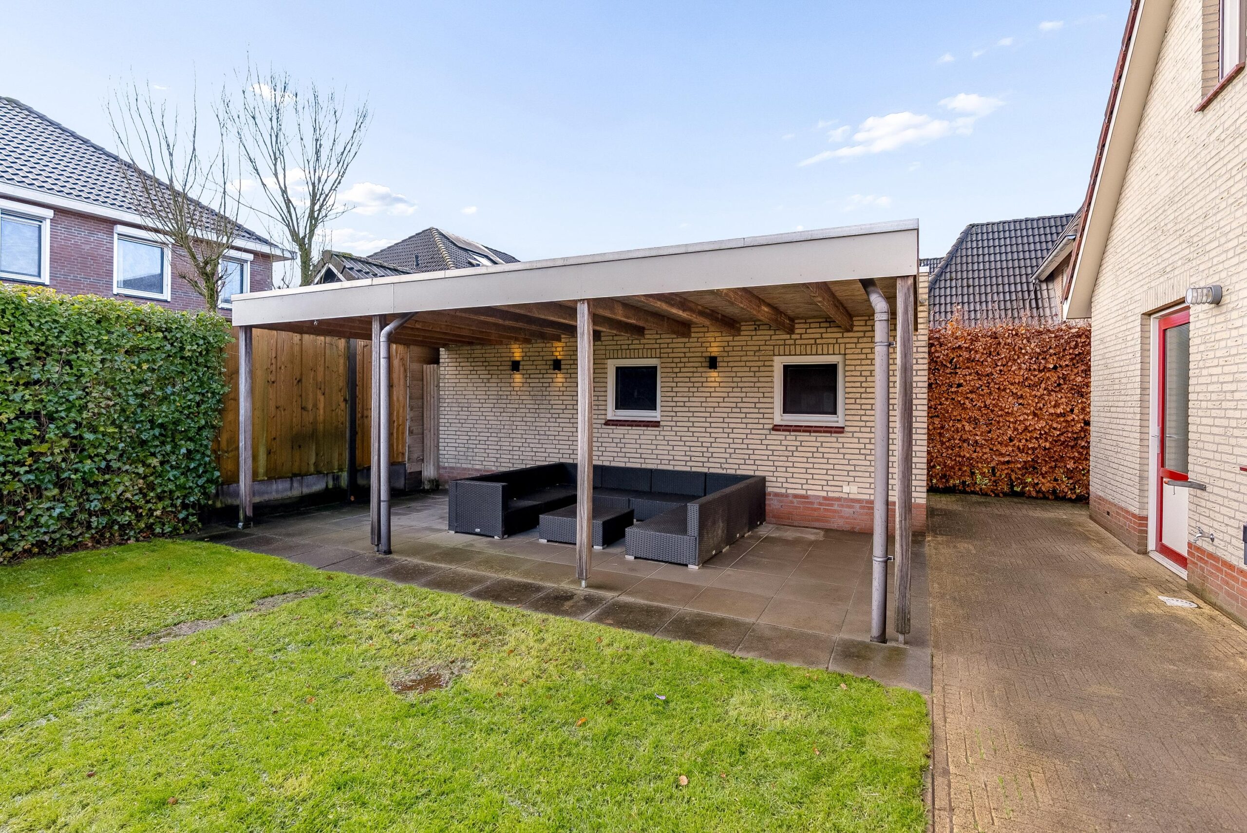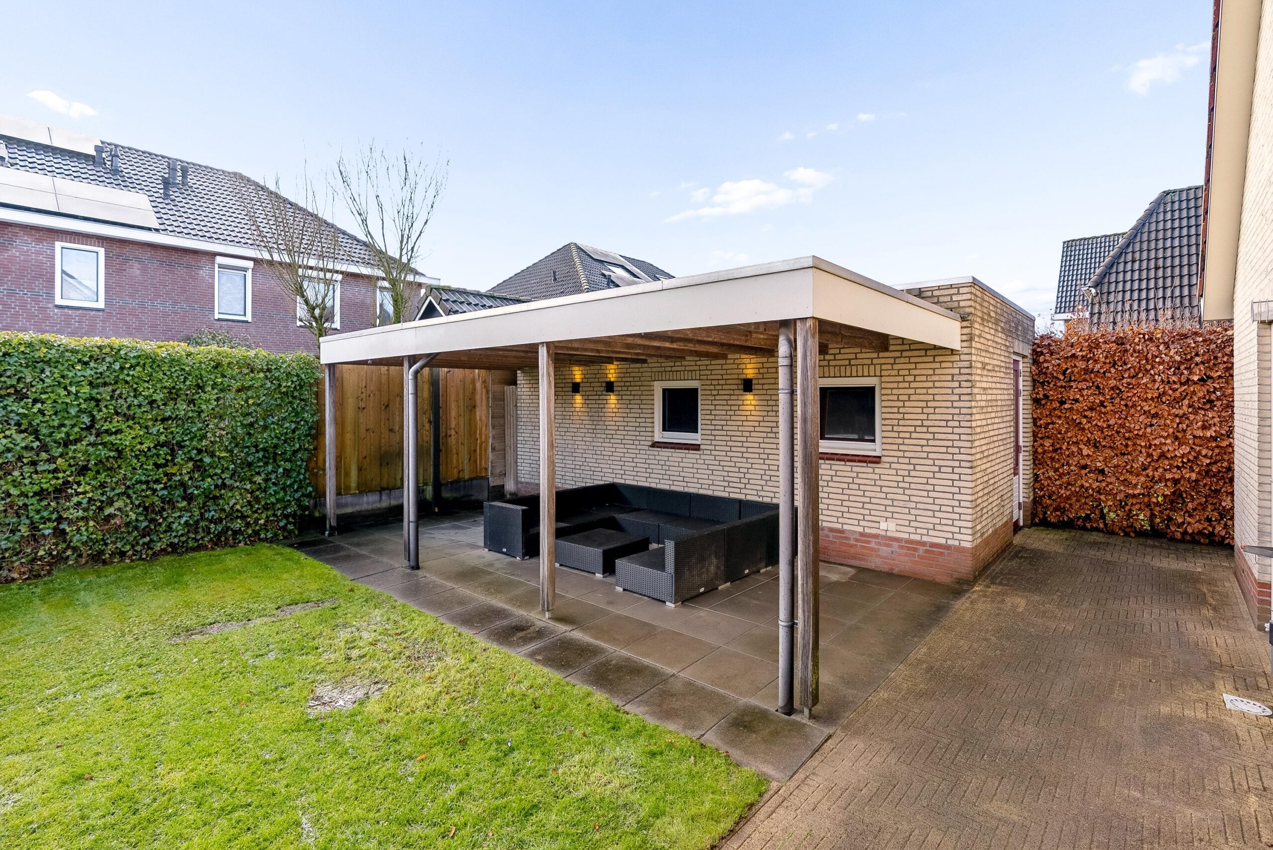 De groene erfafscheidingen zorgen voor privacy en via de zijkant van de woning kun je rondom het huis lopen.