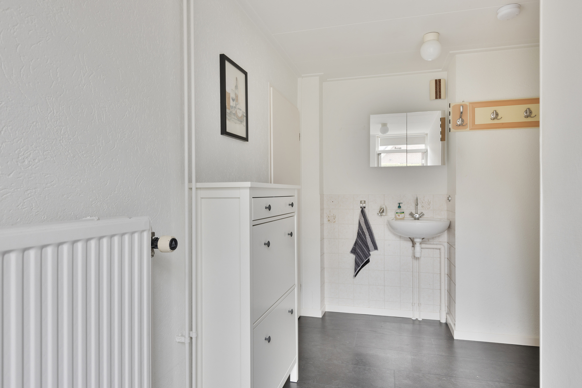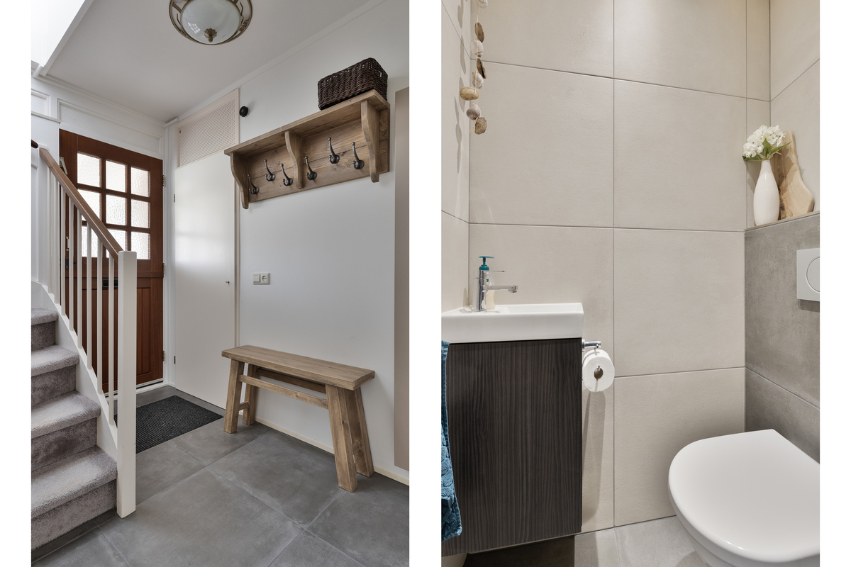 In de entreehal is direct te zien hoe netjes deze woning is. Je vindt hier de meterkast, een praktische plek voor de garderobe én de toiletruimte. Het toilet is modern, volledig betegeld en voorzien van een hangcloset en fonteintje. Vanuit de hal is er tevens de trapopgang naar de eerste verdieping.
