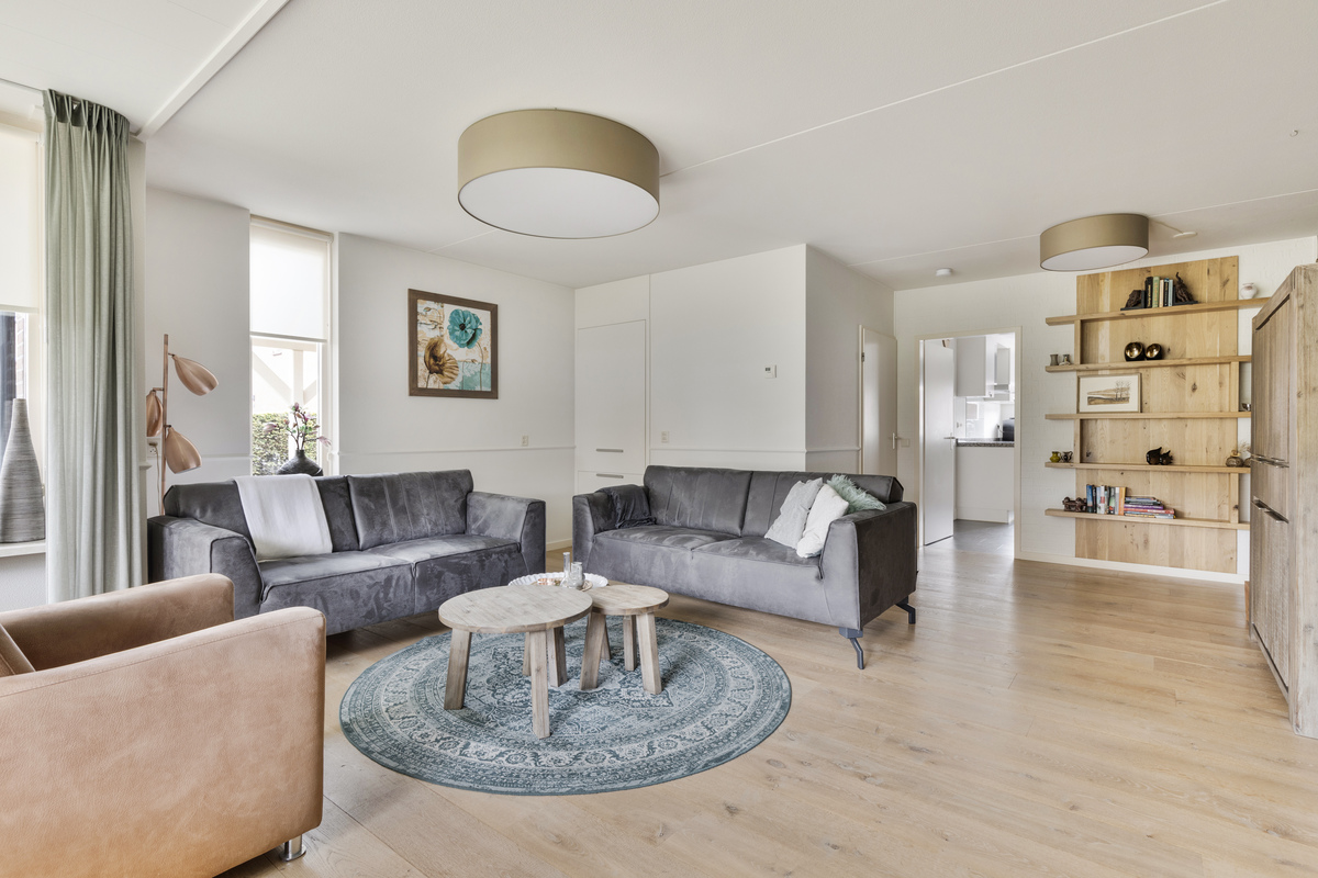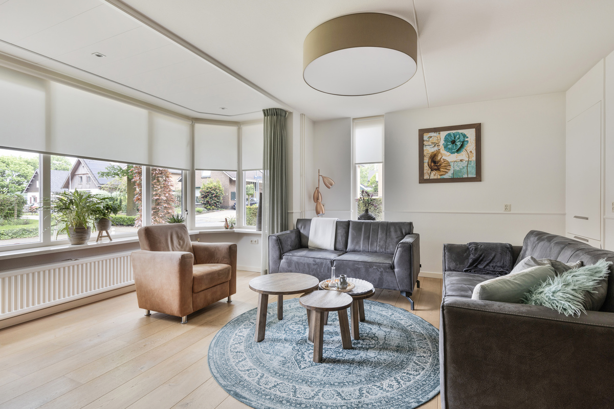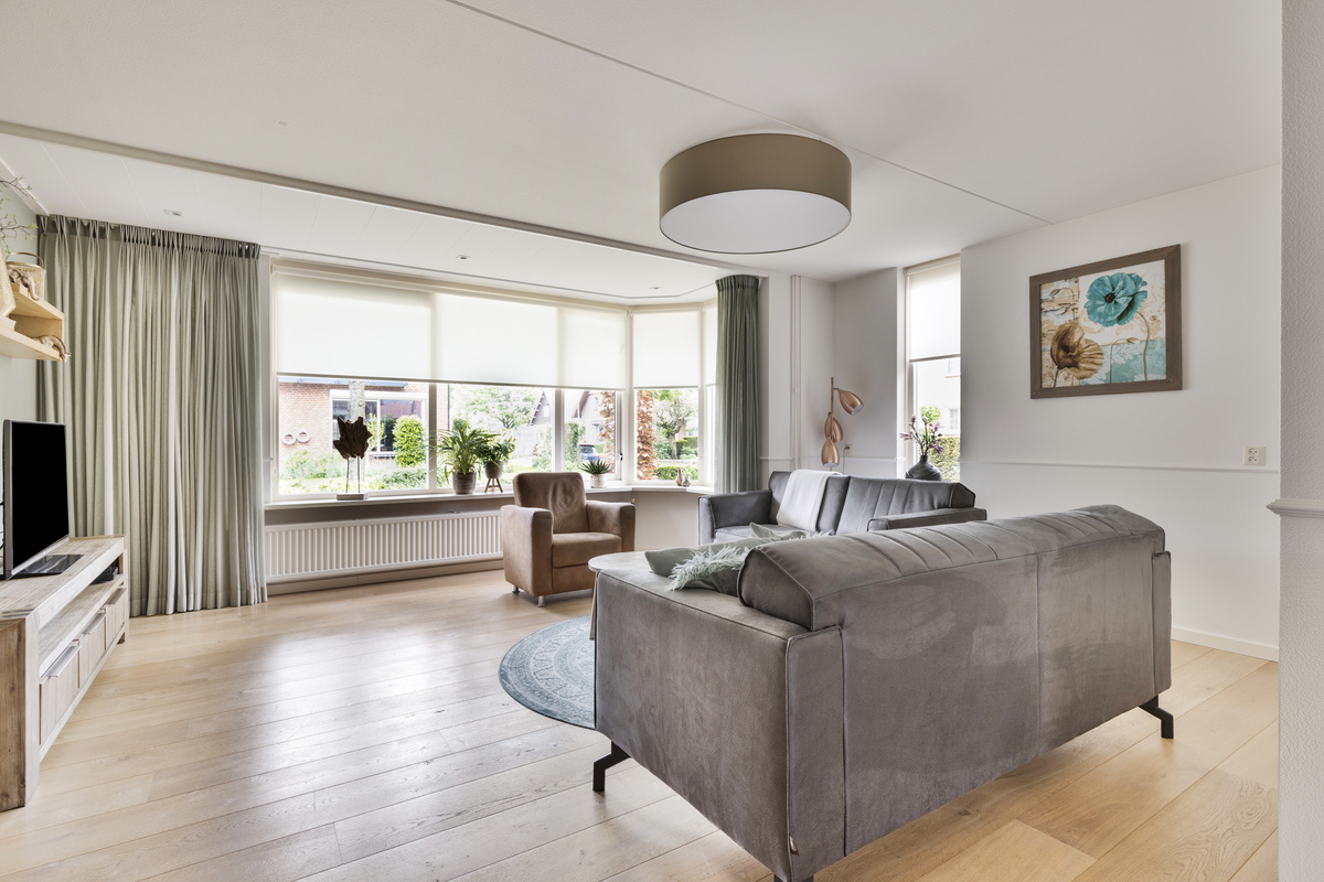De woonkamer is gelegen aan de voorzijde en is een heerlijke, lichte leefruimte dankzij de erker. De royale opzet, de nette afwerking en de warme houtlook vloer zorgen voor een moderne uitstraling met een fijne, huiselijke sfeer. Dit is echt zo’n woonkamer waar je graag thuiskomt!