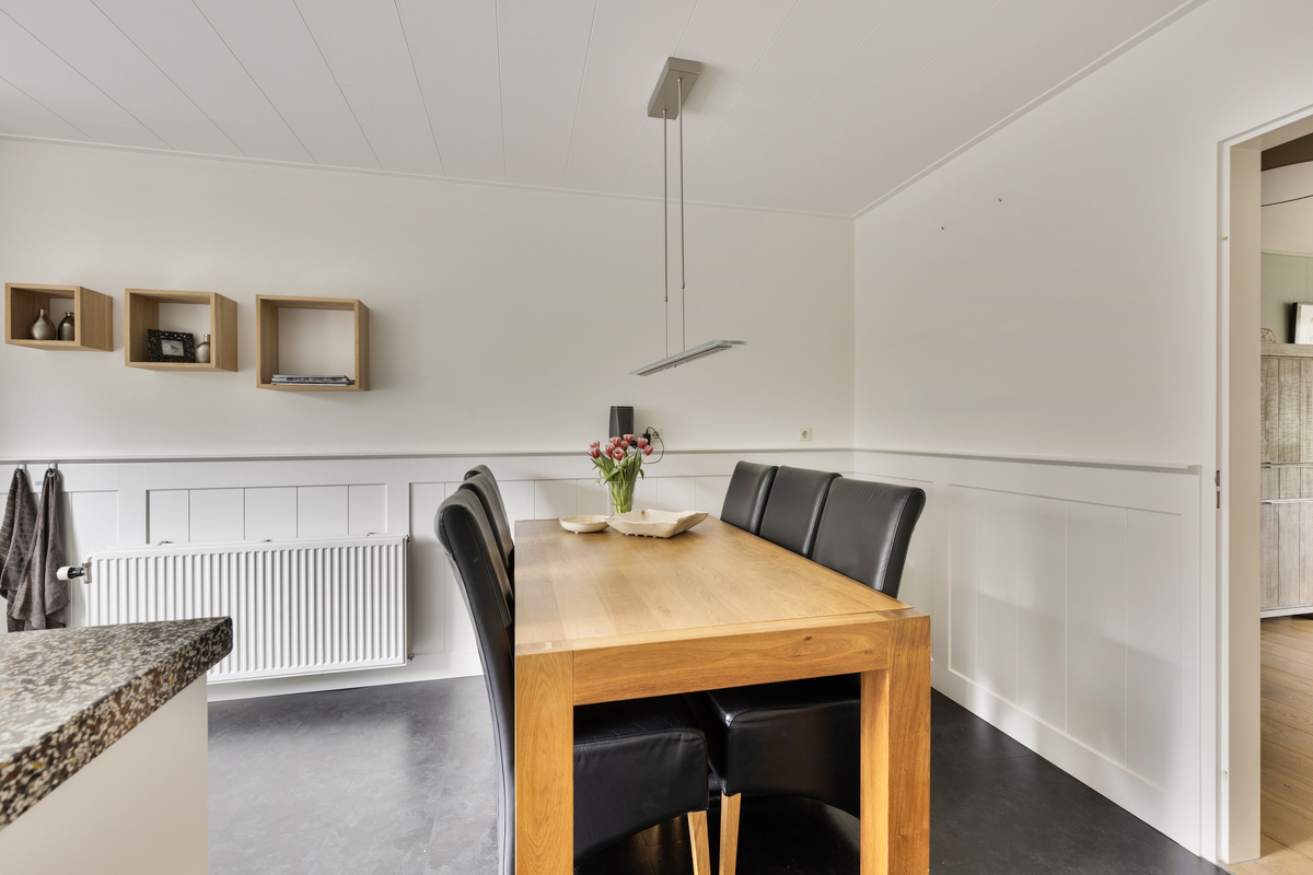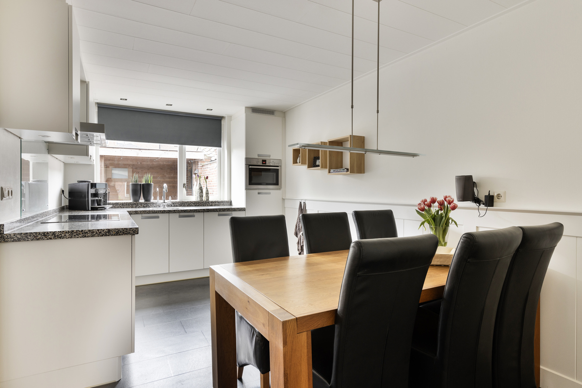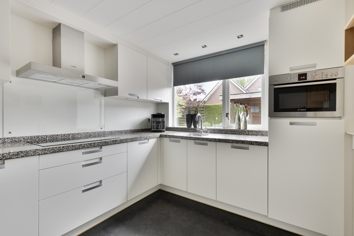 Aan de achterzijde bevindt zich de keuken: modern, strak uitgevoerd en geplaatst in een hoekopstelling. De lichte kleurstelling en het mooie uitzicht over de achtertuin maken het geheel extra aantrekkelijk. Uiteraard is de keuken voorzien van alle gewenste inbouwapparatuur, waaronder een combi-oven/magnetron, inductiekookplaat, vaatwasser, grote koelkast en volop kastruimte.