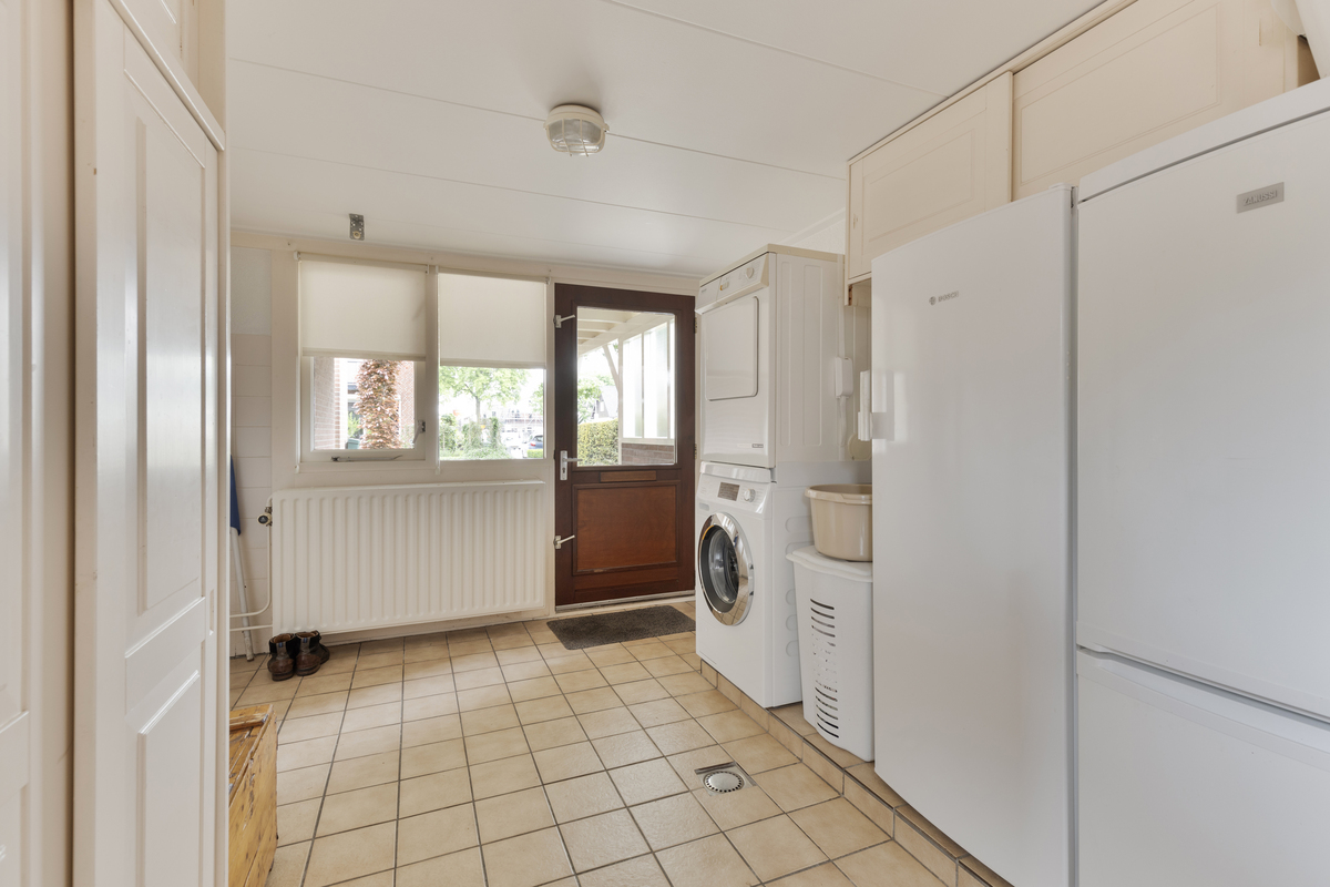 Via de keuken bereik je de bijkeuken. Een fijne extra ruimte met toegang tot de achtertuin, de kelderruimte onder de woning, een extra wastafel én de cv-opstelling.