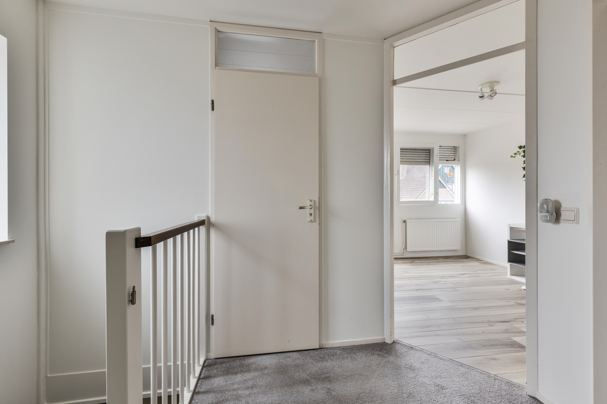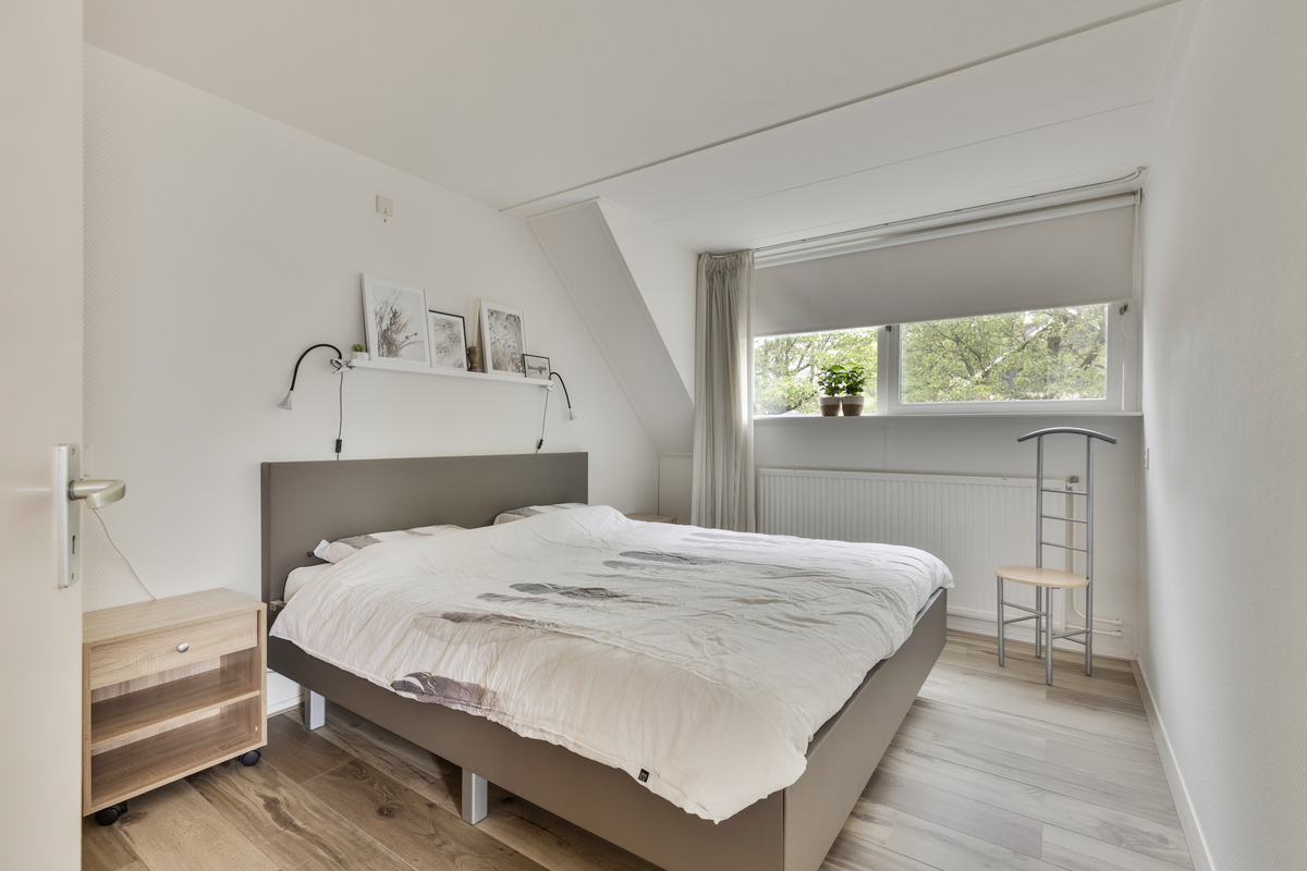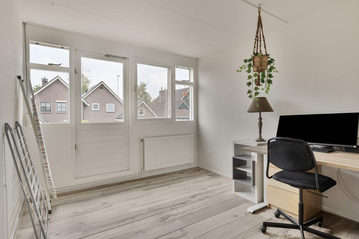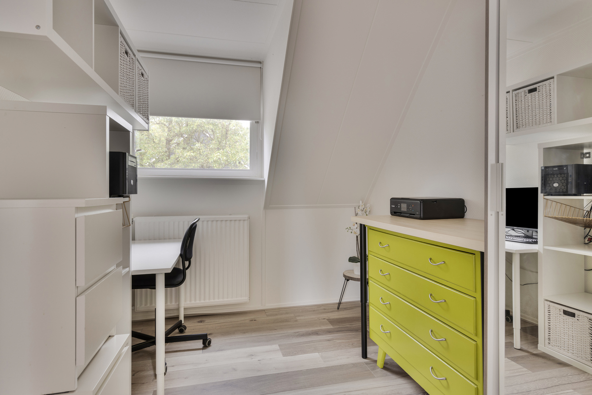 Op de eerste verdieping kom je op de overloop, die toegang biedt tot drie slaapkamers. Zowel aan de voor- als achterzijde vind je een ruim bemeten slaapkamer met grote ramen en veel lichtinval. De hoofdslaapkamer is bovendien voorzien van een vaste kastenwand. De slaapkamer aan de achterzijde heeft toegang tot het platte dak, is voorzien van een rolluik en biedt extra comfort. De derde slaapkamer aan de voorzijde is perfect als kinderkamer, werkkamer of hobbyruimte en is ook keurig afgewerkt met een nette vloer en radiatorverwarming.