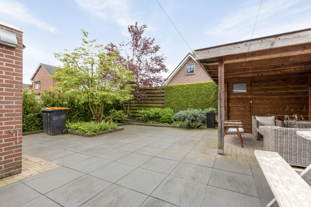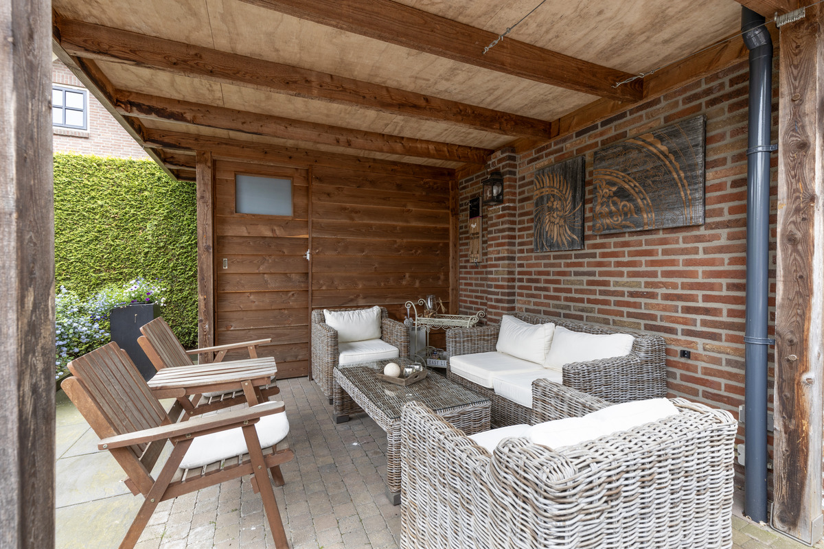Achter in de tuin staat een vrijstaande houten overkapping met een bergingsgedeelte. Een heerlijke plek om beschut te zitten, te borrelen of juist lange zomeravonden door te brengen met vrienden en familie. Hier ervaar je echt het buitenleven, zonder dat je veel tuinonderhoud hebt.