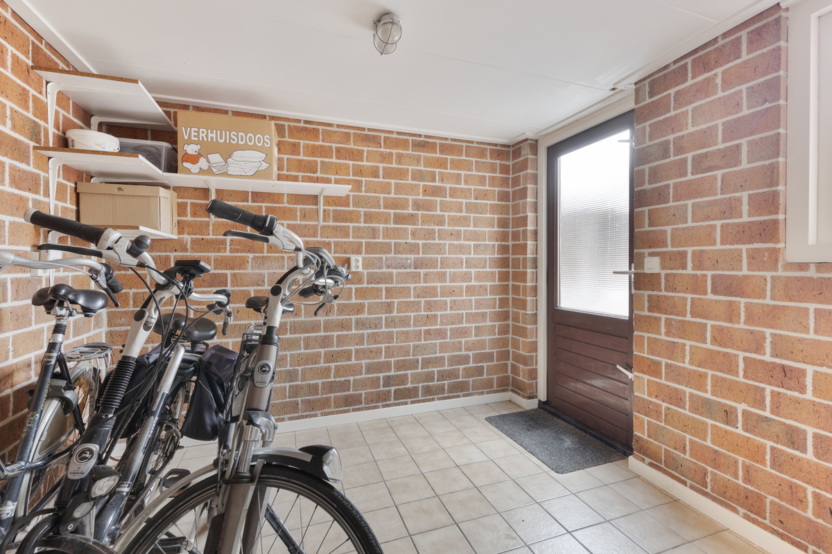 Vanuit de bijkeuken kom je in de berging. Dit is een praktische, geïsoleerde berging (dus geen garage), perfect voor fietsen, opslag en de witgoedopstelling. Extra prettig: de berging is voorzien van water, elektra én verwarming. Via een deur is de carport bereikbaar en ook via deze ruimte kun je de achtertuin in.