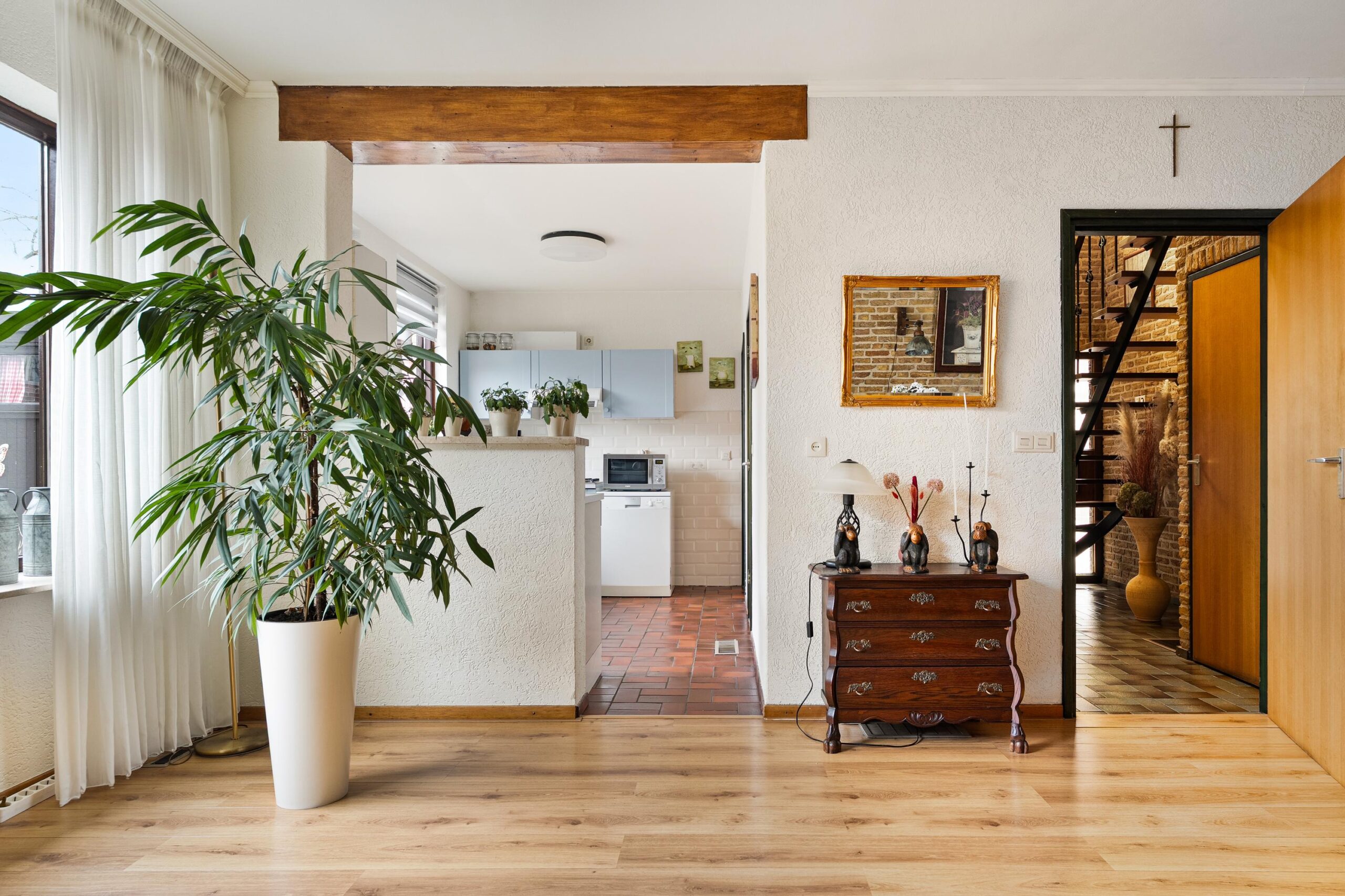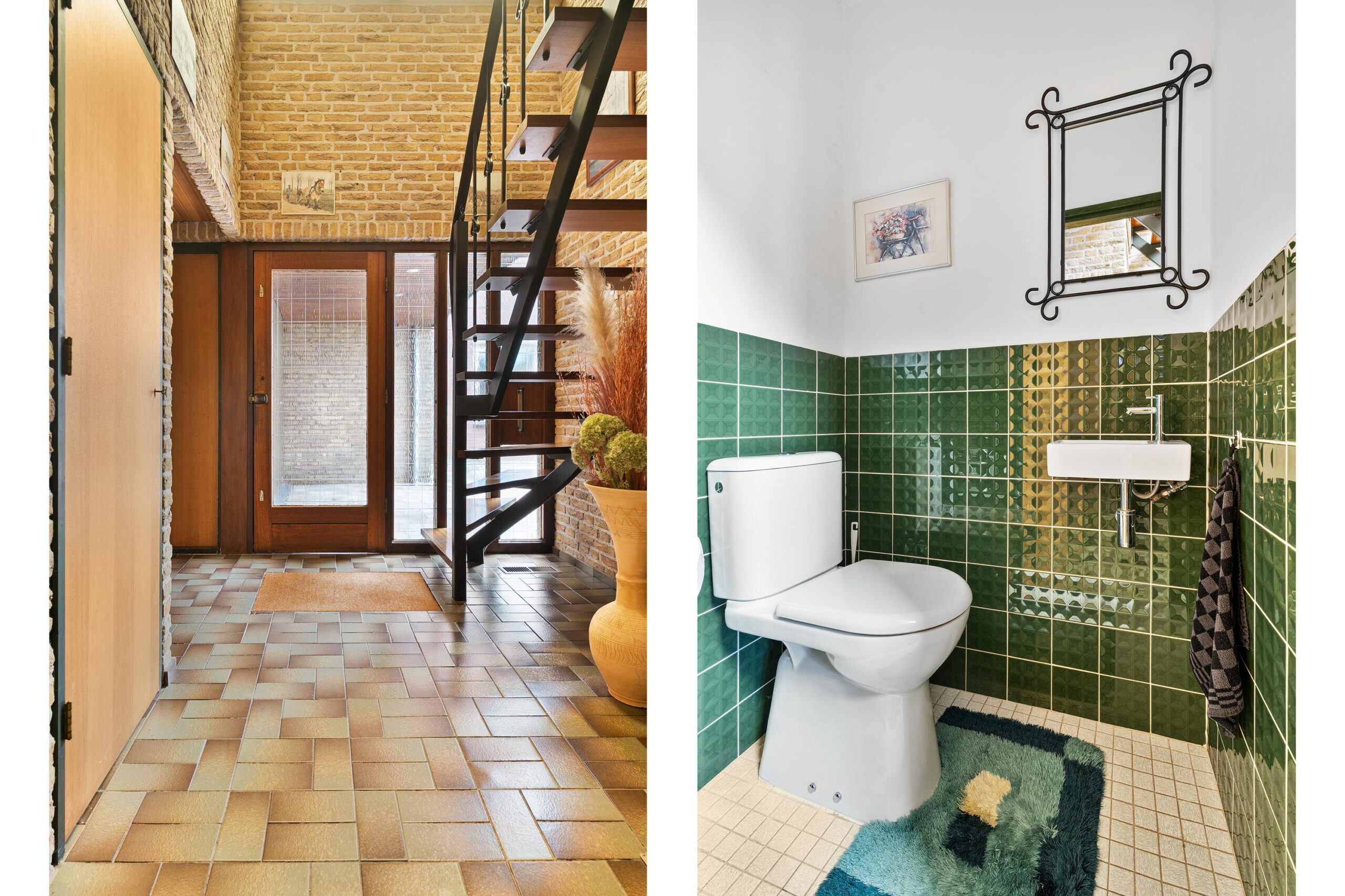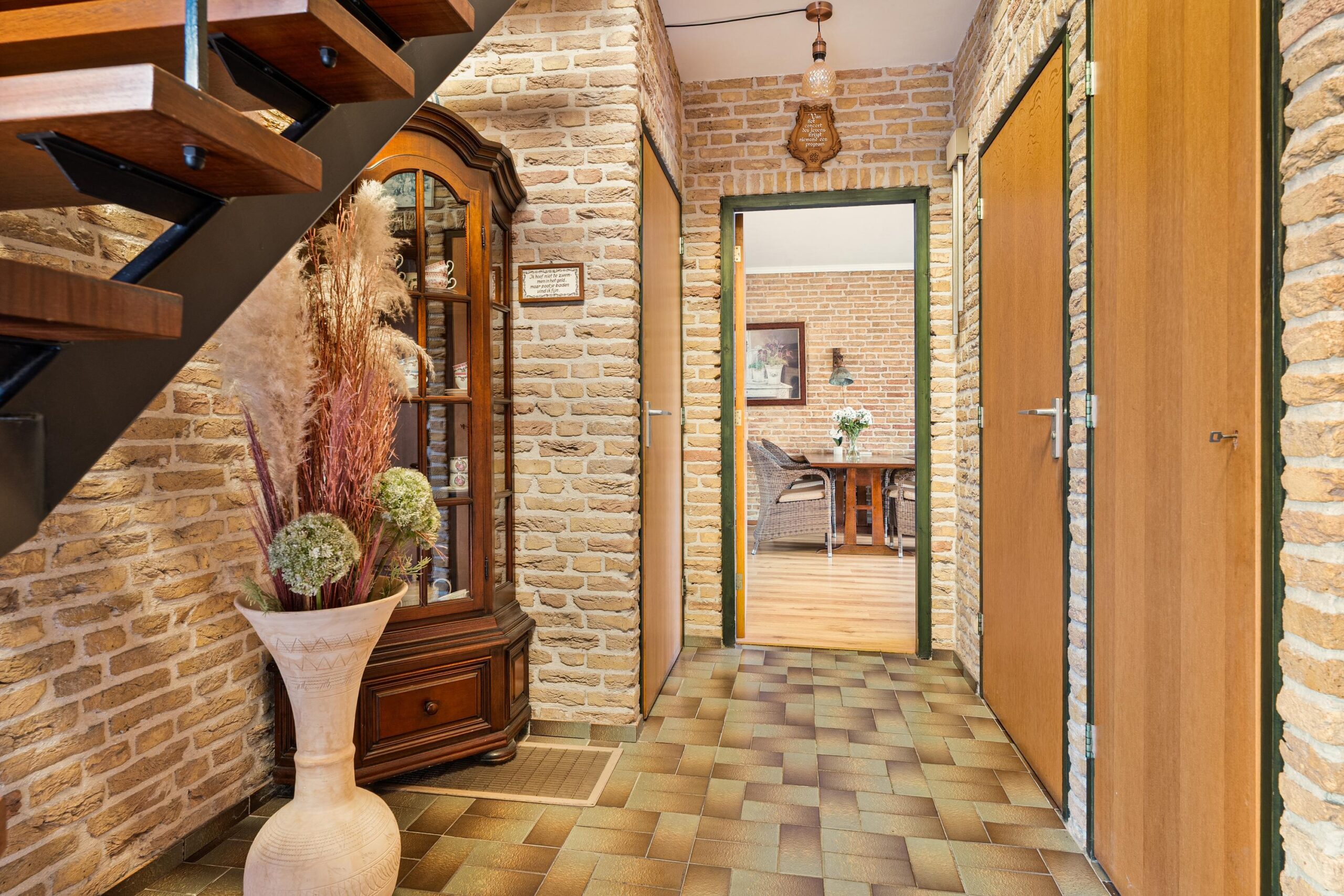 Via de royale oprit bereik je de entree aan de linkerzijde van de woning. Je komt binnen in een ruime hal met open trapopgang naar de eerste verdieping. De hal heeft een robuuste, authentieke uitstraling dankzij de plavuizenvloer en karaktervolle bakstenen wanden. Vanuit hier is er toegang tot het volledig betegelde gastentoilet met fonteintje, de meterkast en een vaste kast.