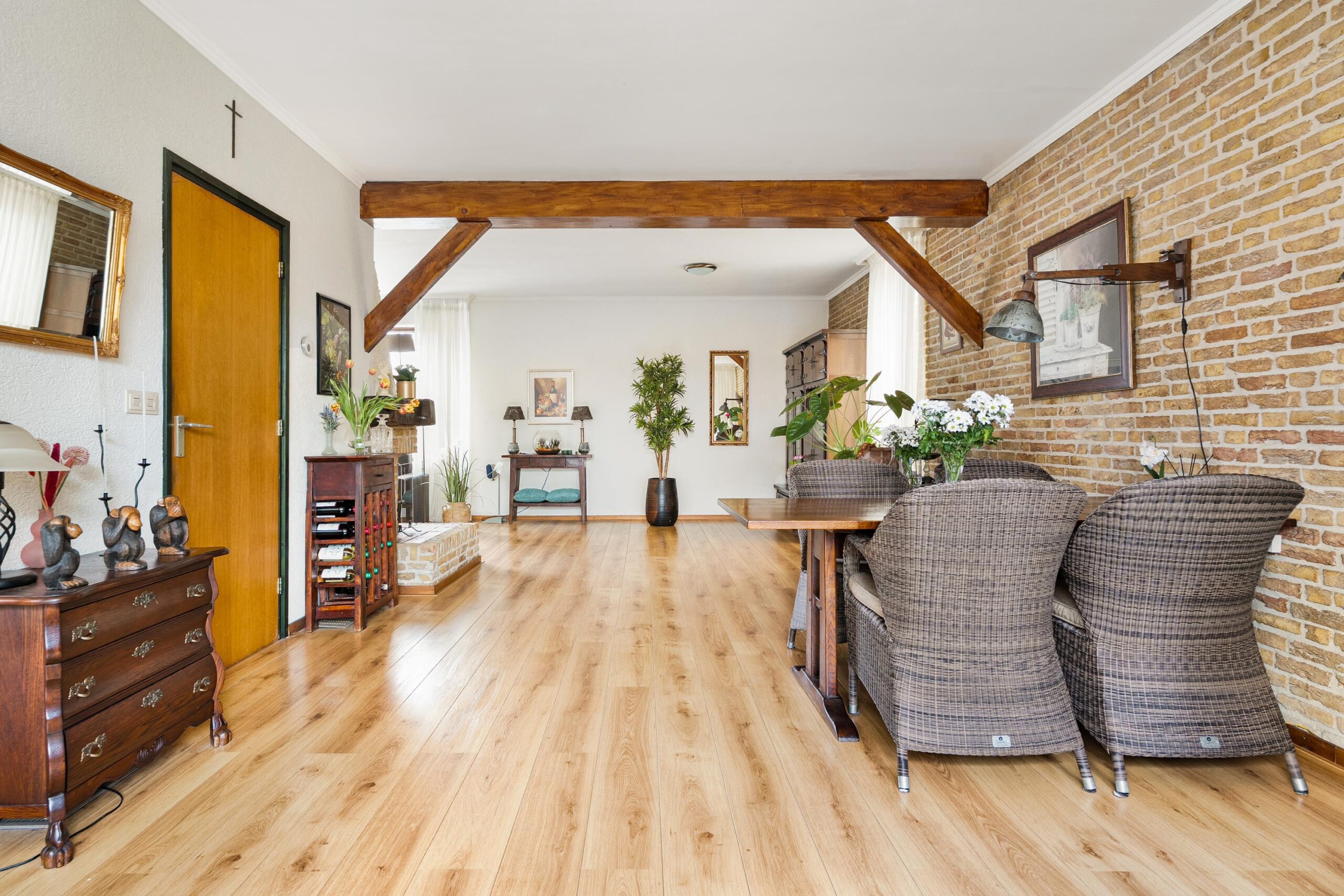 Tussen de woonkamer en keuken bevindt zich een royale tussenruimte, momenteel ingericht als eetgedeelte. Dankzij de grote raampartij aan de achterzijde is ook dit gedeelte heerlijk licht en volledig naar eigen wens in te delen.