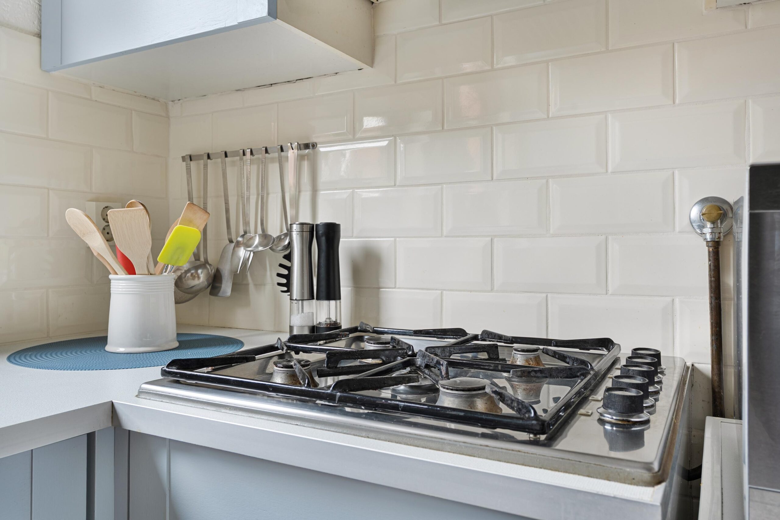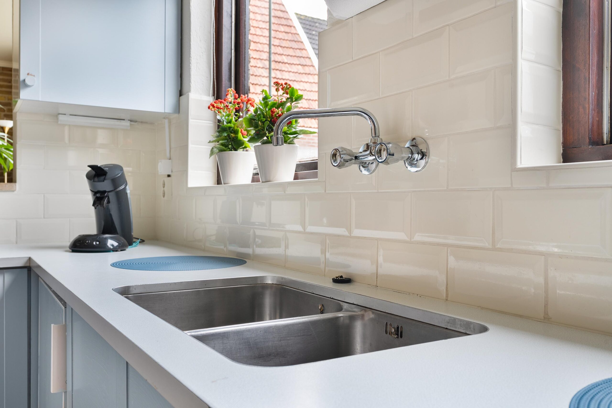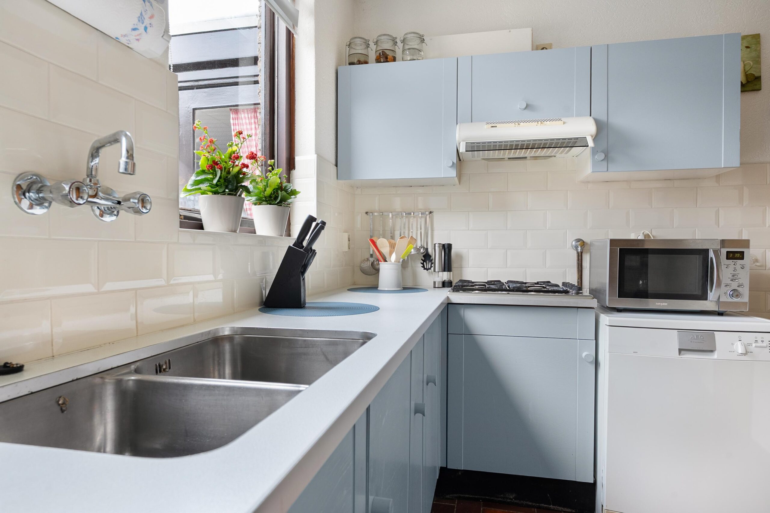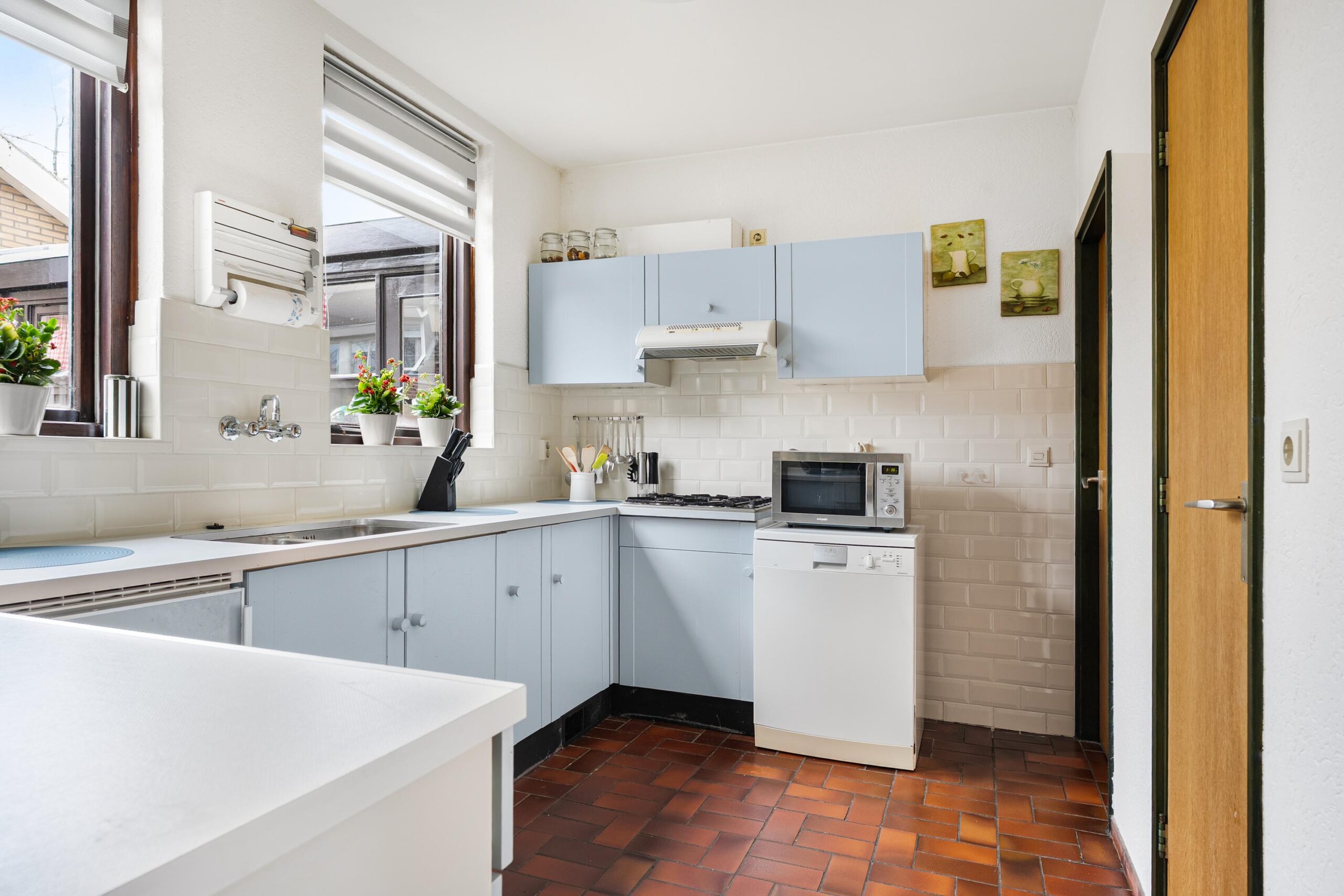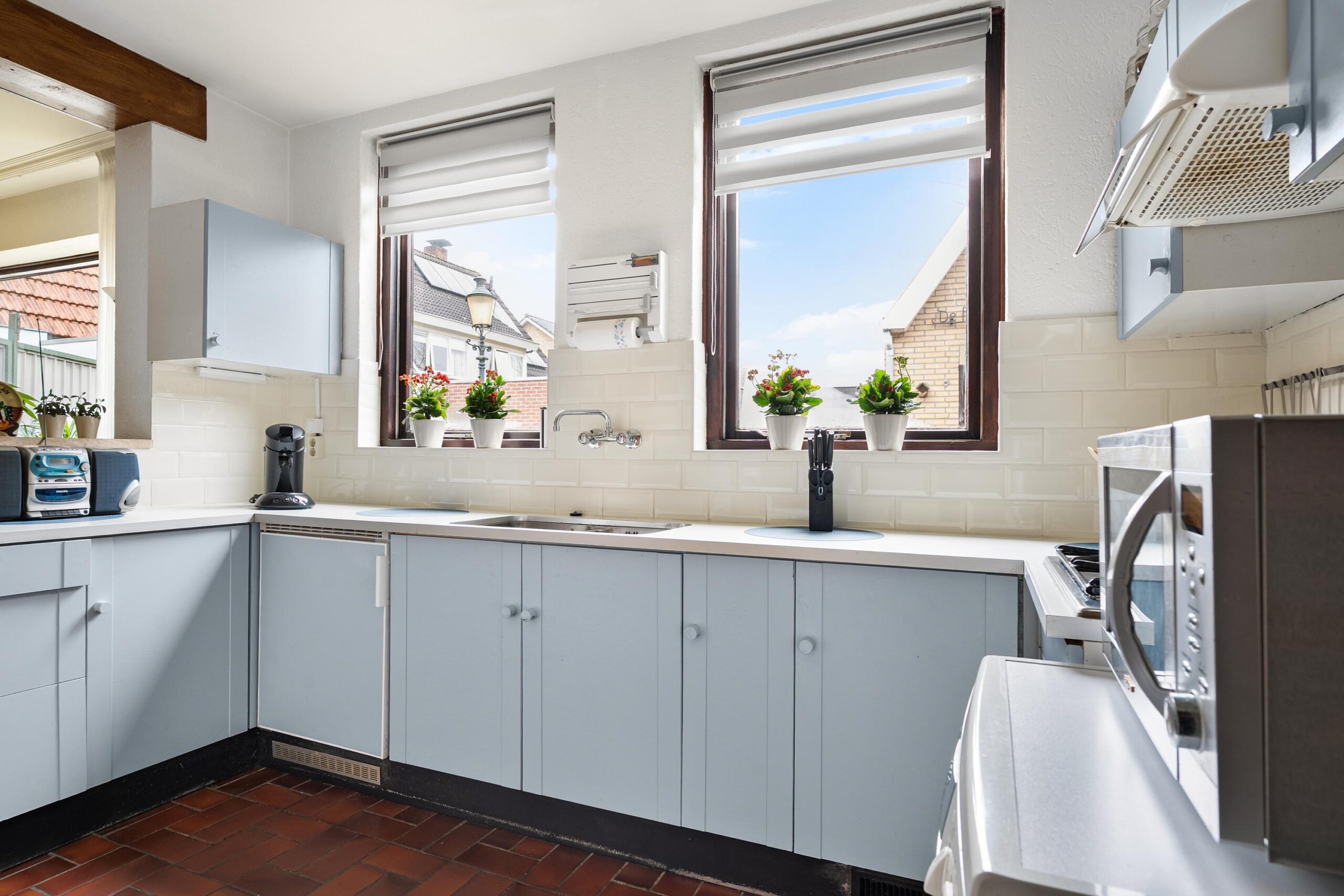 De halfopen keuken ligt aan de achterzijde en kijkt uit over de achtertuin. De keuken is uitgevoerd in een lichte kleurstelling en voorzien van een 4-pits gasfornuis, vaatwasser en losse apparatuur. Dankzij de ramen rondom is er ook hier een prettige lichtinval.