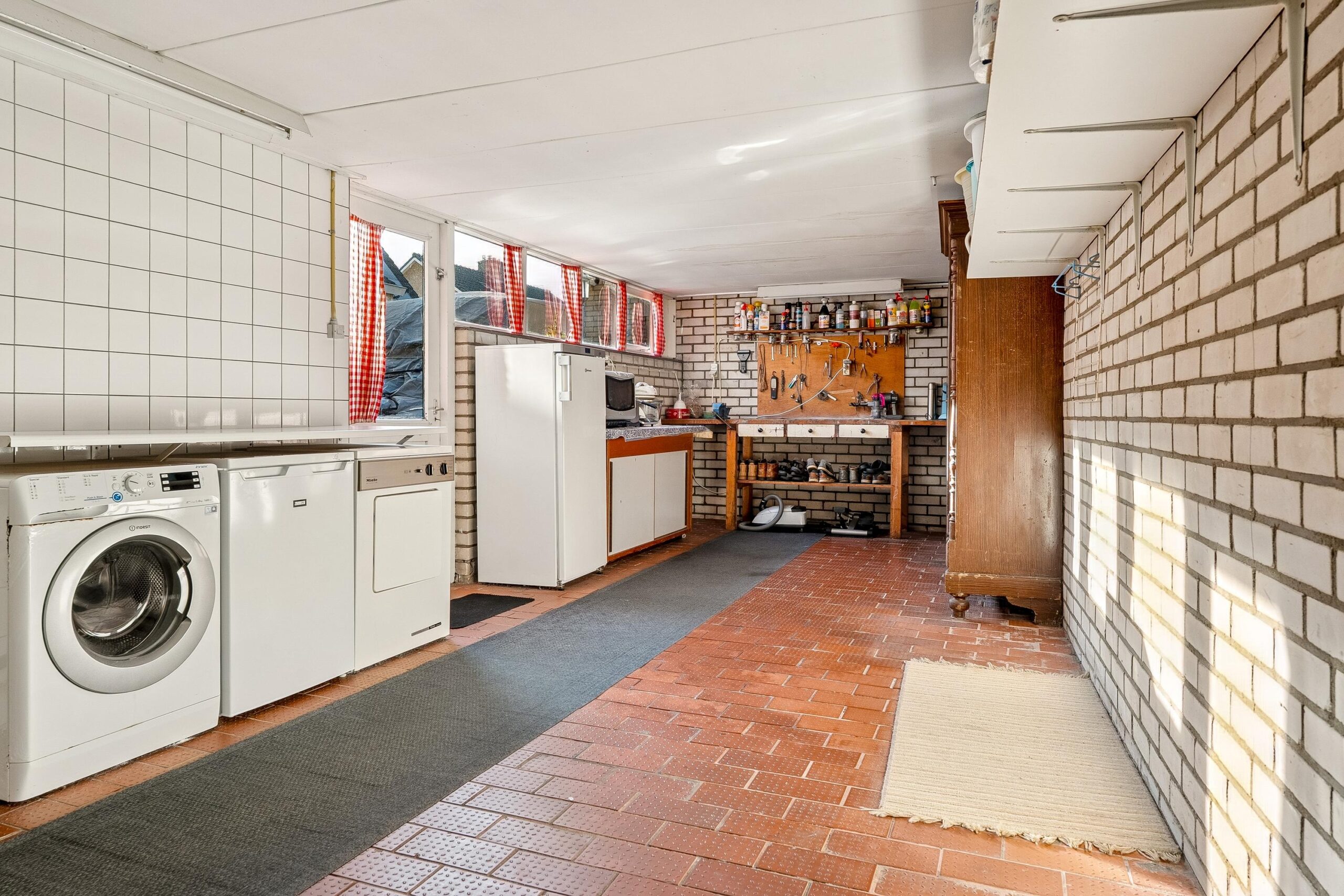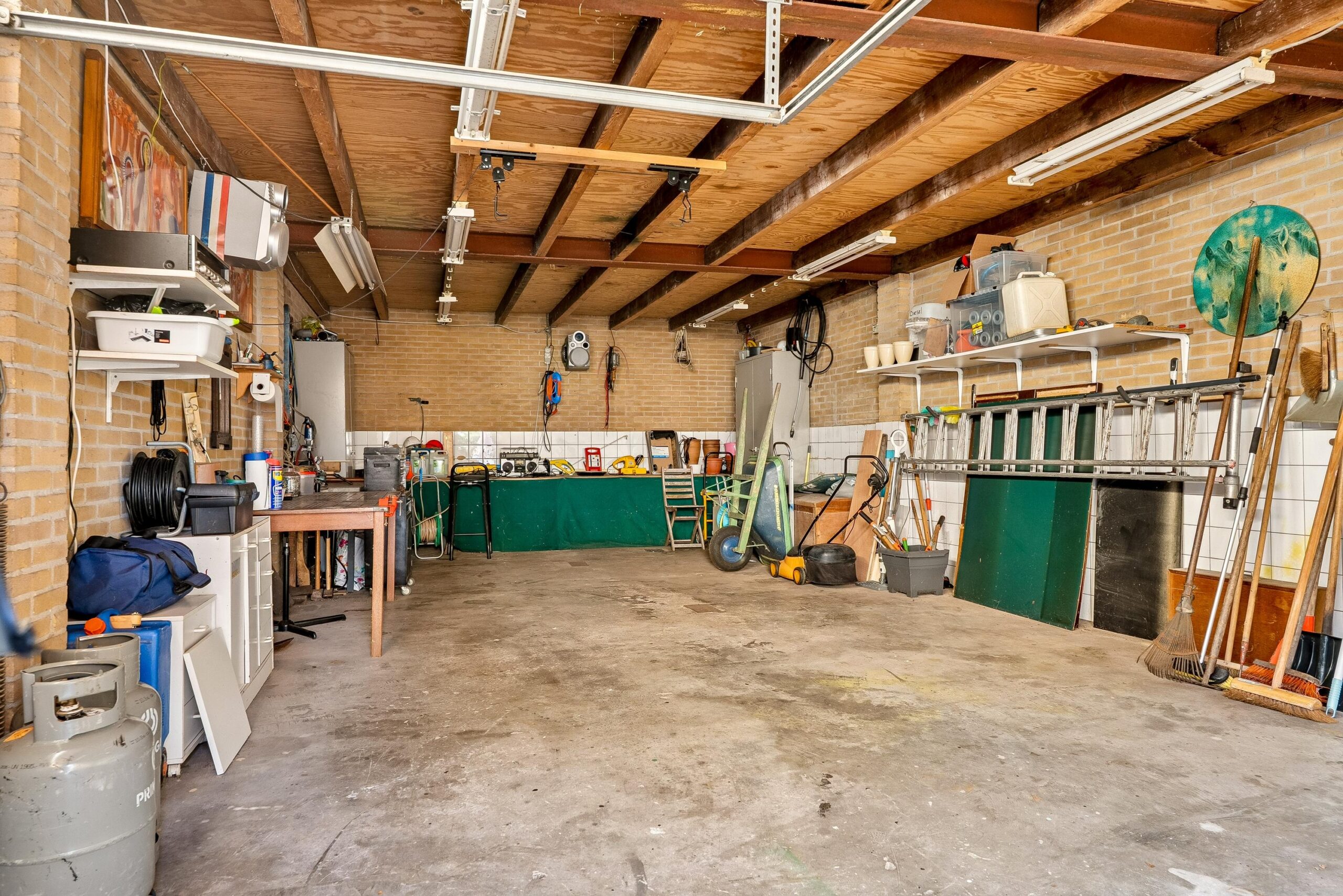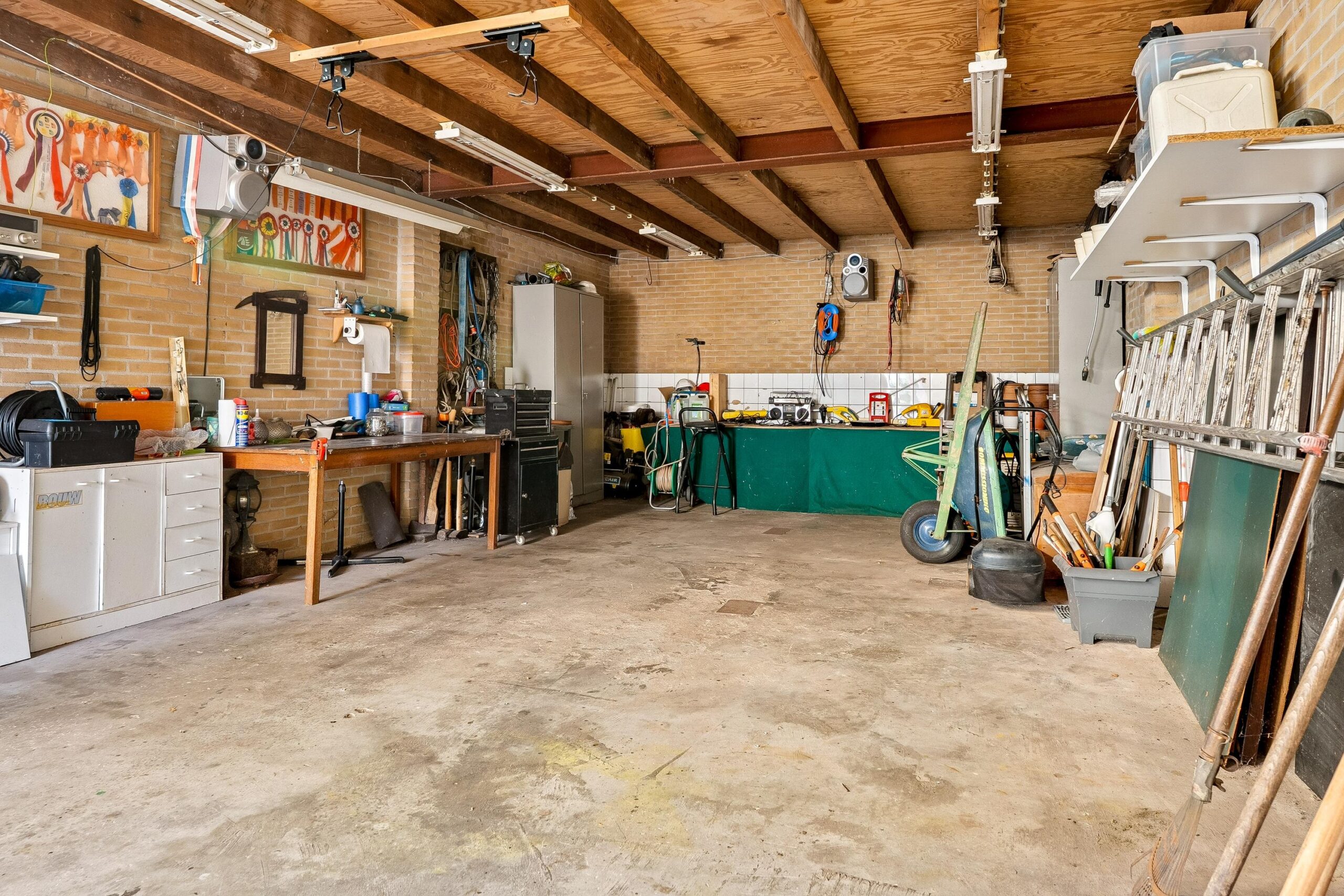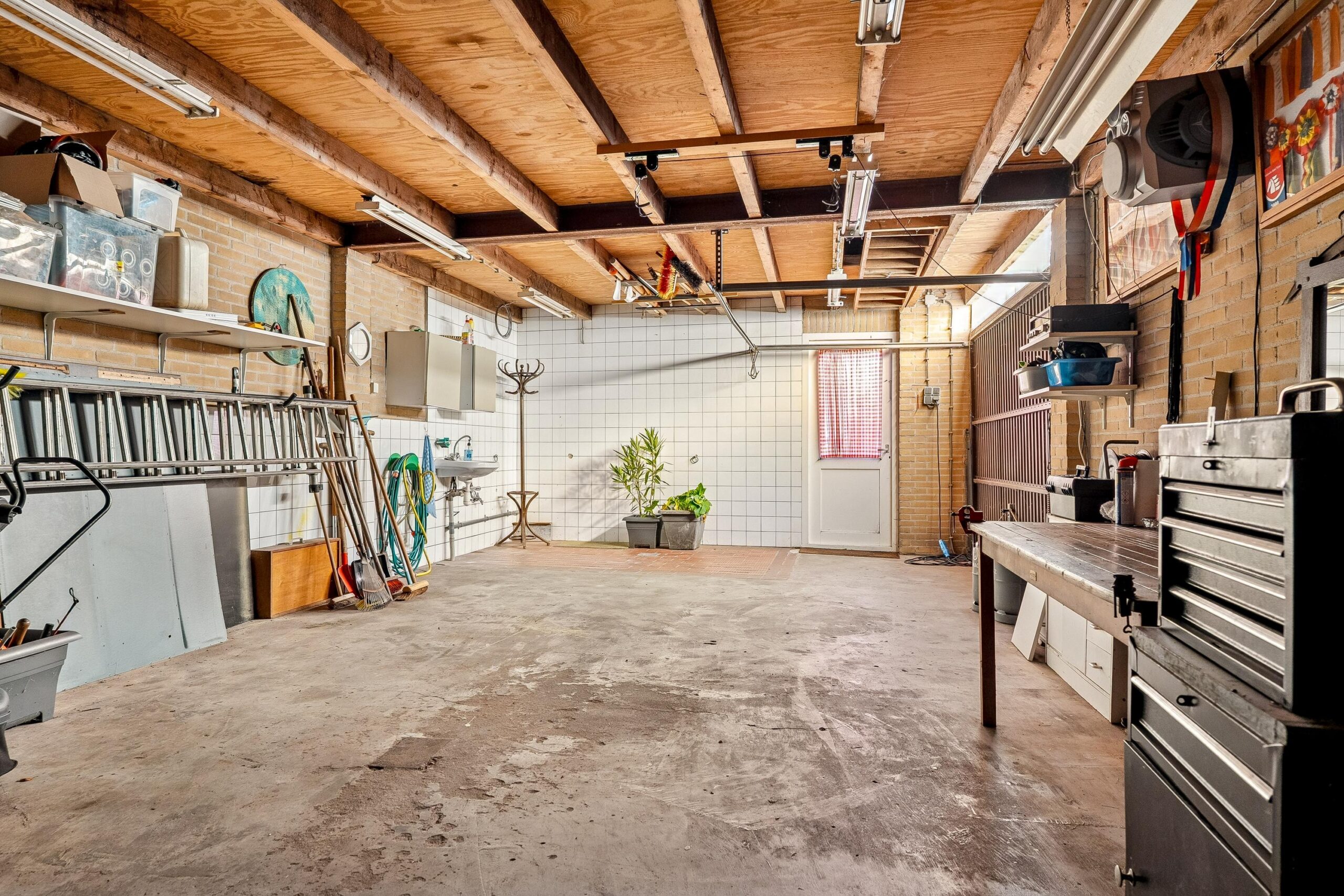 Via de keuken is opnieuw de entreehal bereikbaar. Vanuit hier betreed je ook de aangebouwde stenen garage: een zeer royale, verwarmde ruimte met openslaande deuren naar de oprit. De garage is voorzien van witgoedopstelling, extra wastafel, vaste kastruimte en een praktische werkbank. Ideaal voor hobby, opslag of werk aan huis. Vanuit de garage is er tevens toegang tot de achtertuin.