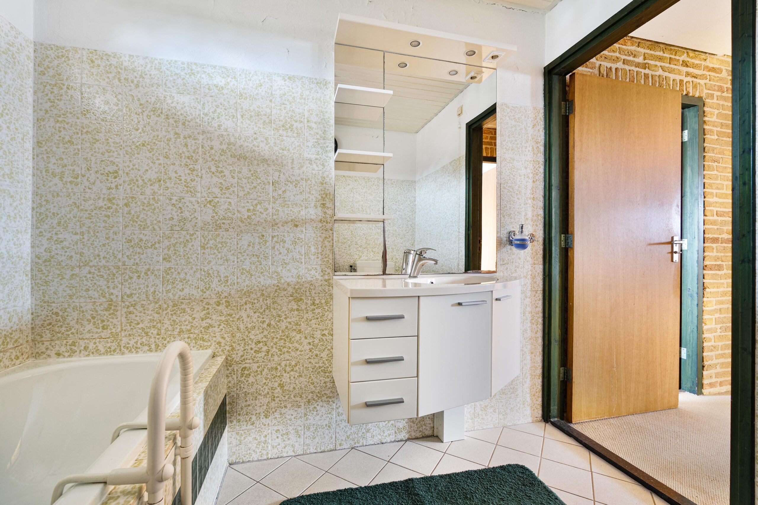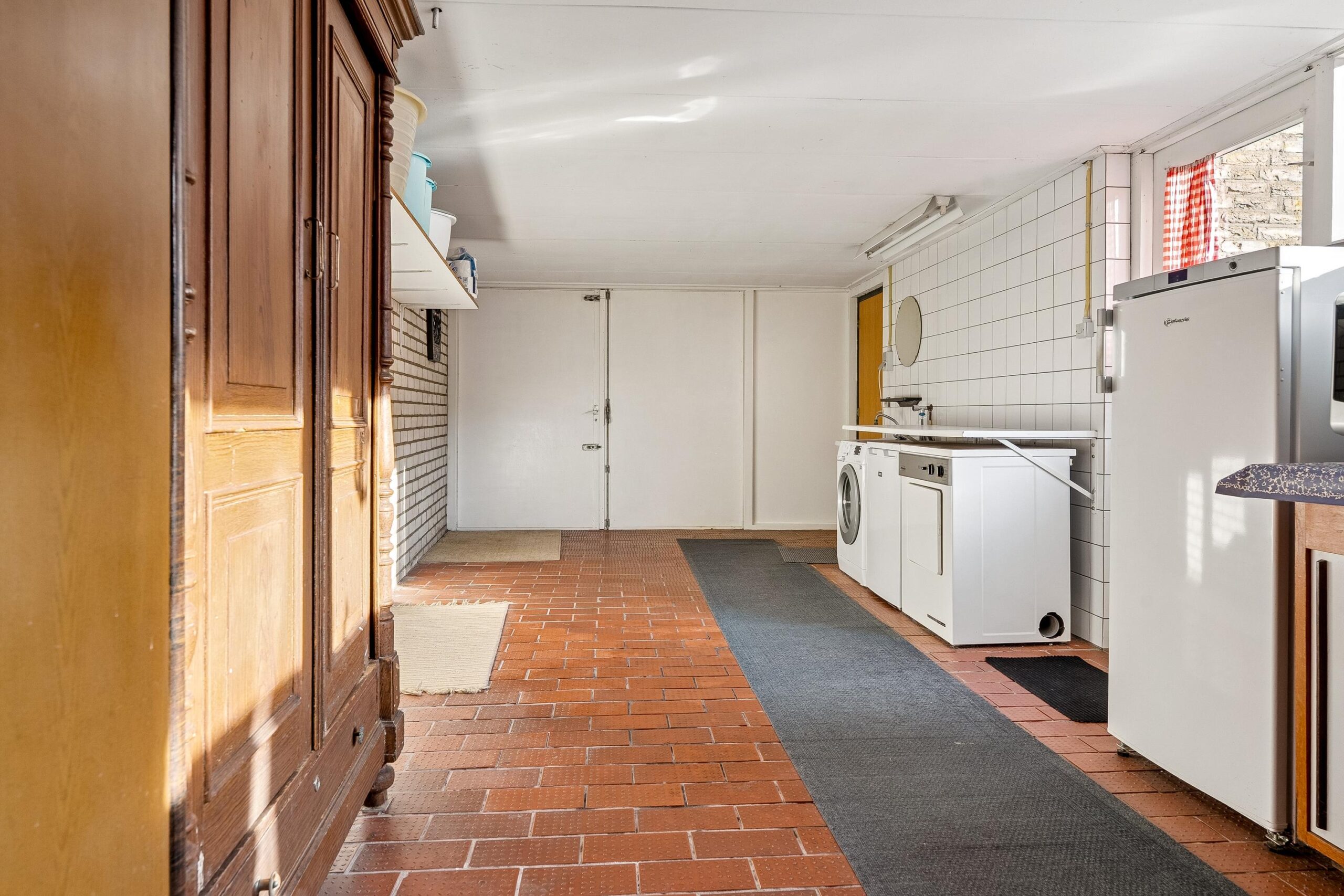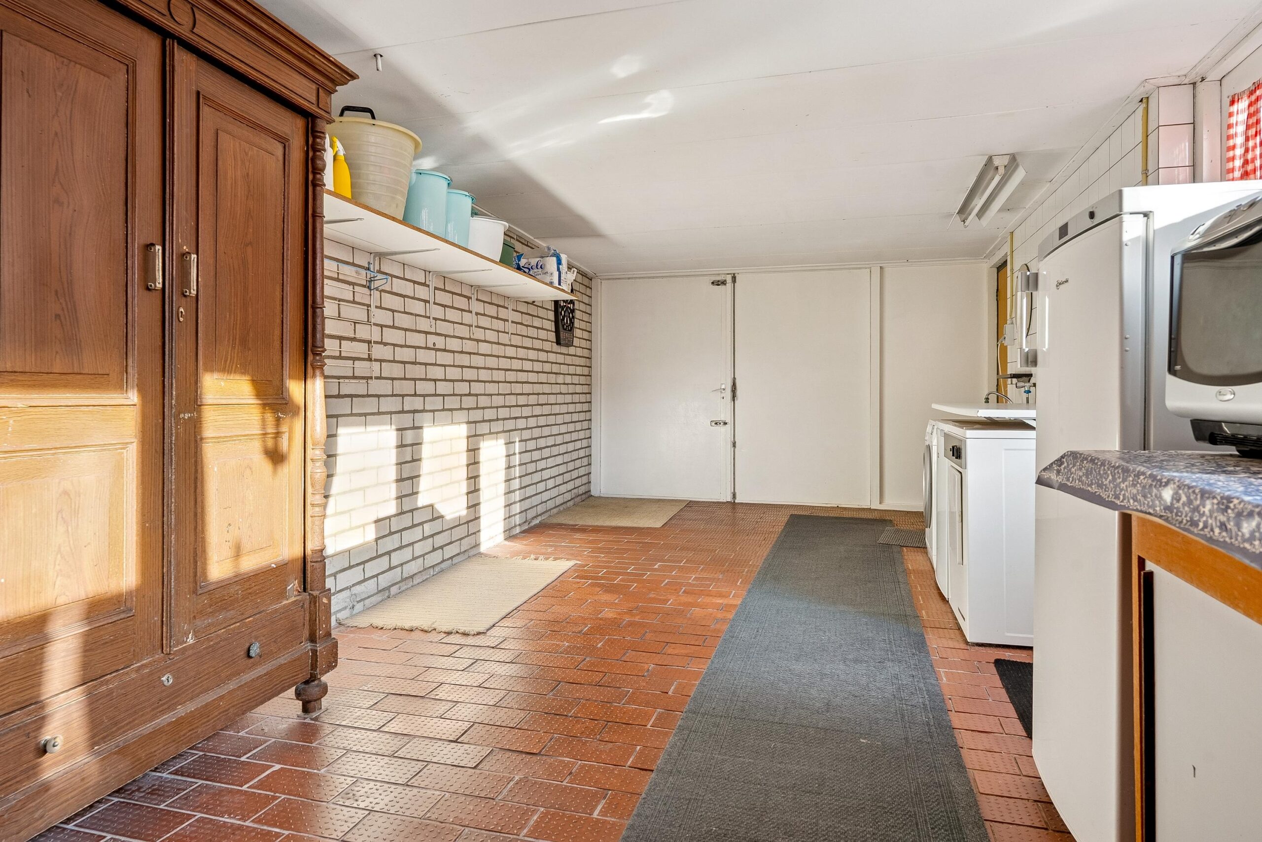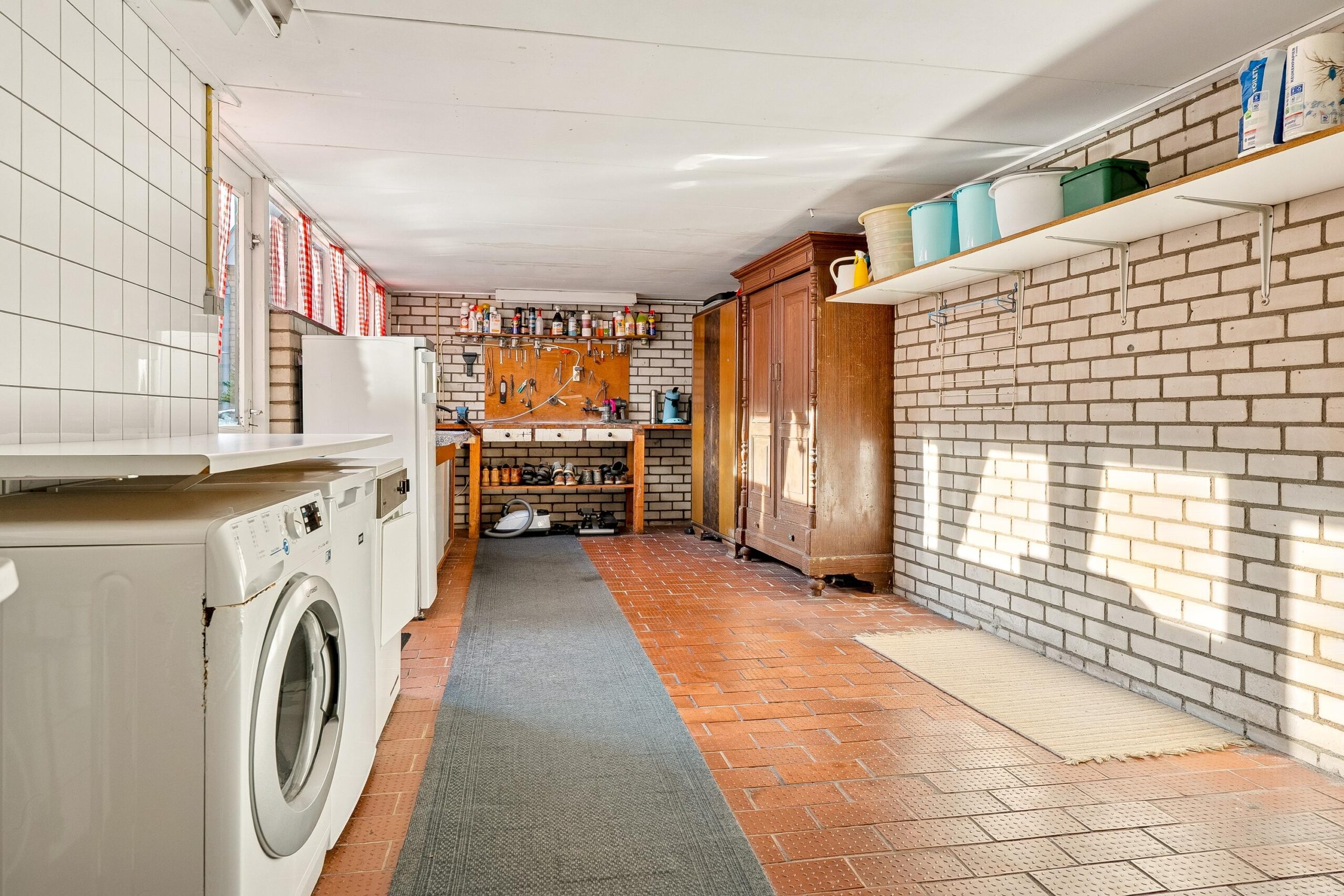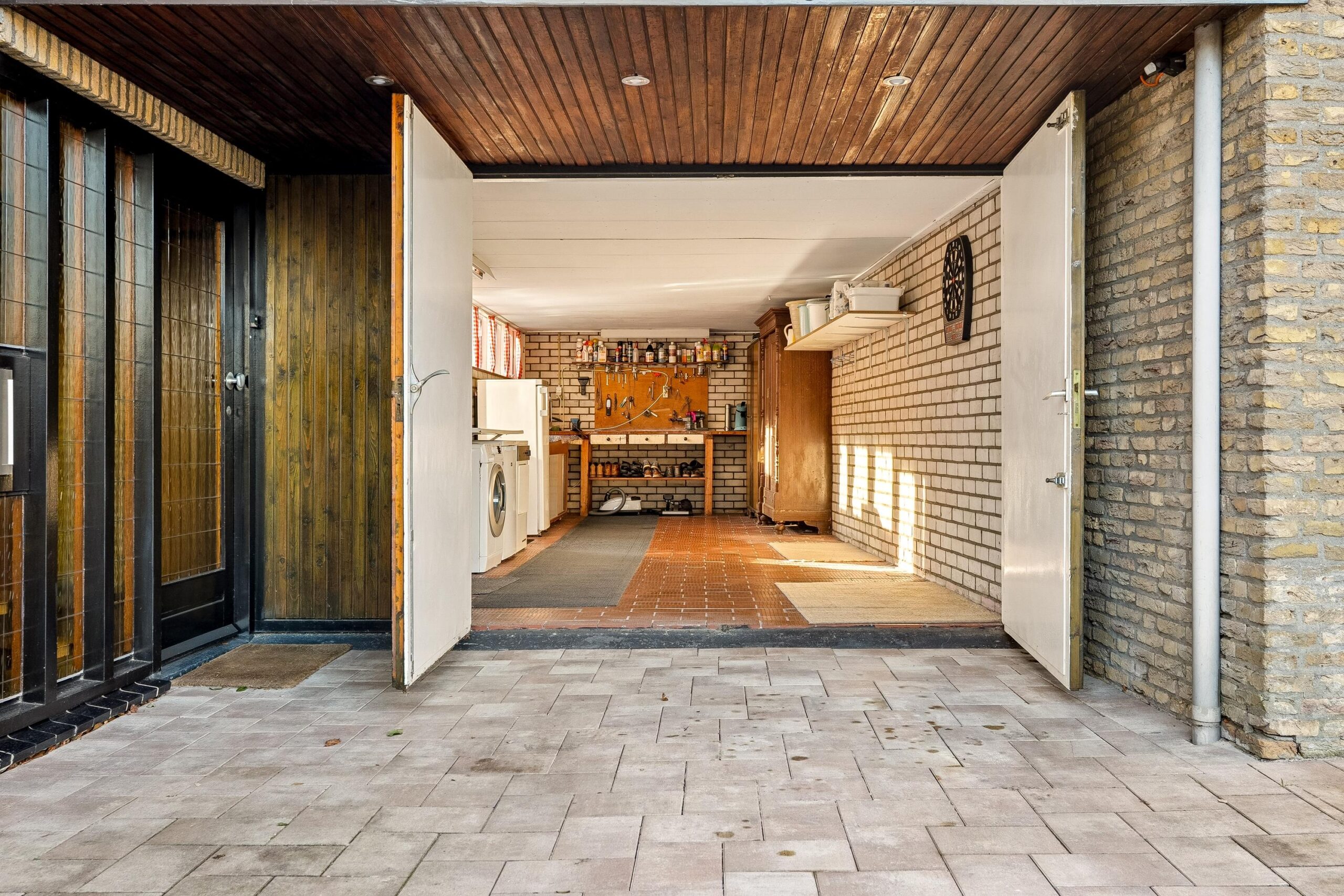 Via de keuken is opnieuw de entreehal bereikbaar. Vanuit hier betreed je ook de aangebouwde stenen garage: een zeer royale, verwarmde ruimte met openslaande deuren naar de oprit. De garage is voorzien van witgoedopstelling, extra wastafel, vaste kastruimte en een praktische werkbank. Ideaal voor hobby, opslag of werk aan huis. Vanuit de garage is er tevens toegang tot de achtertuin.