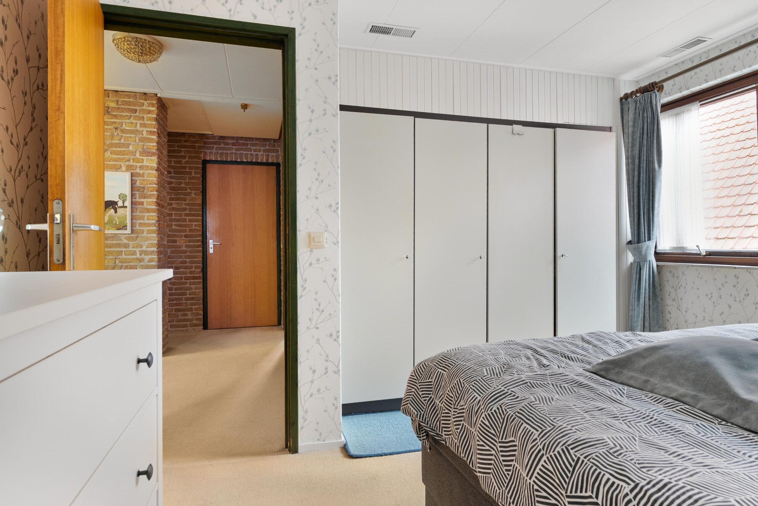Op de eerste verdieping kom je uit op een ruime overloop met toegang tot vier slaapkamers. Ook hier komt het karakter van de woning terug door de bakstenen afwerking.