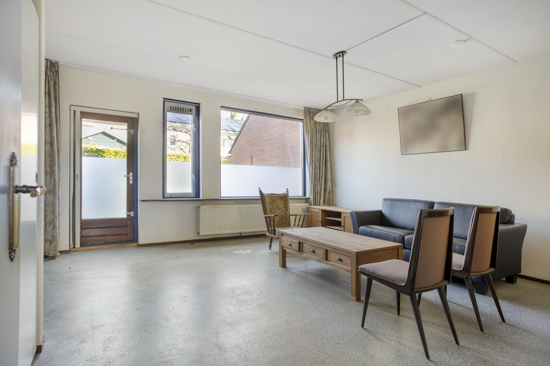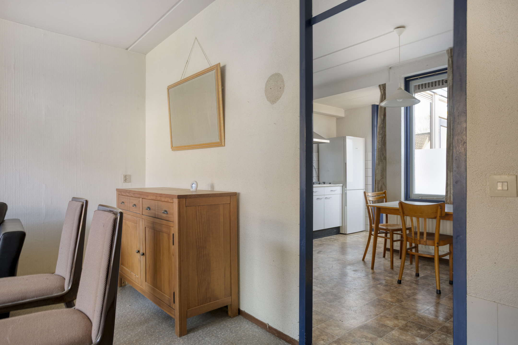 De woonkamer is gelegen aan de achterzijde van de woning en heeft een prettige indeling met voldoende ruimte voor een zit- en eethoek. Dankzij de grote raampartijen aan de tuinzijde is er sprake van een goede daglichttoetreding, wat zorgt voor een lichte leefruimte. Via een enkele tuindeur is de achtertuin bereikbaar. Daarnaast beschikt de woonkamer over een praktische trapkast, ideaal voor het opbergen van voorraad en huishoudelijke spullen.