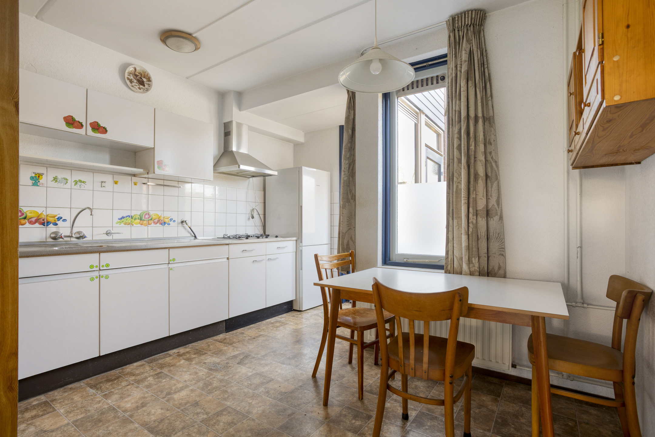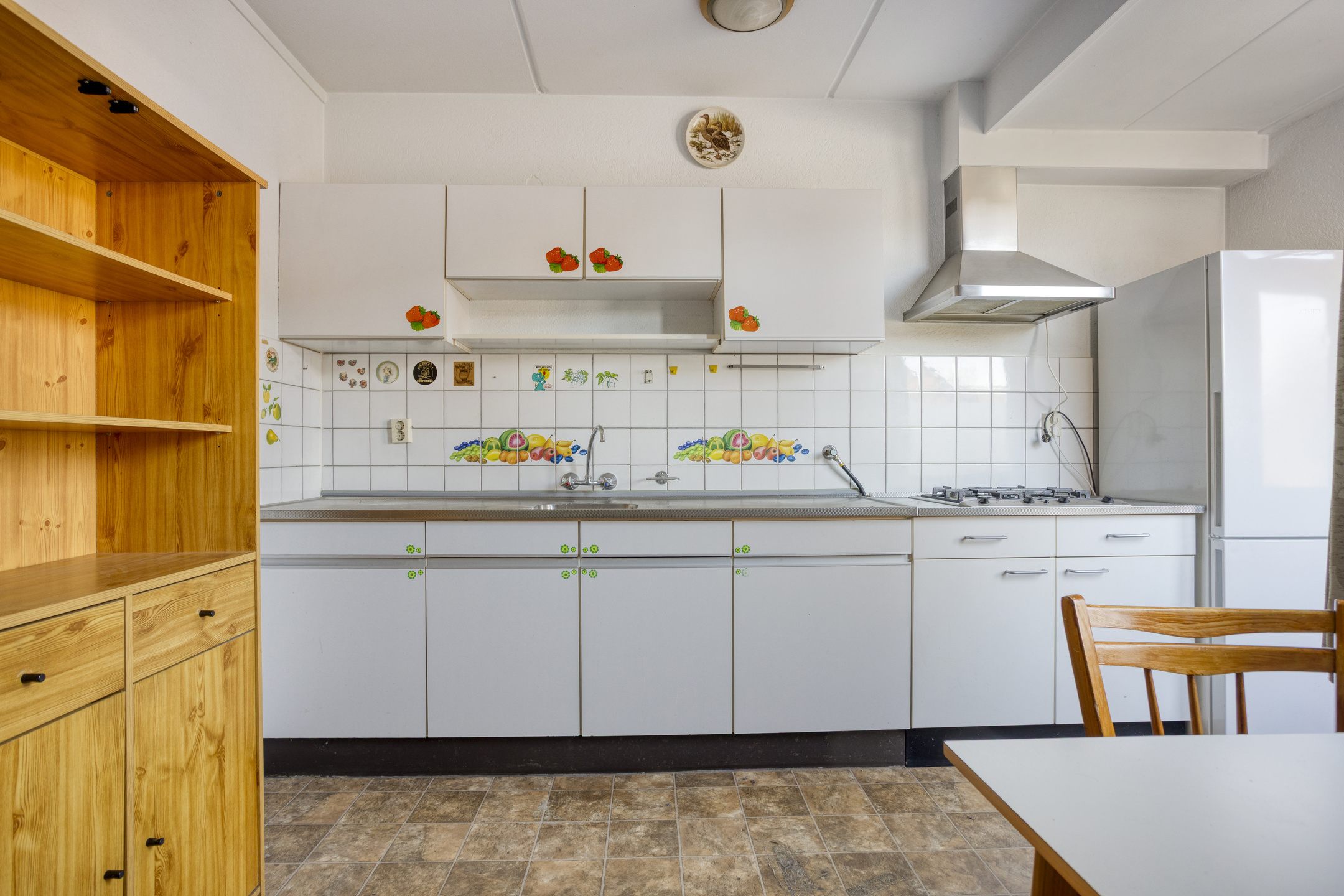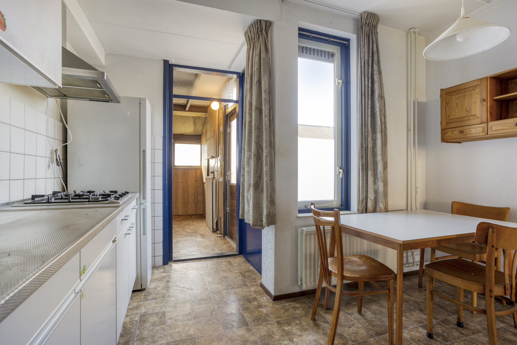 Aan de voorzijde van de woning bevindt zich de dichte keuken met ruimte voor een eettafel. De keuken is uitgevoerd in een rechte opstelling en voorzien van een 4-pits gasfornuis en een afzuigkap. De keuken is functioneel, maar eenvoudig uitgevoerd en biedt mogelijkheden om te moderniseren of aan te passen naar de wensen van deze tijd.