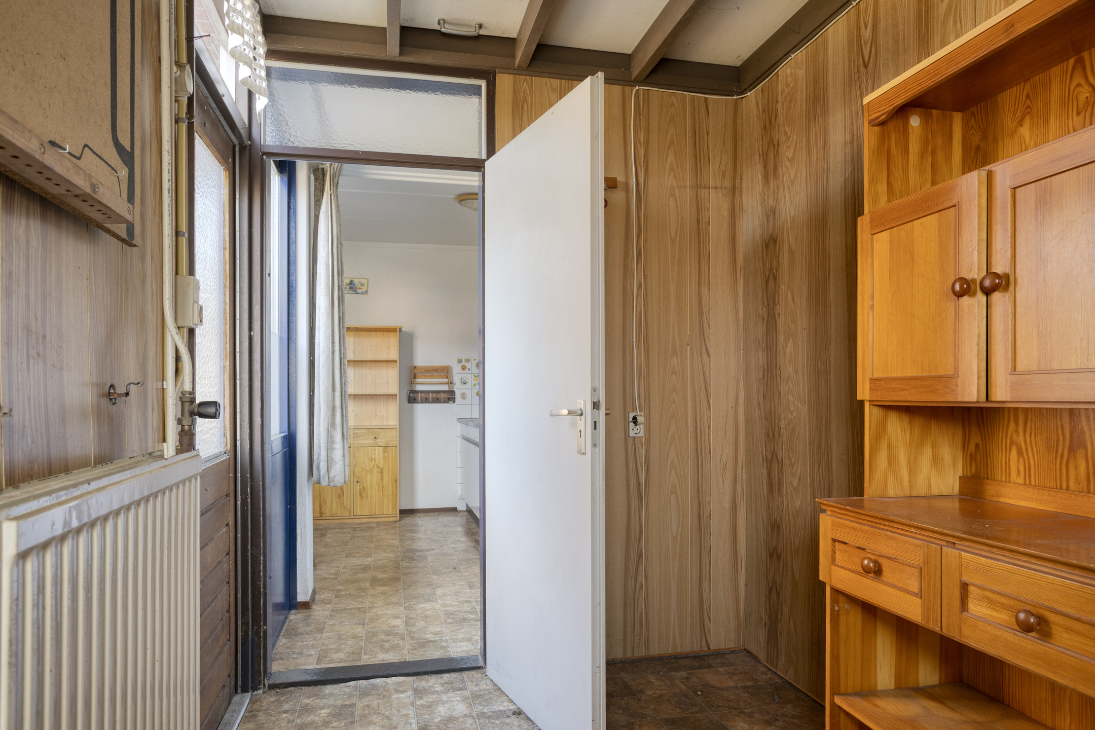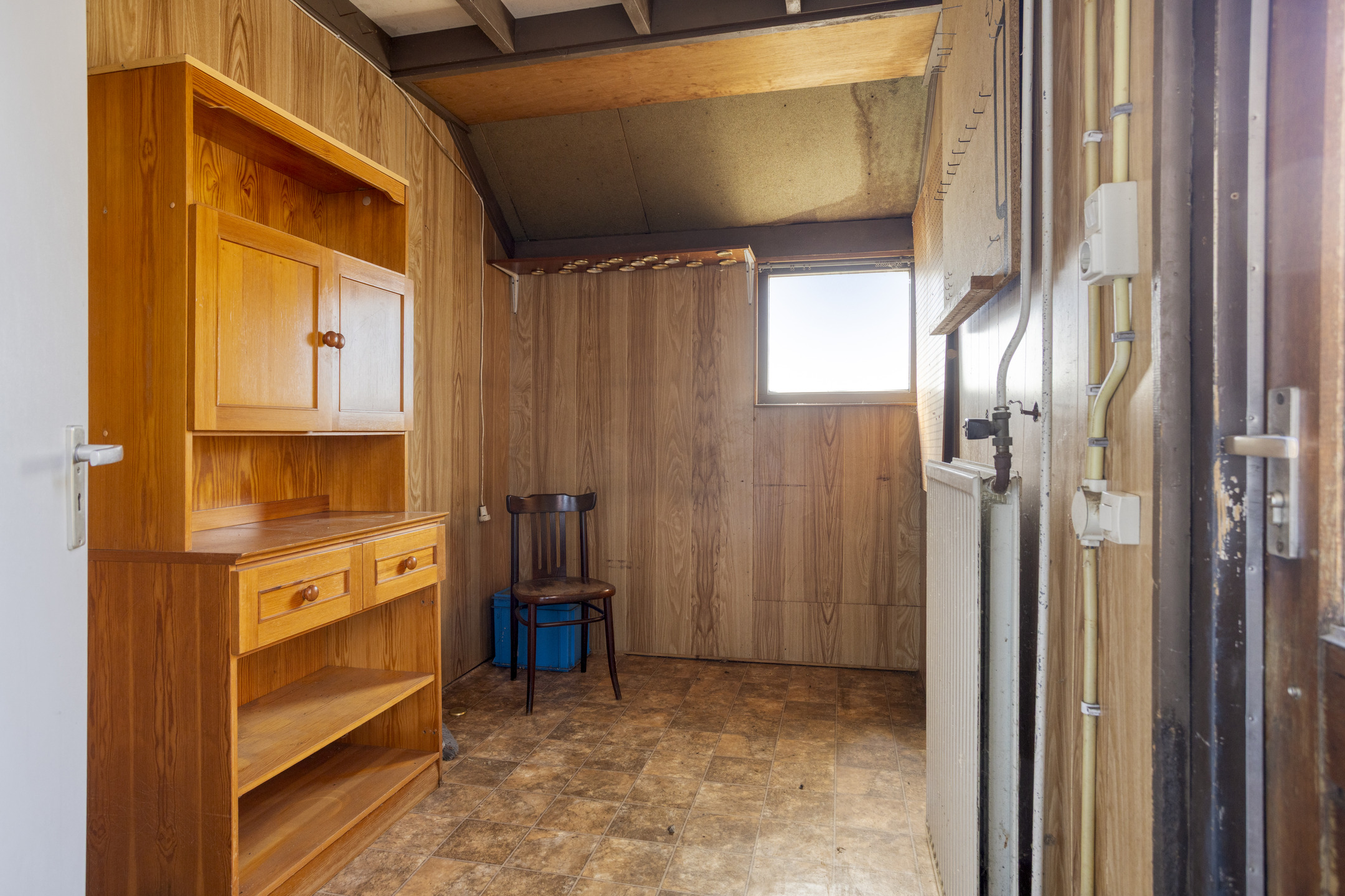 Vanuit de keuken bereik je de aangebouwde berging. Deze ruimte is voorzien van elektra, verwarming en een handige vliering, en beschikt daarnaast over een deur naar de voortuin. De berging is daarmee een praktische toevoeging voor opslag, hobby of het stallen van fietsen.
