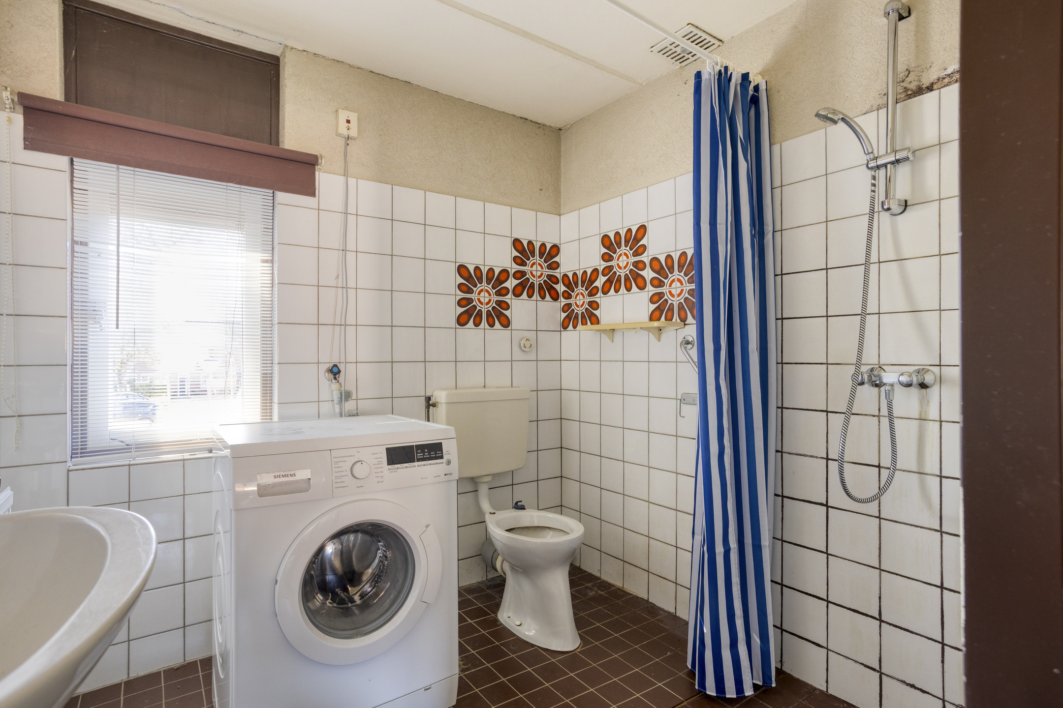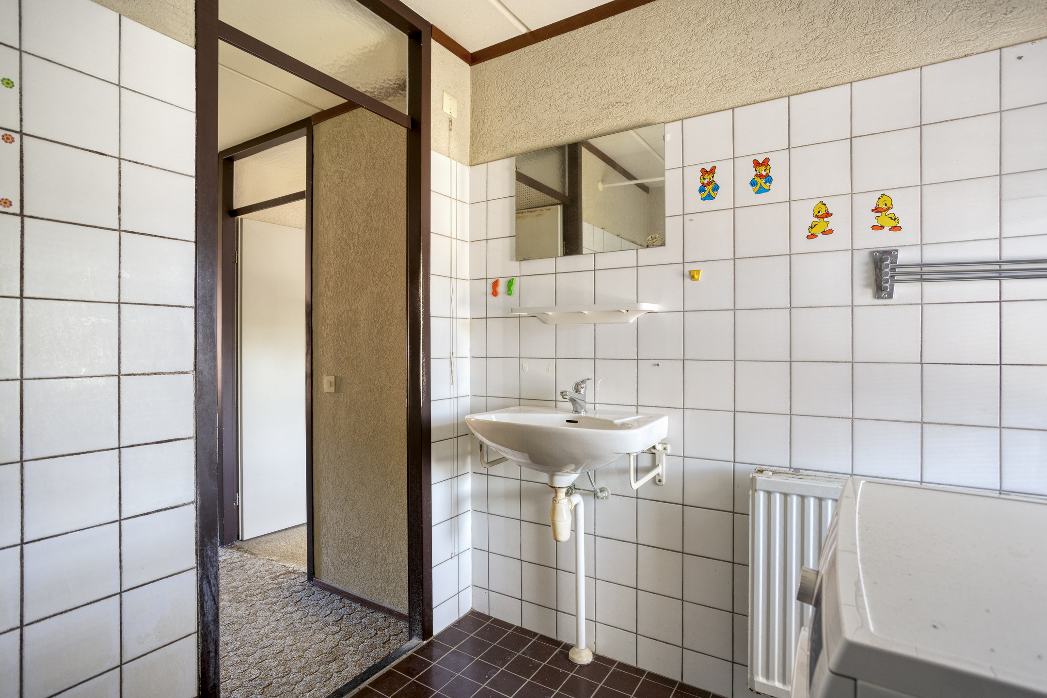 De badkamer is volledig betegeld en voorzien van een douche, toilet, wastafel en wasmachineaansluiting. De afwerking is gedateerd en vraagt om vernieuwing, maar de indeling is praktisch.