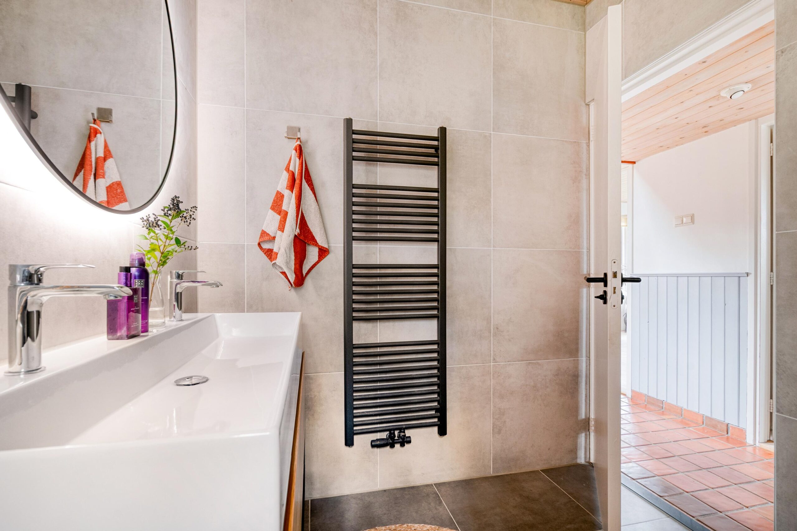 Via de entree met veel daglicht doormiddel van een royaal dakraam kom je binnen in de gezellige hal, met meterkast en een moderne toiletruimte met wandcloset, fontein en designradiator. De uitgebouwde woonkamer is licht en ruim, met een fraaie parketvloer, schuifpui naar het terras en een rookkanaal geschikt voor een houtkachel. De ramen in de uitbouw zijn voorzien van elektrische rolluiken, voor extra comfort en privacy.
